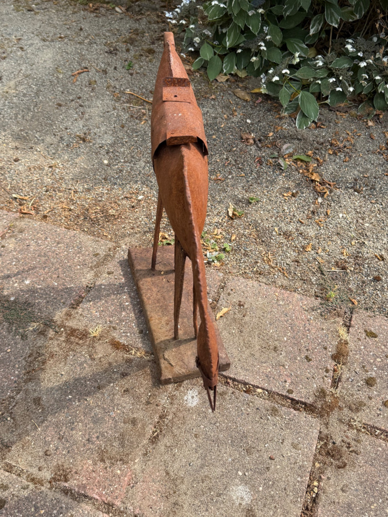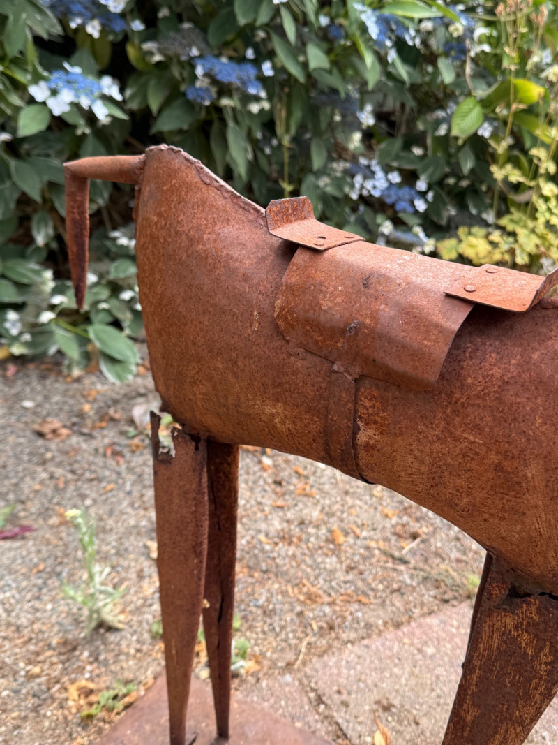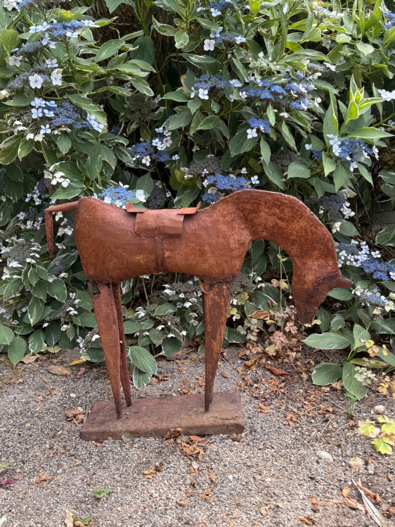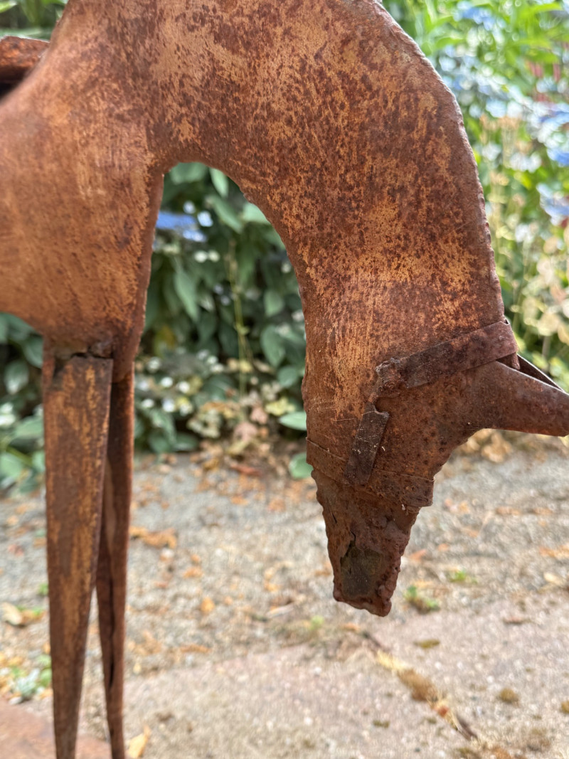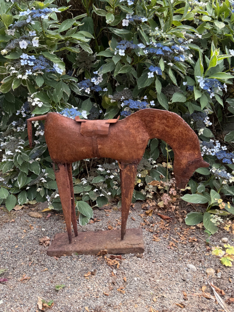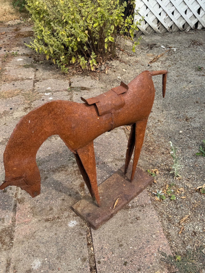 Vintage Folk Art Primitive Metal Horse Sculpture – Rustic Patina – Mid-Century Style This striking folk art metal horse sculpture captures the essence of primitive design with its hand-cut, minimalist form and natural rusted patina. Likely crafted in the mid-20th century or earlier, it’s a beautiful example of outsider art or American vernacular sculpture, often made by self-taught artists using repurposed materials. The horse features exaggerated proportions—elongated legs and a bowed head—evoking both strength and humility. The rustic base and saddle detail add character, while the natural corrosion speaks to decades of age and outdoor exposure. Details: Style: Primitive / Folk Art / Outsider Art Material: Hand-welded iron or steel with natural rust patina Estimated Era: Mid-century or earlier Dimensions: Approx. 18–22” tall, 14–18” wide Condition: Excellent patinated condition for age; solid and stable, with surface rust as expected Why It’s Special: