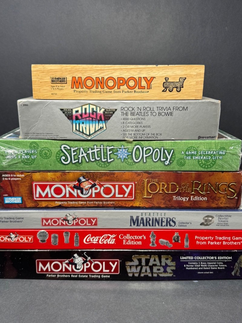 Vintage & Collector’s Board Game Bundle – Monopoly Editions + More A curated stack of iconic board games perfect for collectors, players, and pop culture enthusiasts. This lot includes 7 unique games, spanning themes from music to movies and regional nostalgia: Monopoly (Wood Box Edition) – Parker Brothers – Classic game with elegant wooden packaging. Rock Trivia – Pressman – Rock ’n’ roll trivia spanning The Beatles to Bowie. Includes 4,000 questions across 8 categories. Seattle-Opoly – Late 1990s–2000s – A regional twist on Monopoly, celebrating Emerald City landmarks and quirks. Monopoly: Lord of the Rings Trilogy Edition – Parker Brothers – Includes movie-themed locations and custom tokens. Monopoly: Seattle Mariners Collector’s Edition – Includes collectible pewter tokens and team references. Monopoly: Coca-Cola Collector’s Edition – Parker Brothers – Featuring iconic Coke branding and themed game pieces. Monopoly: Star Wars Limited Collector’s Edition – Features pewter Star Wars tokens, galactic currency, and a themed board. Era: Mostly late 1990s–2000s