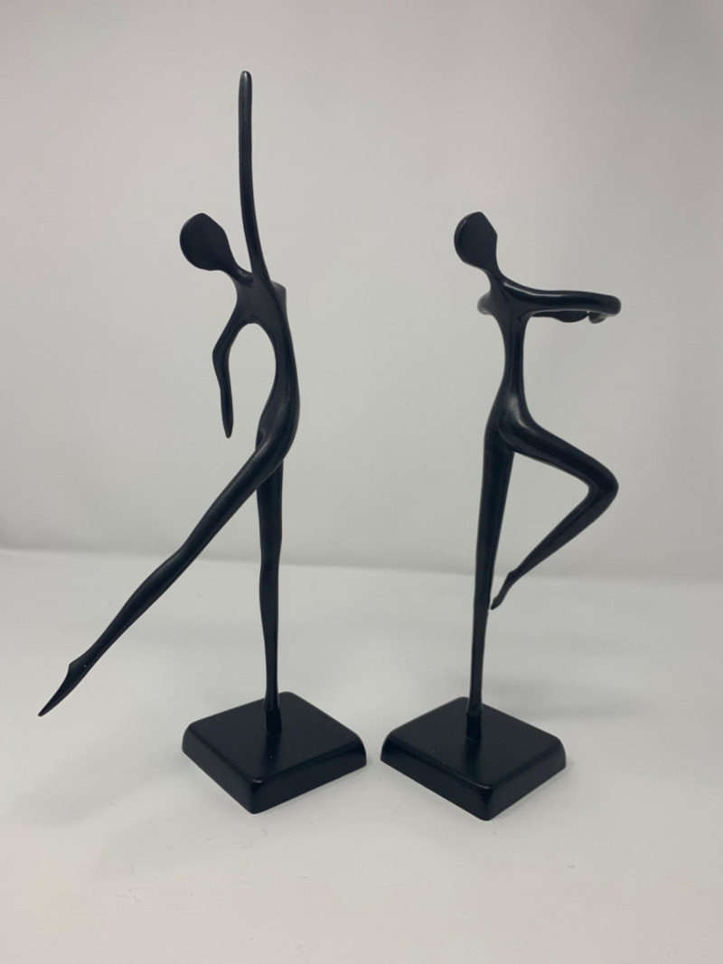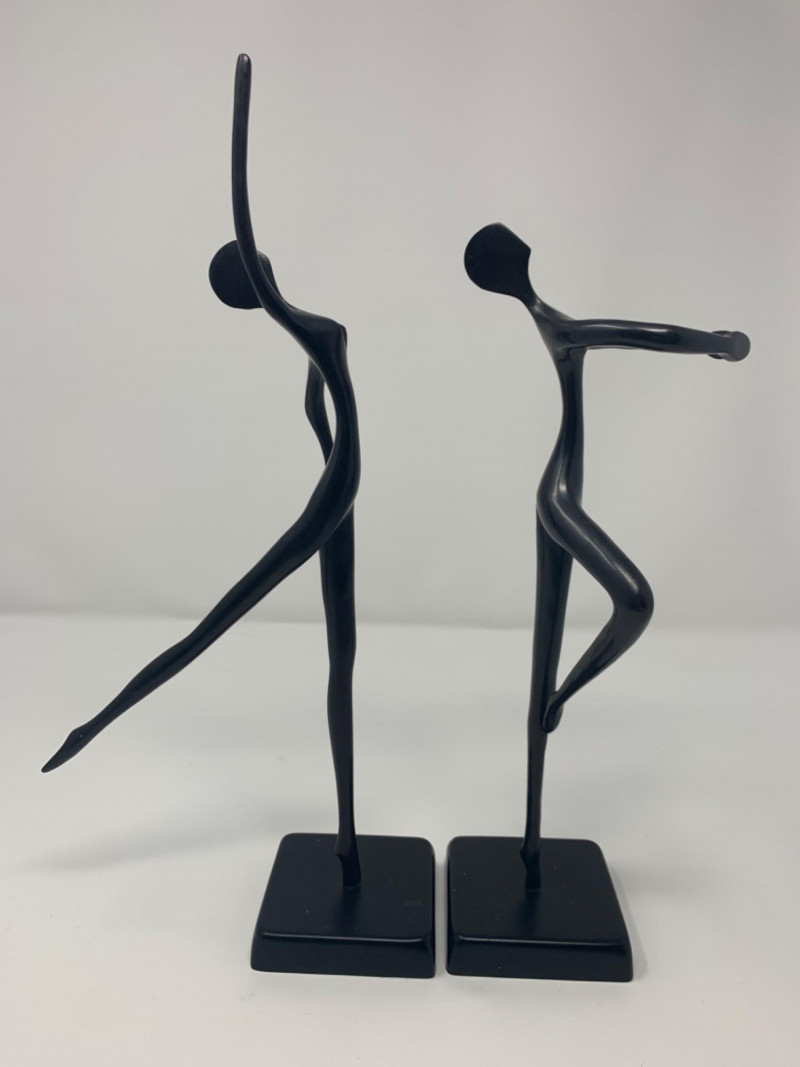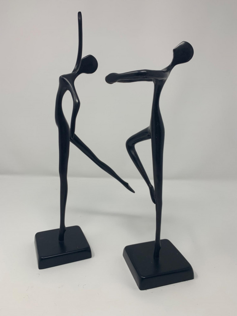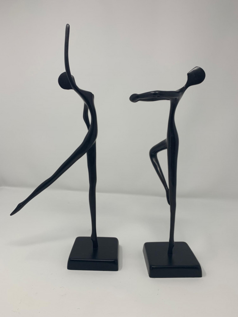 Two bronze black painted sculptures by Artist Bodrul Khalique, a colleague and British contemporary designer for IKEA. These ballet dancers were marketed around 2000 and still collectable.