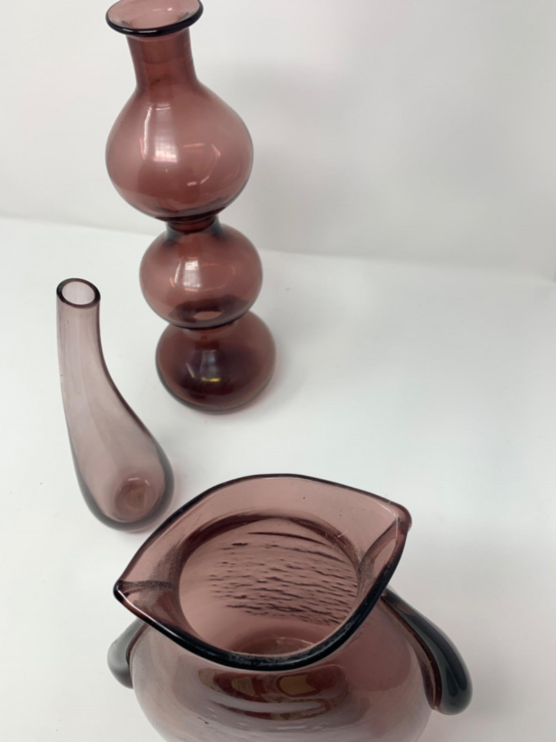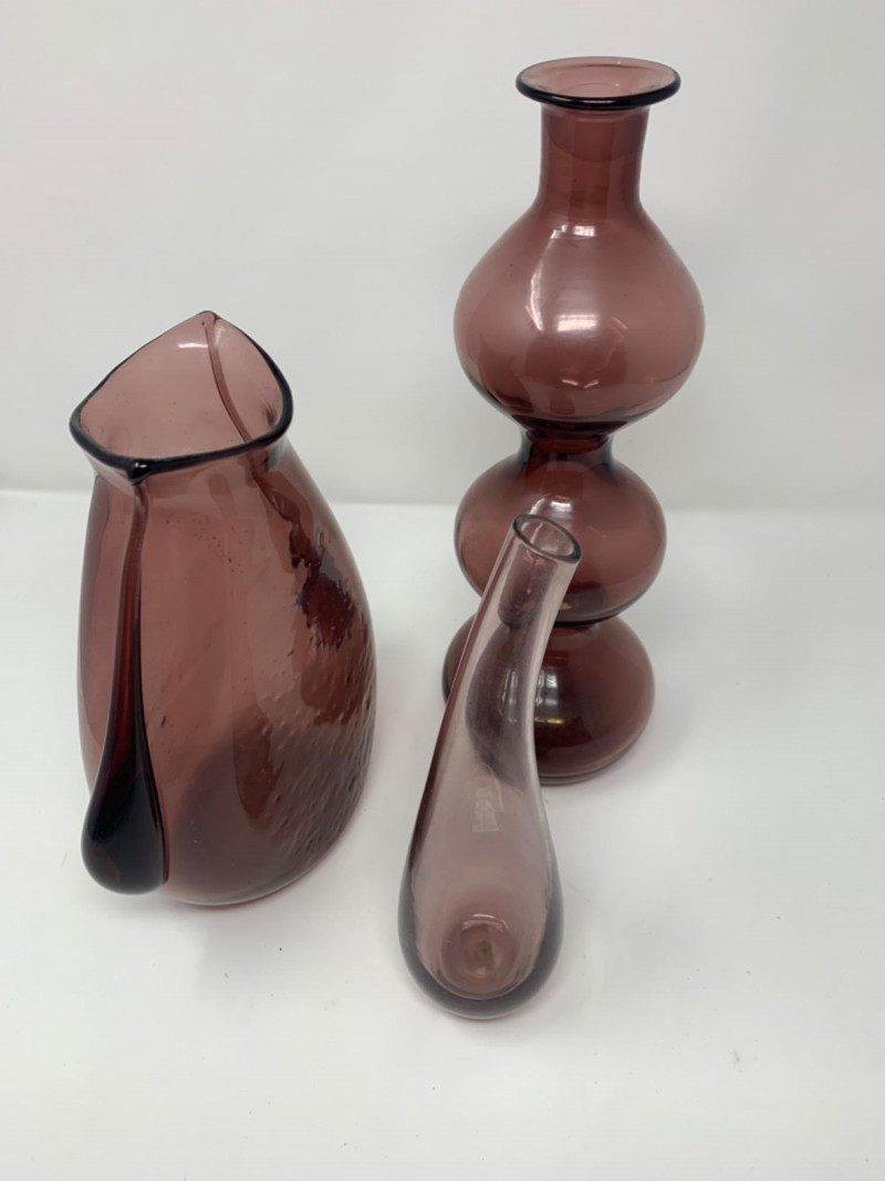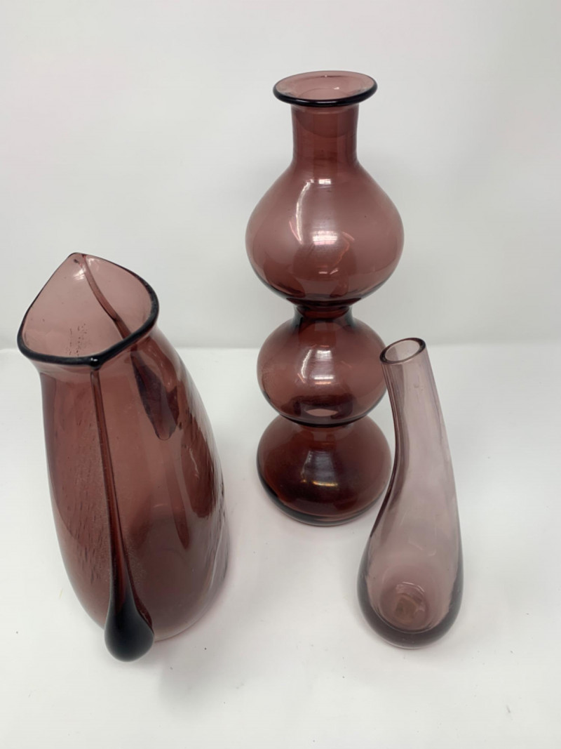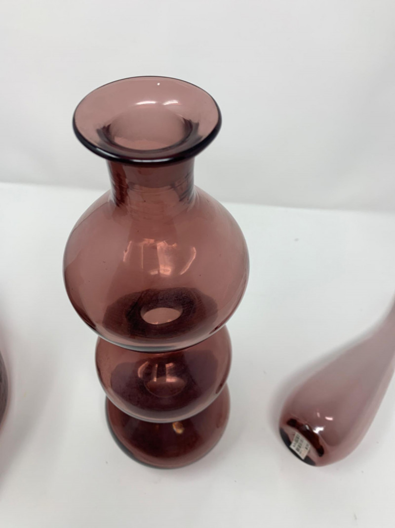 Purple Glass Hand Blown lot of three vases. One has a lid. Perfect condition.