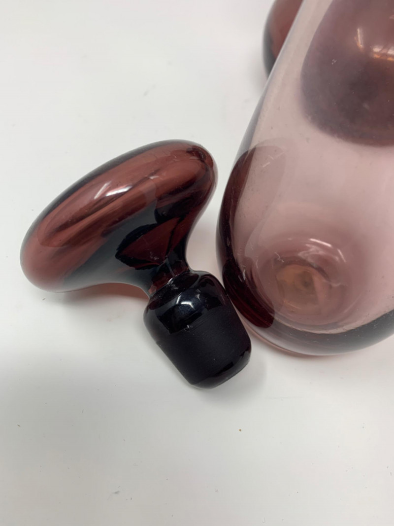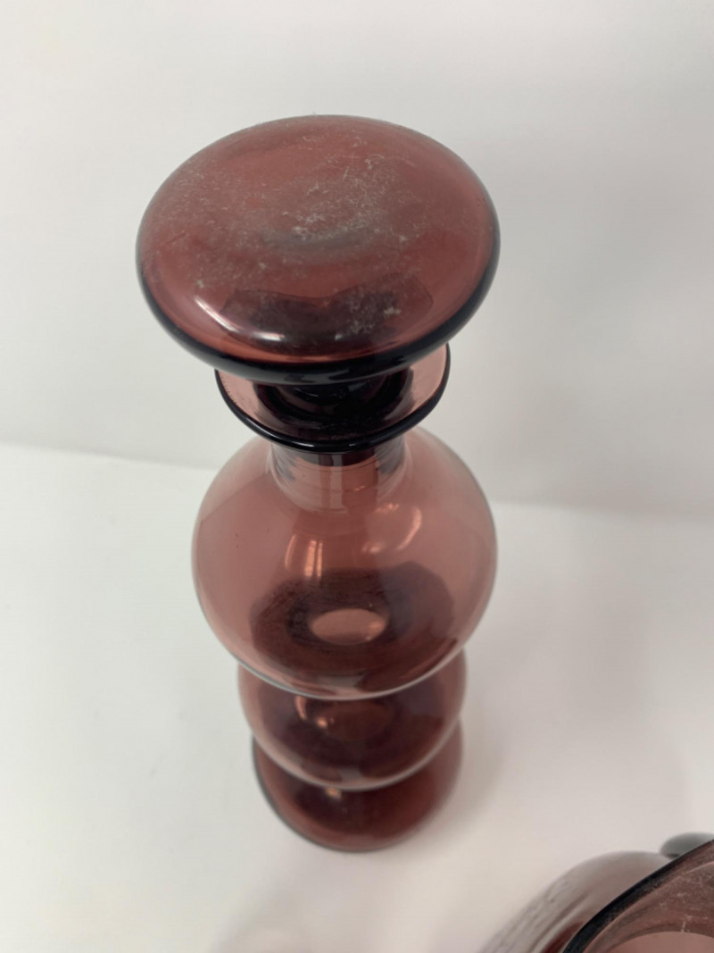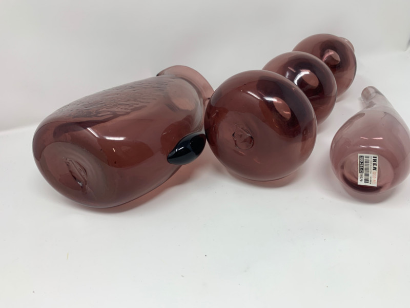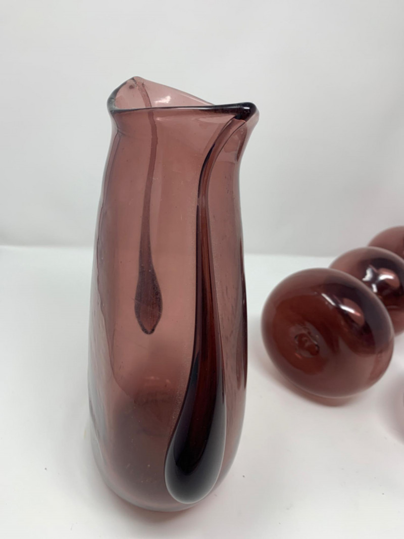Purple Glass Hand Blown lot of three vases. One has a lid. Perfect condition.