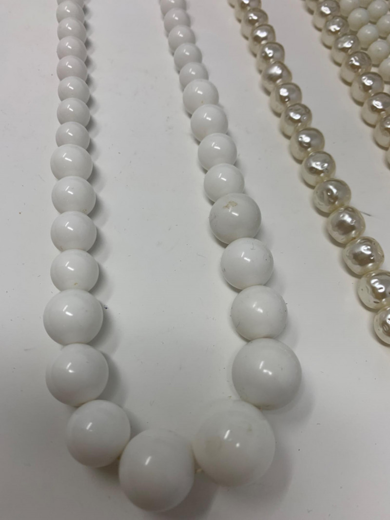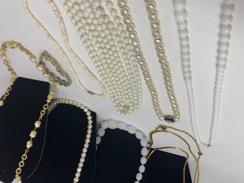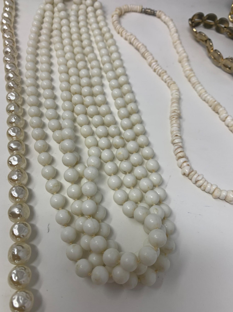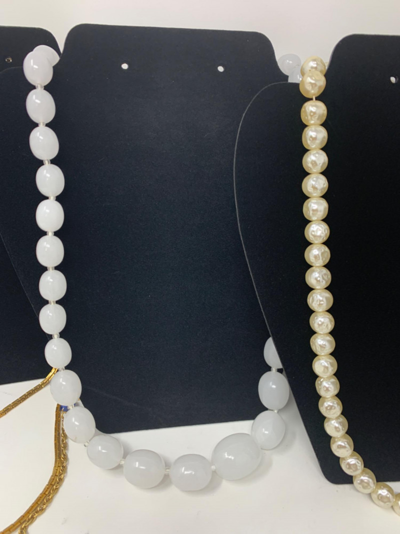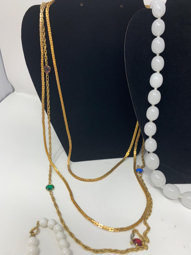 Various sizes of costume, jewelry, gold & whites chains and beads.