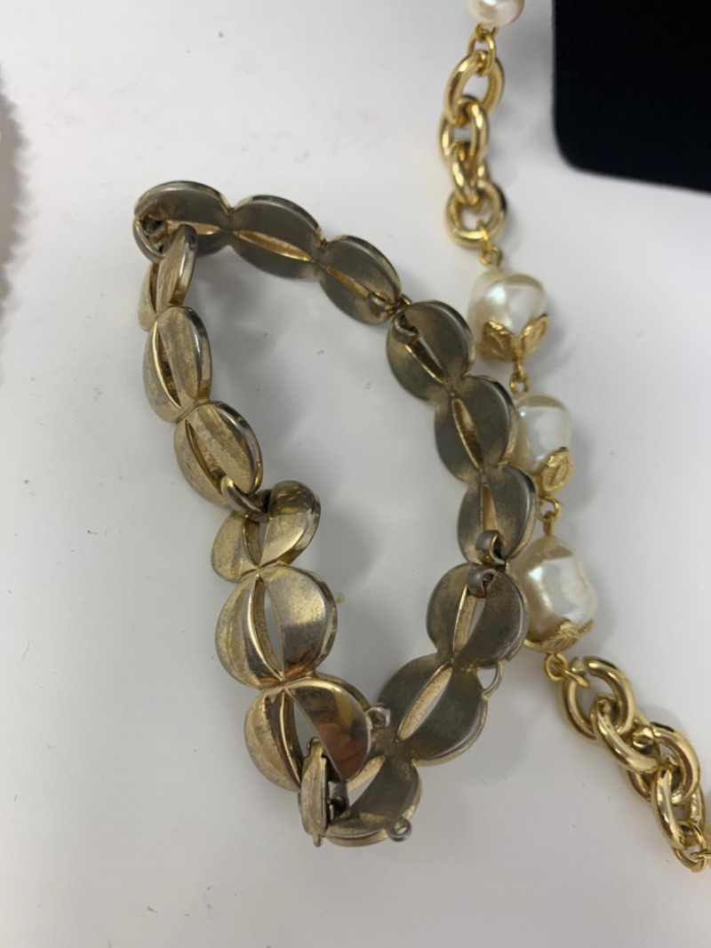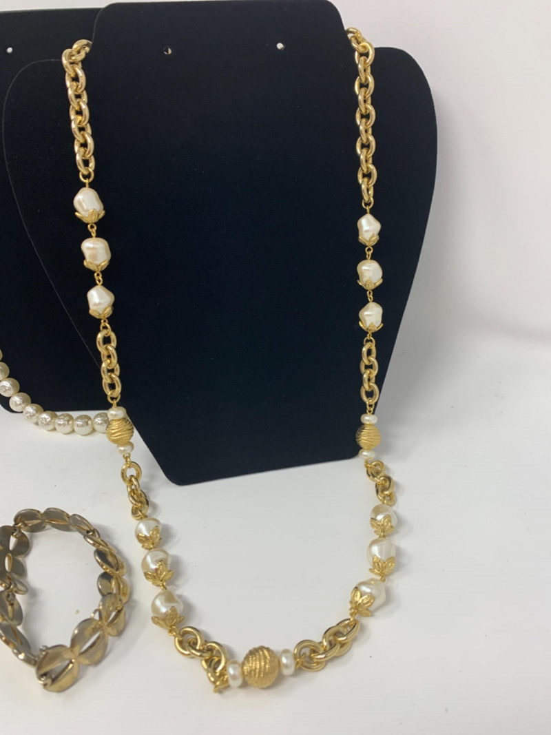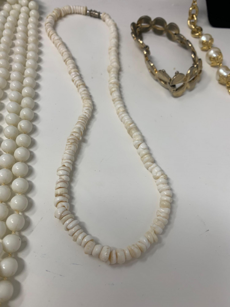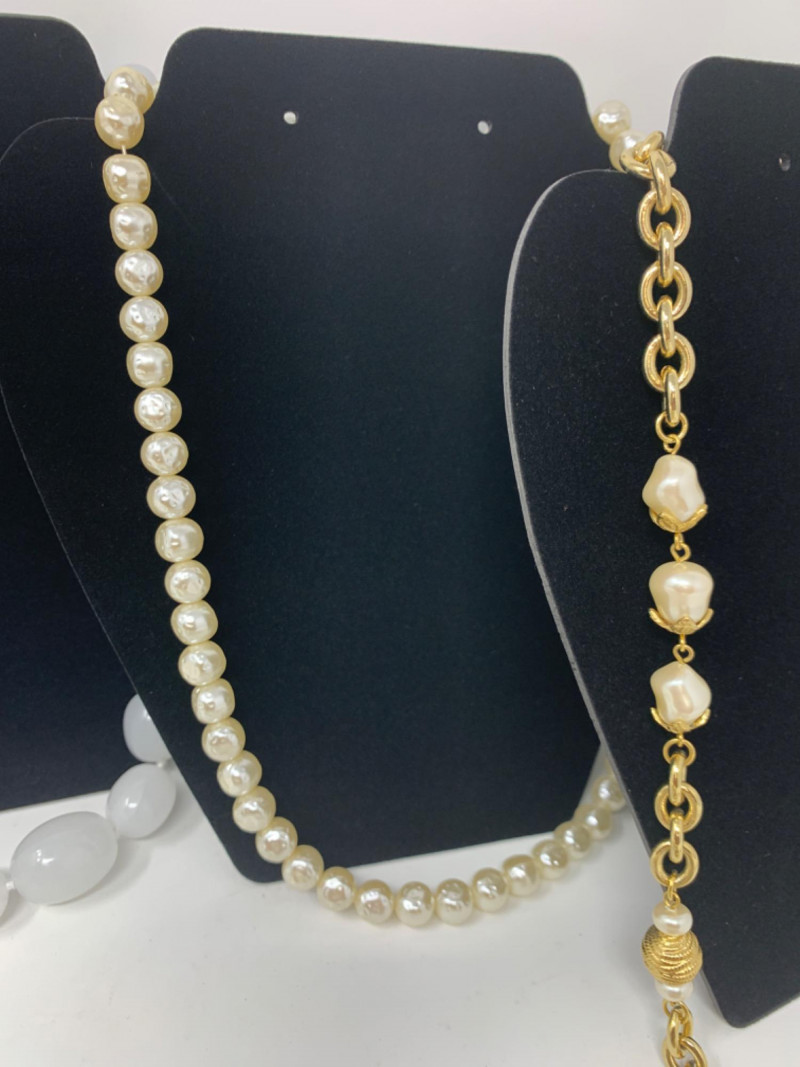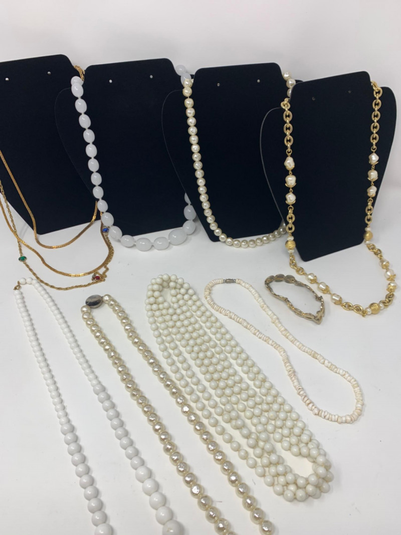 Various sizes of costume, jewelry, gold & whites chains and beads.