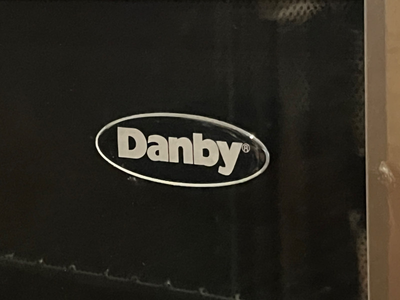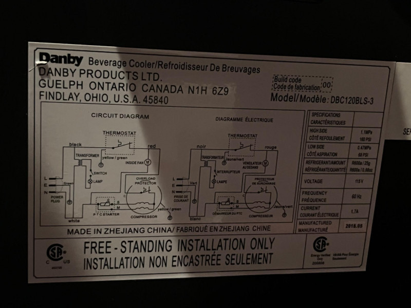 Danby mini beverage fridge. Small spots of wear on the top of the fridge, but functional. "3.3 cu. ft. beverage centre stores up to 120 soda cans (12 oz /355 ml)Temperature range of 6°C – 14°C (43°F – 57°F)Superior Fan forced cooling maintains a consistent internal temperature throughout the cabinetDoor lock secures contentsEasy access mechanical thermostatBlue LED interior lighting showcases the contentsReversible door hinge for left or right hand openingTempered glass door with stainless steel trimCustomized storage with 4 adjustable shelves"