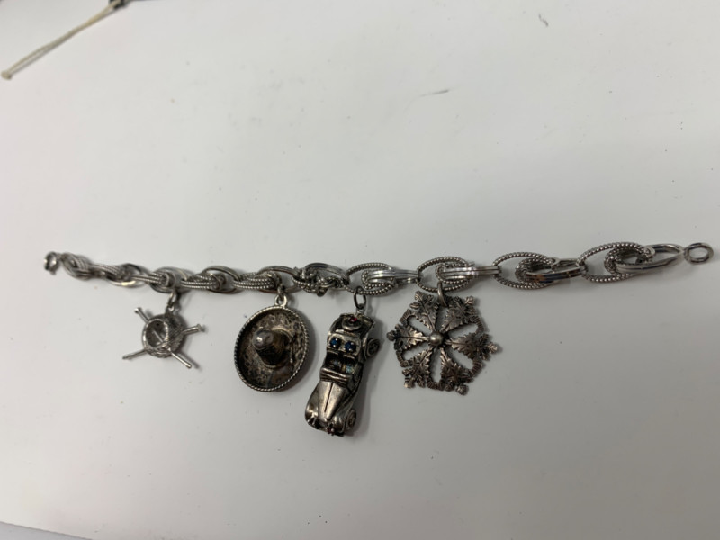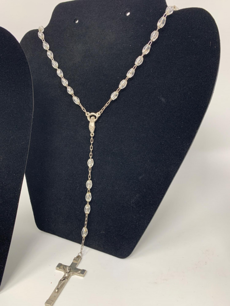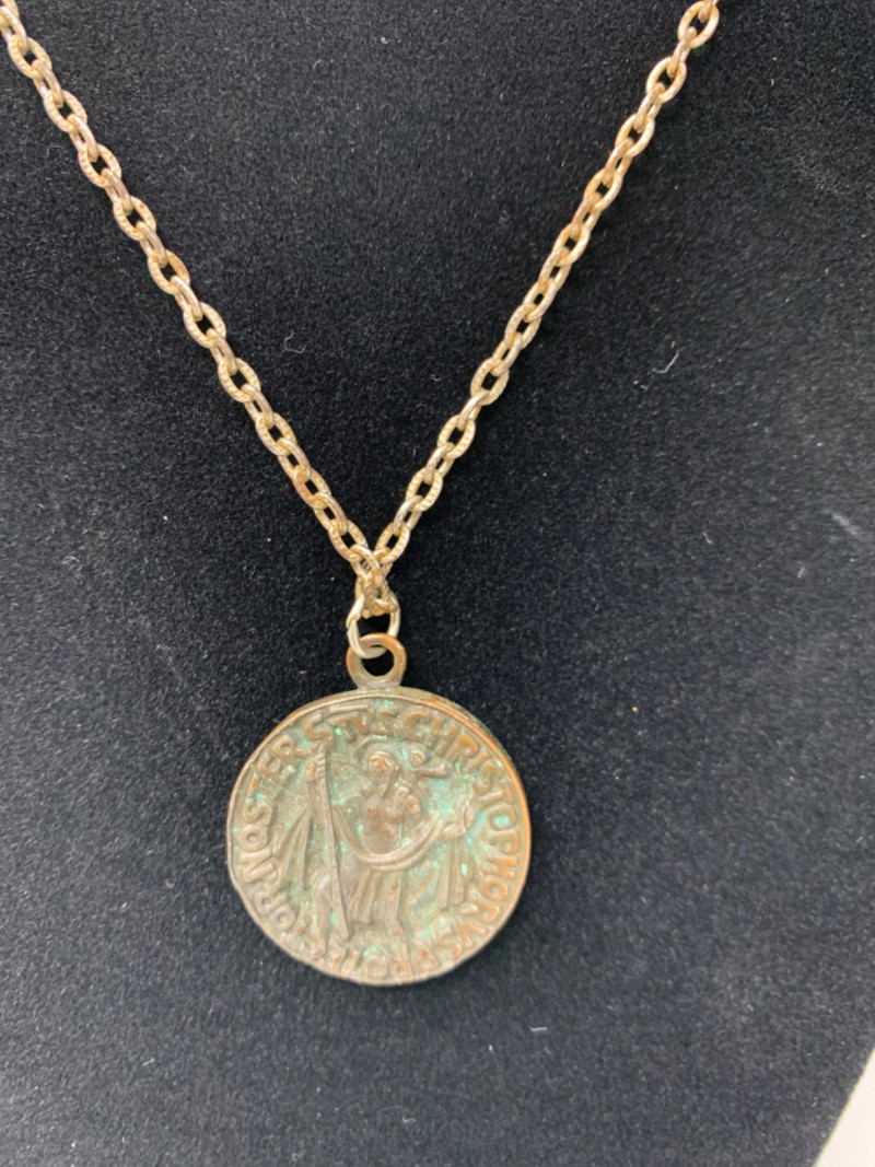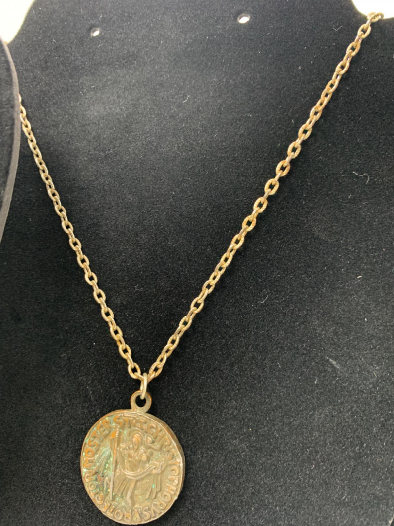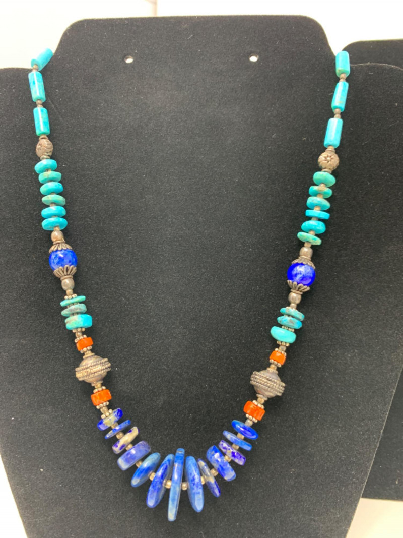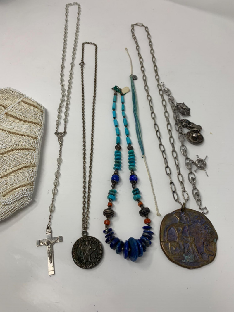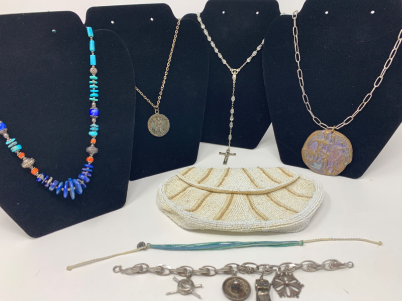 One women’s beaded purse, Catholic rosary, a Catholic necklace, lapis lazuli, silver with turquoise and carnelian two bracelets a shepherd medallion with a ship on the back necklace.