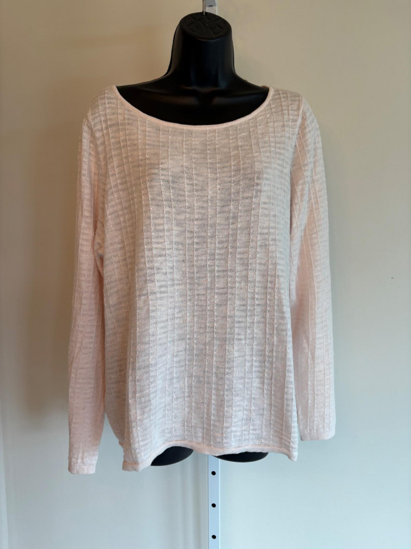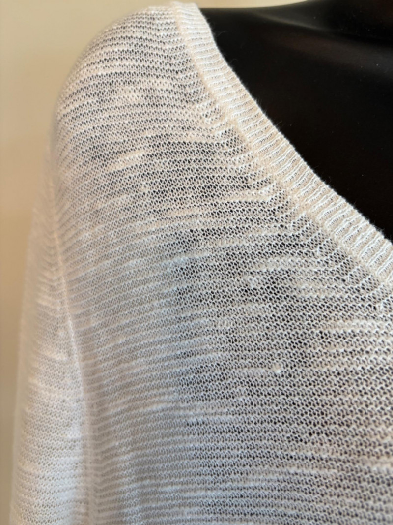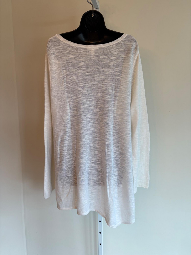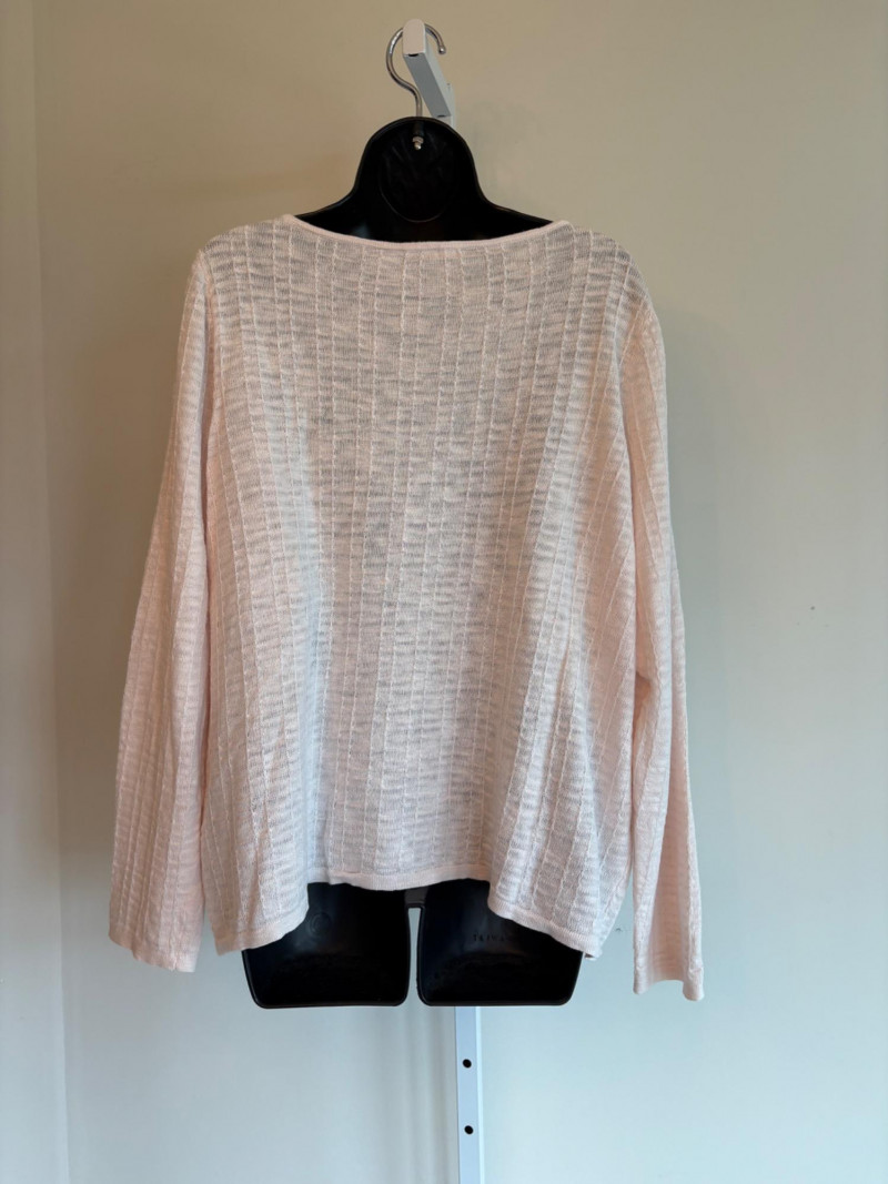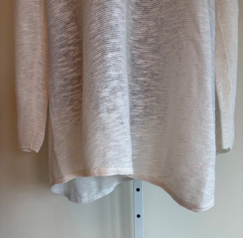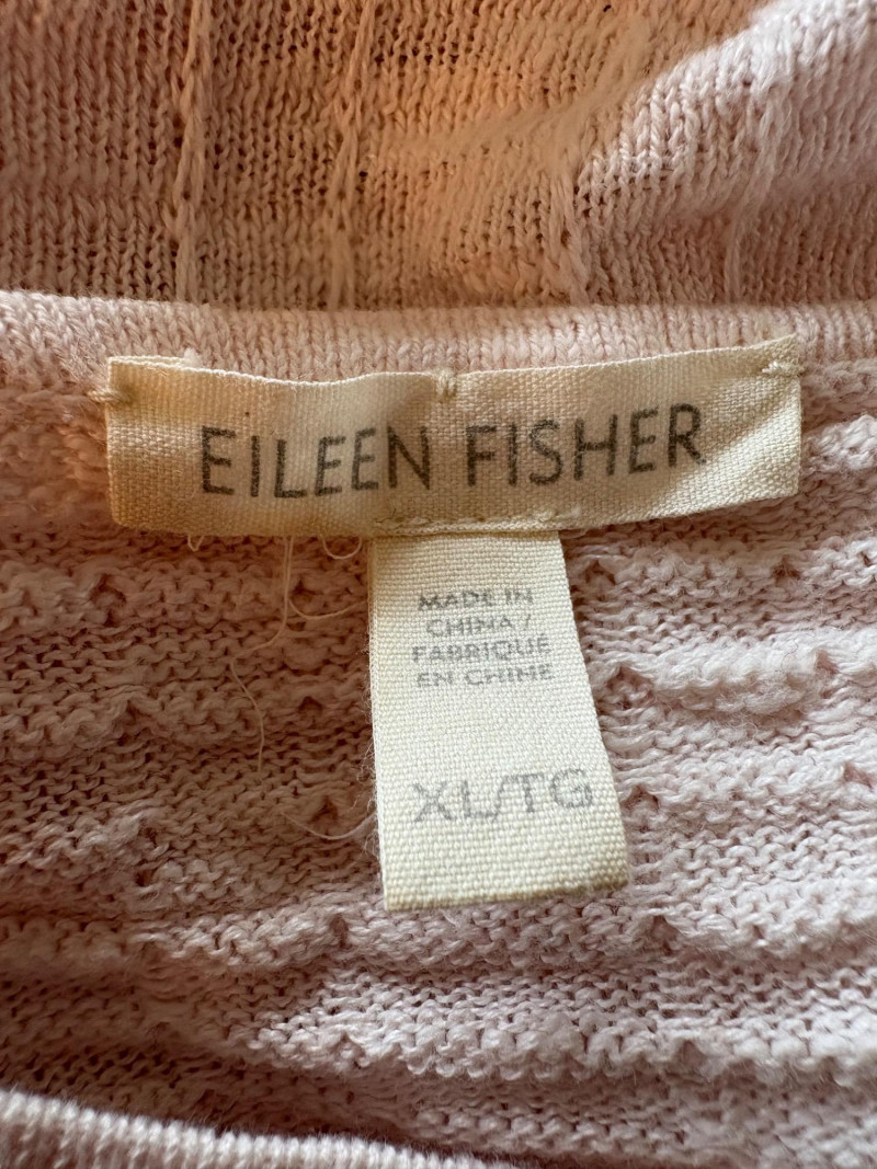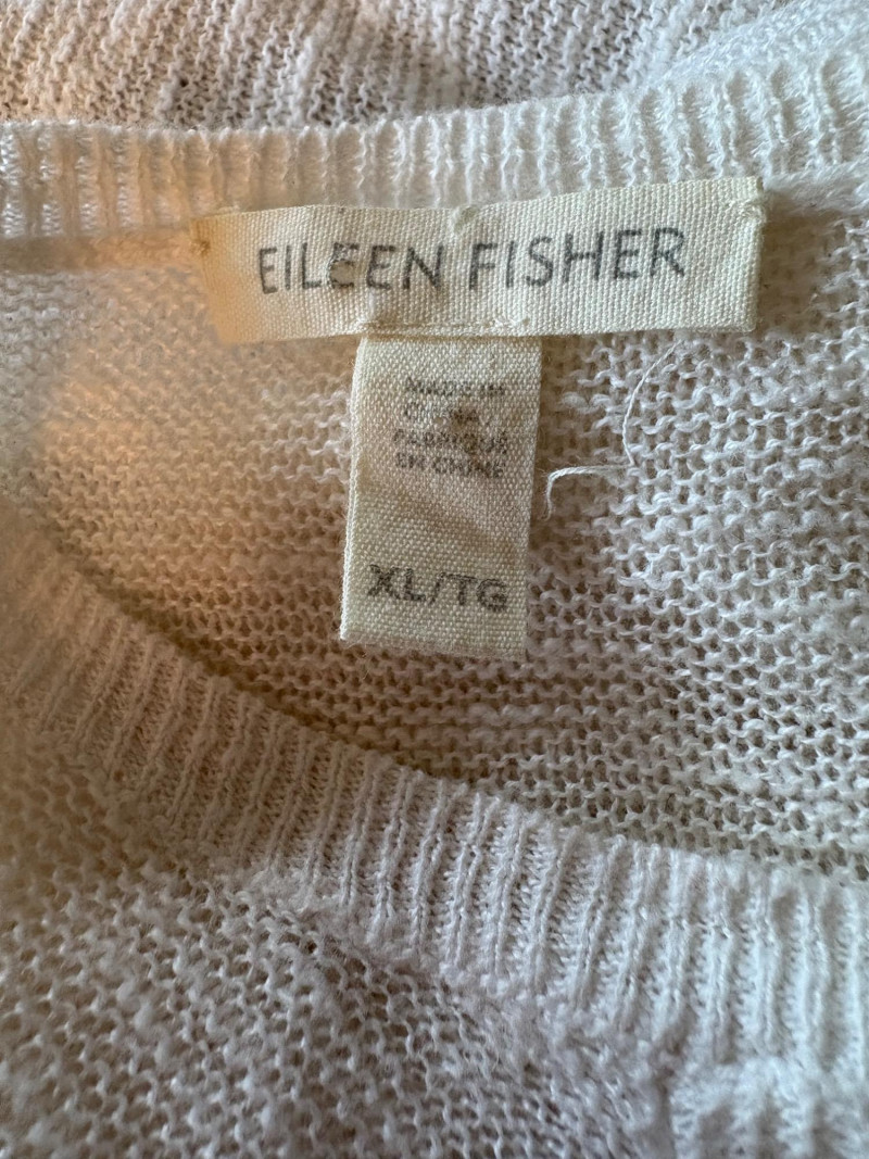 Three lighter weight sweaters in and different weaves and materials. All from Eileen Fisher, measure 23.5" pit to pit, and have XL size tag. White sweater has V-neck, long sleeves, asymmetrical curved hemline, and very sheer weave with horizontal pattern. Linen/cotton blend. Pale green sweater has curved neckline, rolled neck/sleeve ends/hem in open delicate weave with nice hand. 100% linen. Baby pink sweater has curved neckline, long sleeves, and grid-like weave pattern. Linen/cotton blend. Note that we saw a small dab of something on right sleeve during photos - we think it will launder out - see last photo.