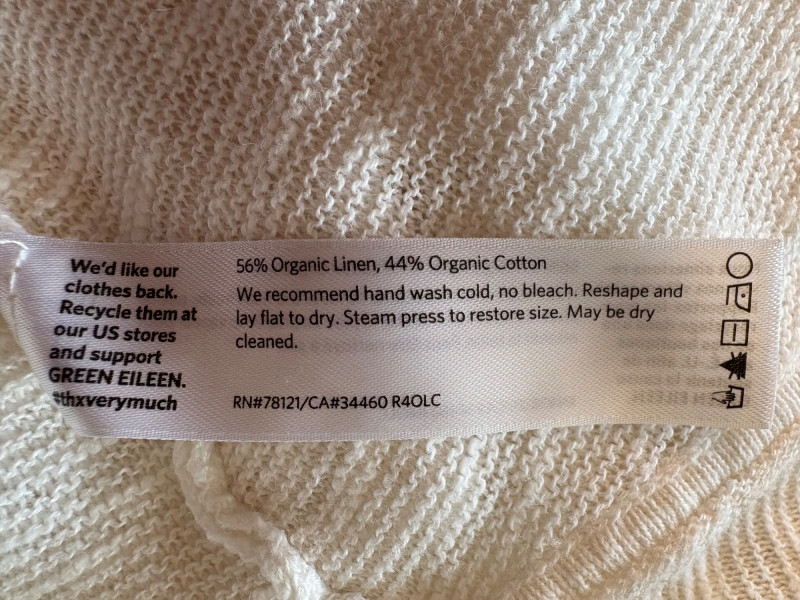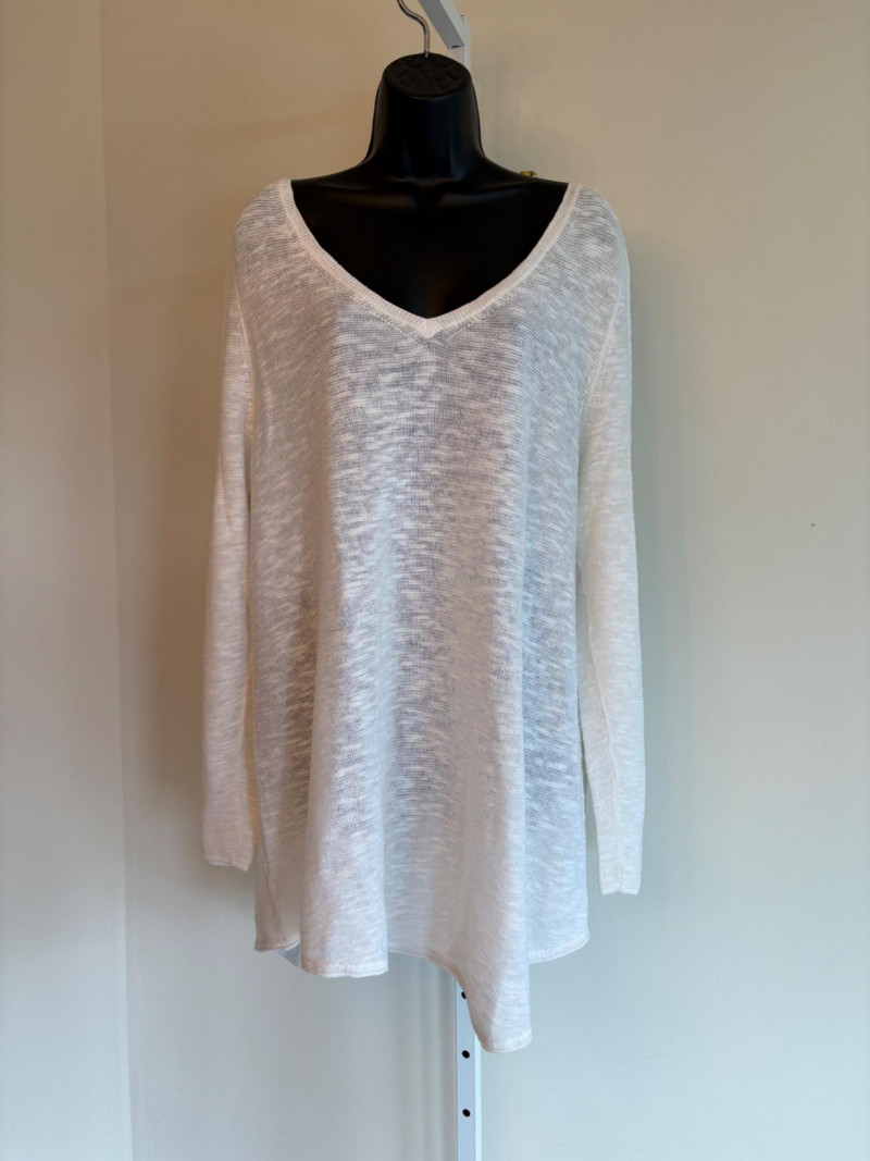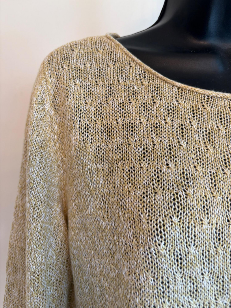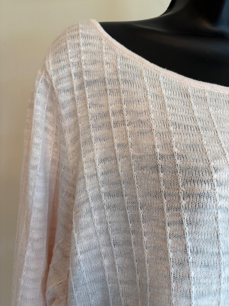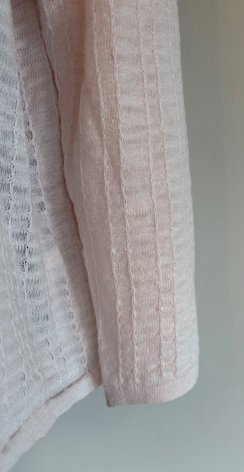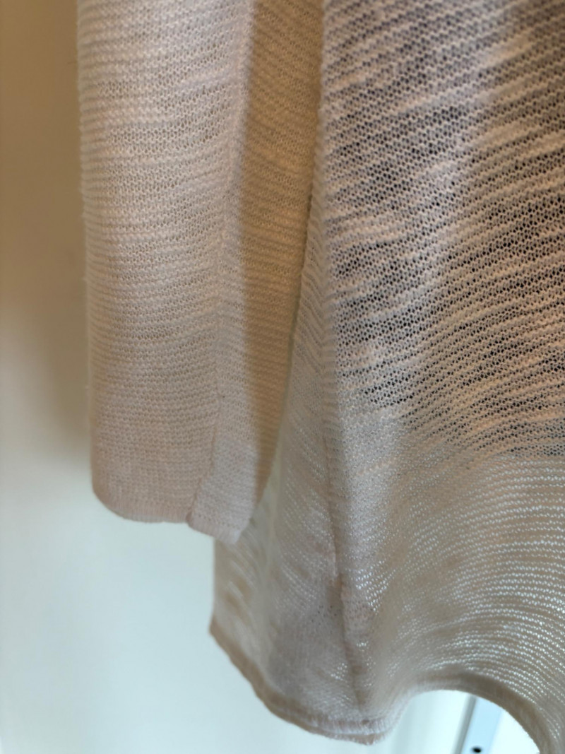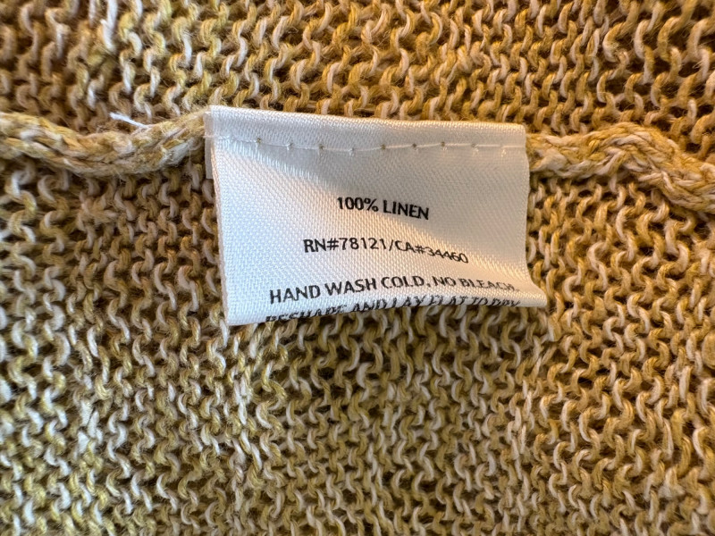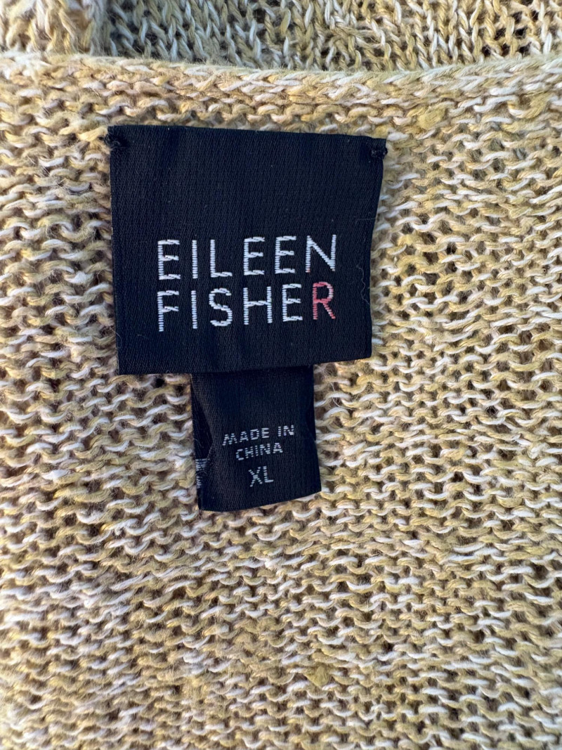 Three lighter weight sweaters in and different weaves and materials. All from Eileen Fisher, measure 23.5" pit to pit, and have XL size tag. White sweater has V-neck, long sleeves, asymmetrical curved hemline, and very sheer weave with horizontal pattern. Linen/cotton blend. Pale green sweater has curved neckline, rolled neck/sleeve ends/hem in open delicate weave with nice hand. 100% linen. Baby pink sweater has curved neckline, long sleeves, and grid-like weave pattern. Linen/cotton blend. Note that we saw a small dab of something on right sleeve during photos - we think it will launder out - see last photo.