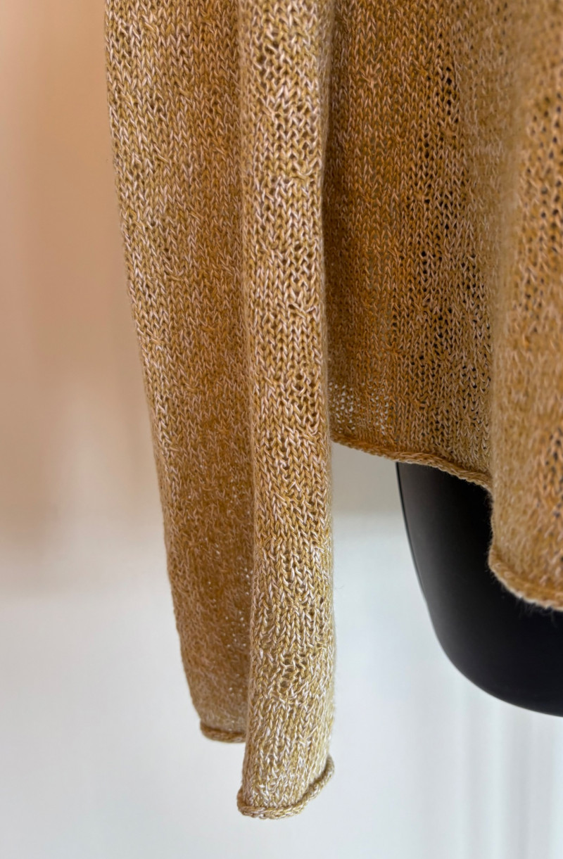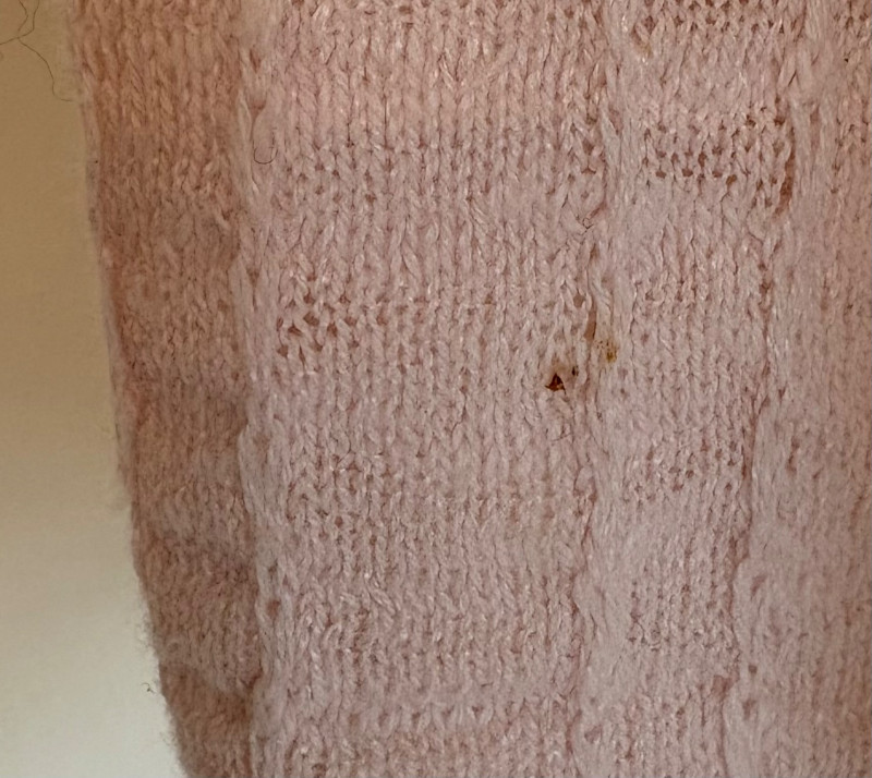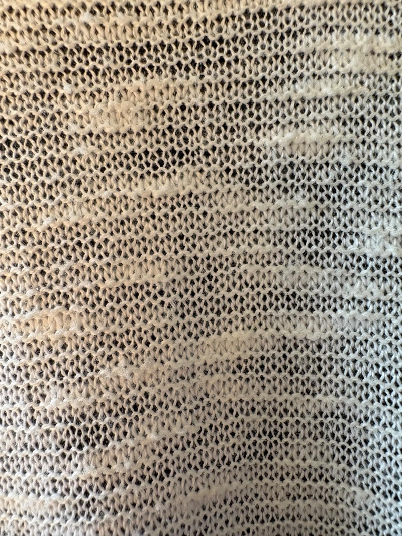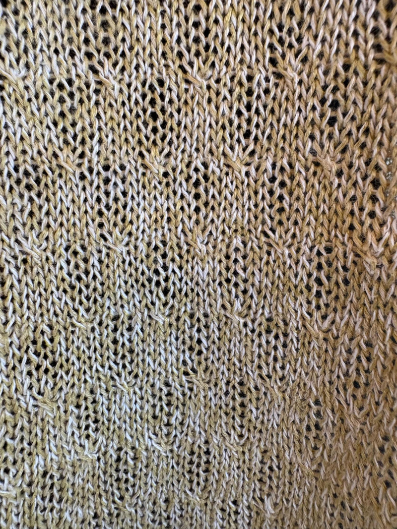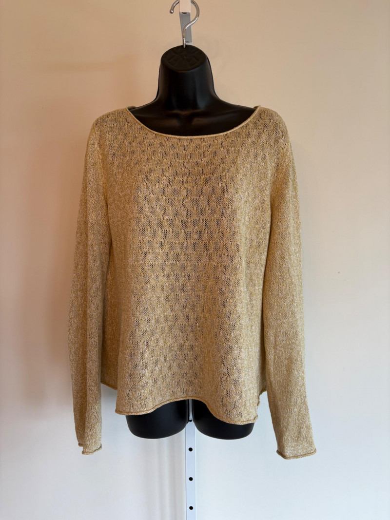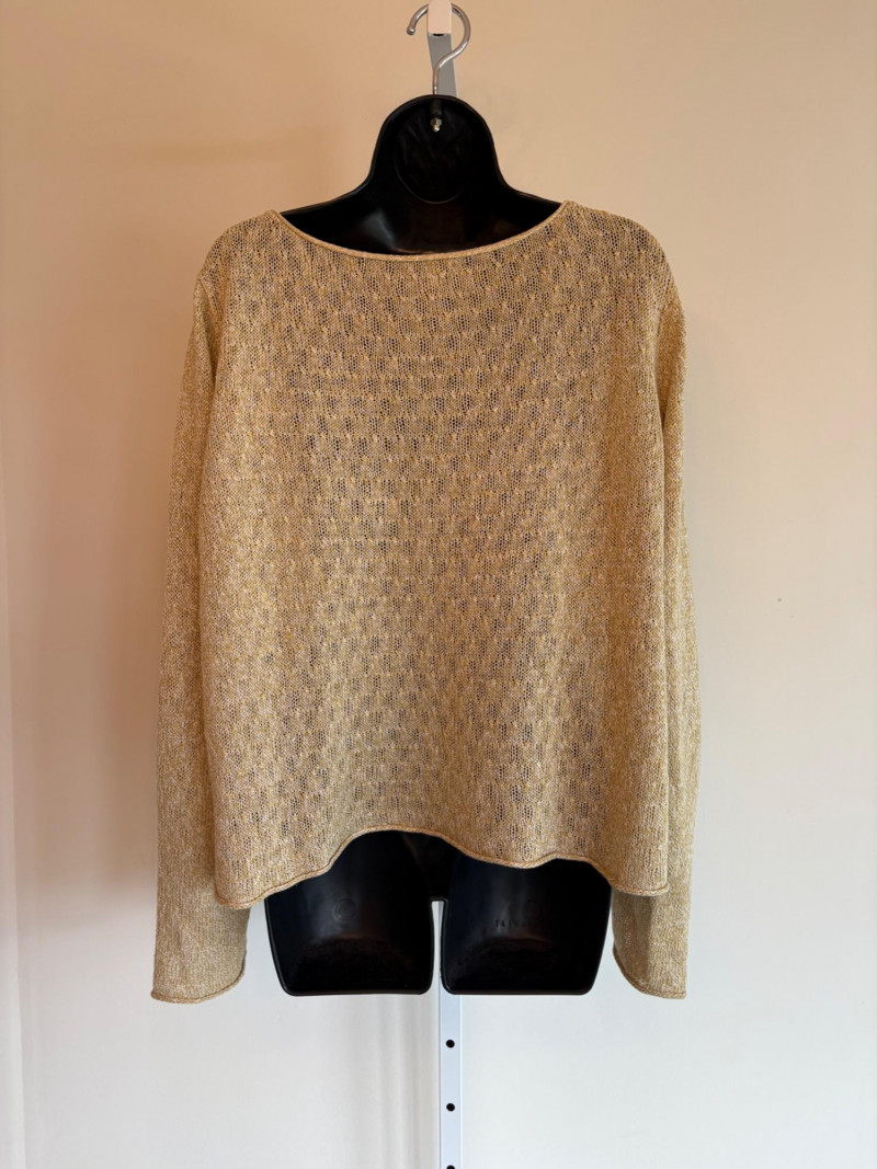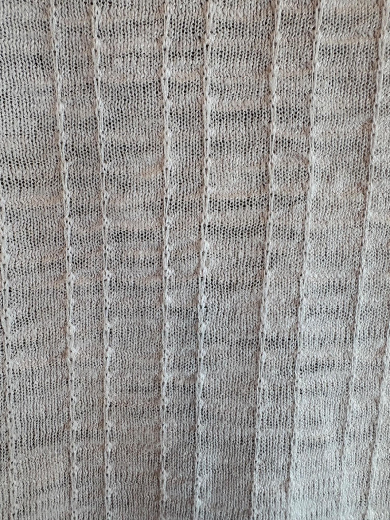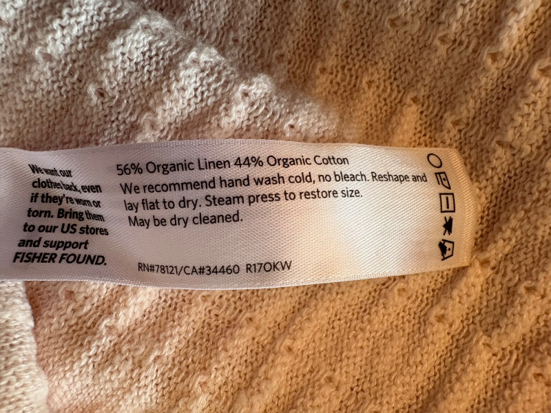 Three lighter weight sweaters in and different weaves and materials. All from Eileen Fisher, measure 23.5" pit to pit, and have XL size tag. White sweater has V-neck, long sleeves, asymmetrical curved hemline, and very sheer weave with horizontal pattern. Linen/cotton blend. Pale green sweater has curved neckline, rolled neck/sleeve ends/hem in open delicate weave with nice hand. 100% linen. Baby pink sweater has curved neckline, long sleeves, and grid-like weave pattern. Linen/cotton blend. Note that we saw a small dab of something on right sleeve during photos - we think it will launder out - see last photo.