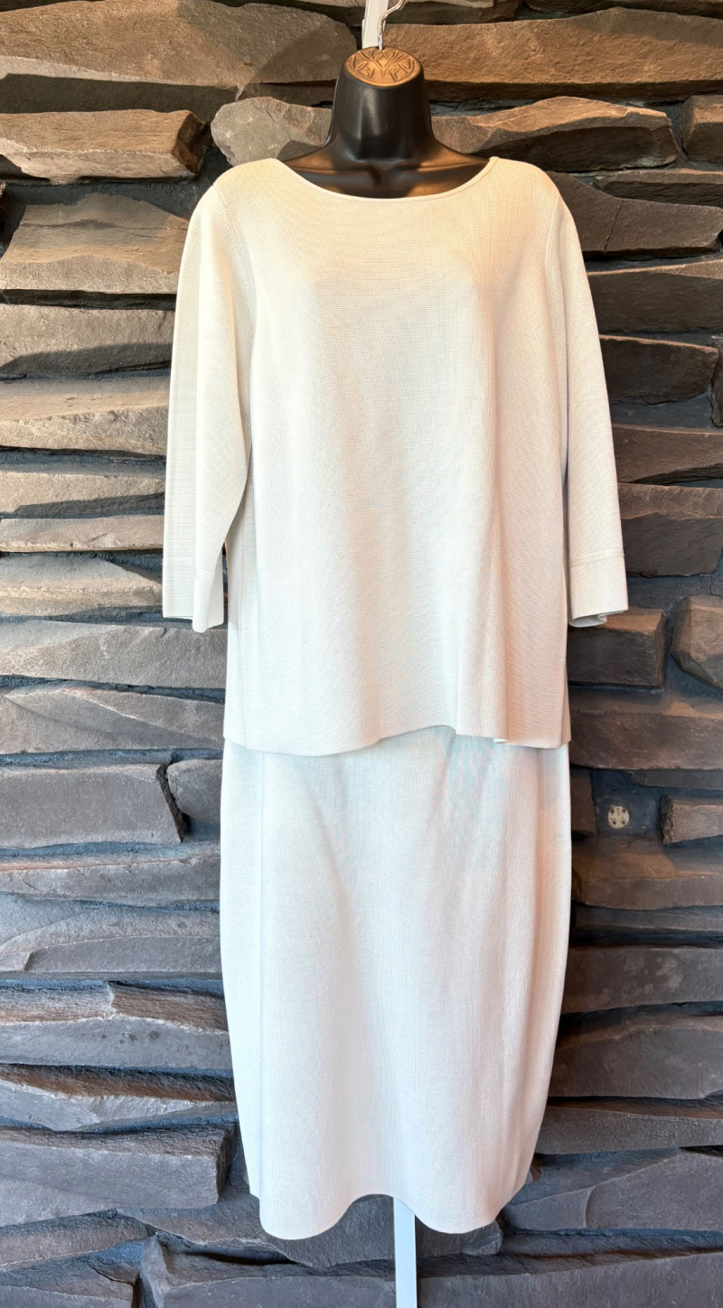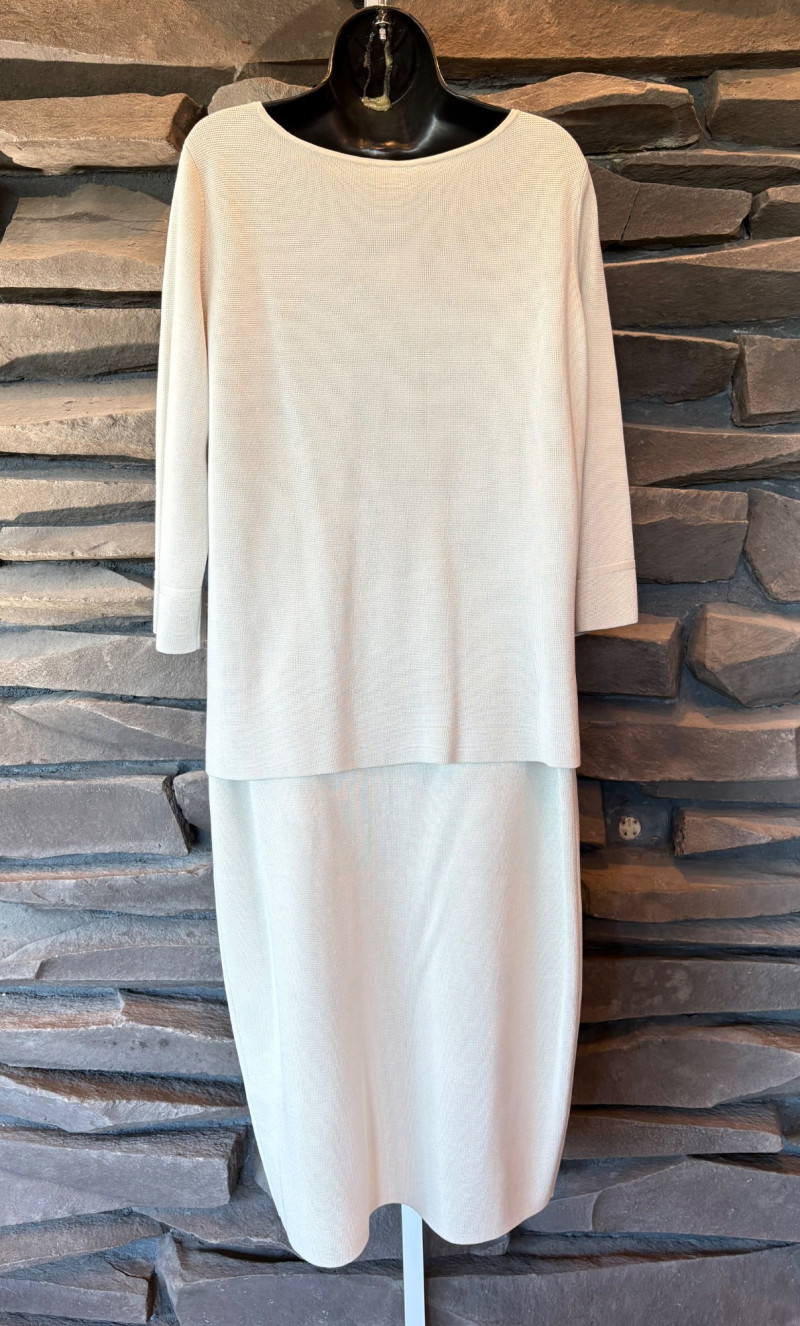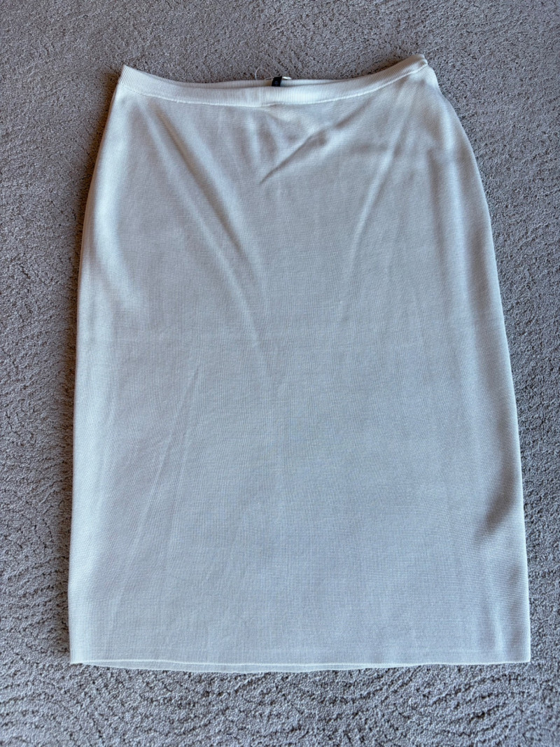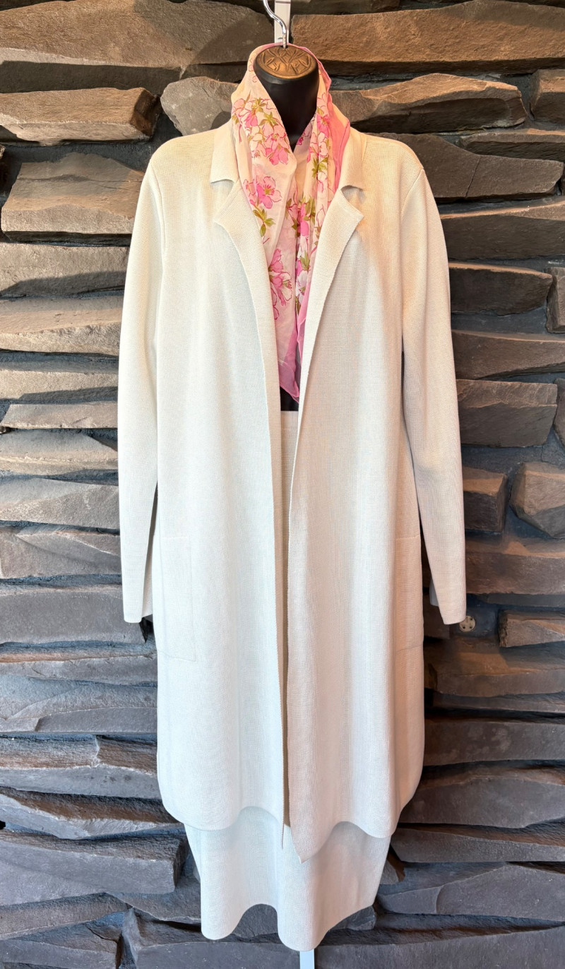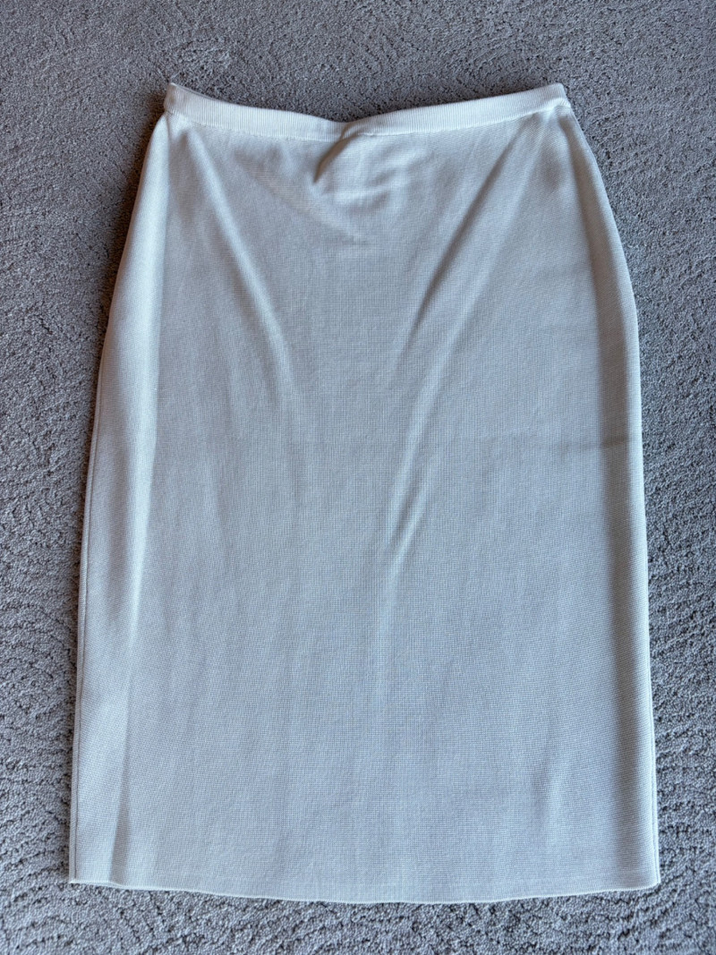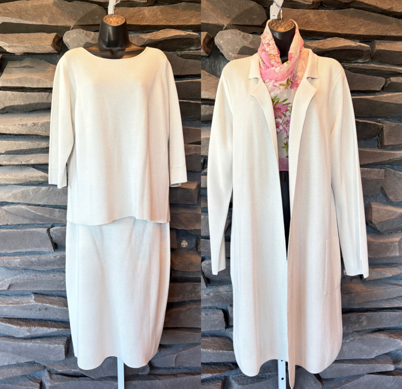 Three fabulous pieces of identical silk knit to wear together or separately. In a very versatile creamy color with minimalist lines and detailing. Long duster has notched collar, narrow ribbed hem & sleeves, split hem on sleeves, and in-seam side pockets. Measures 22" pit to pit and 38" from back neckline to bottom hem. Size tag says XL. Matching straight skirt has knit elasticated waist. New with tag. Measures 18" side to side at waist and 30" from waistband to hem. Size tag says L Coordinating knit top has curved neckline with very narrow band along with three-quarter sleeves. Measures 22" pit to pit and 24" from back neckline to hem. Size tag says L. Paired with delicate pink and pale taupe vintage scarf. Measures approximately 42" x 16". No maker or fabric tag, but appears to be synthetic. Please note small hole discovered when photographing - see last photo.