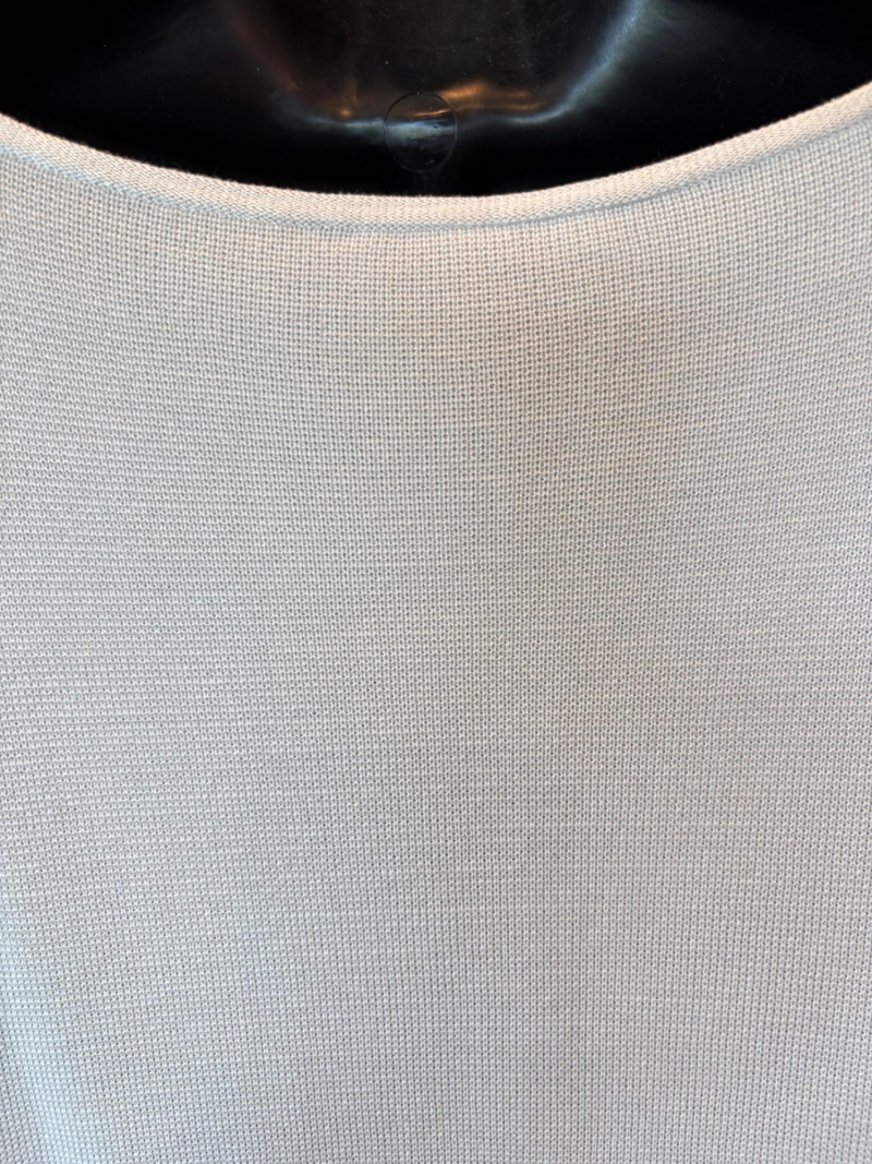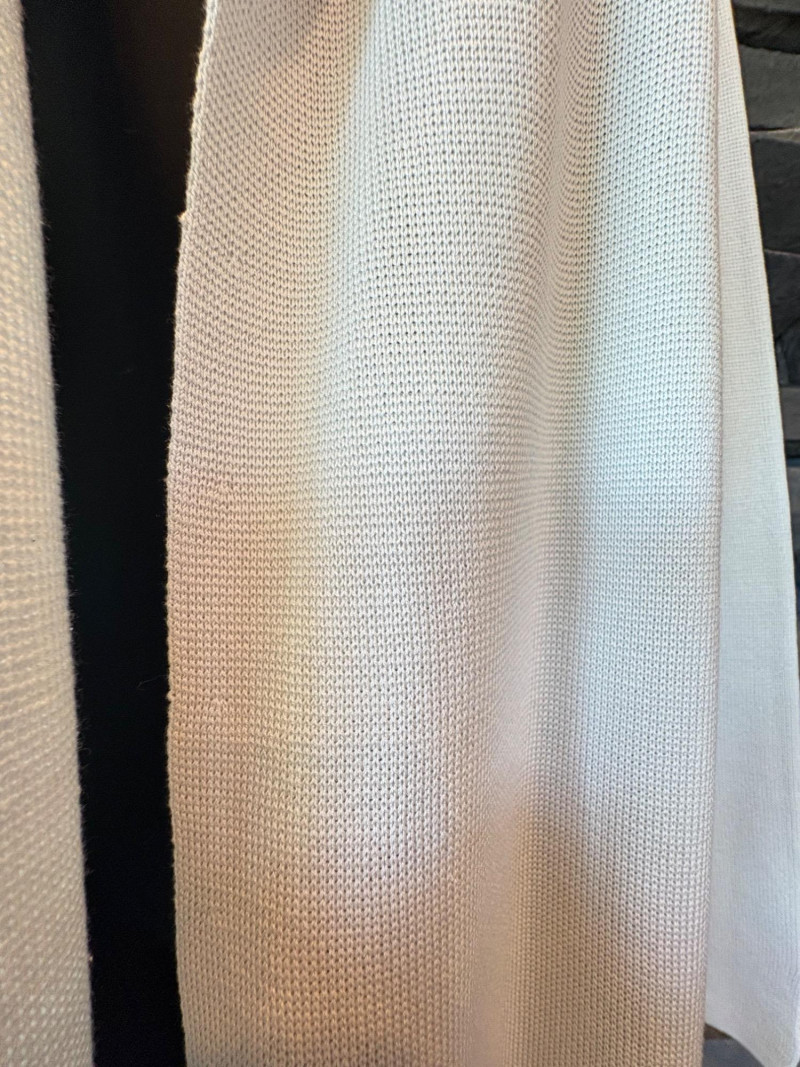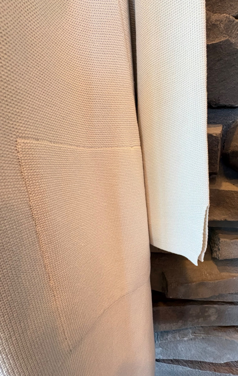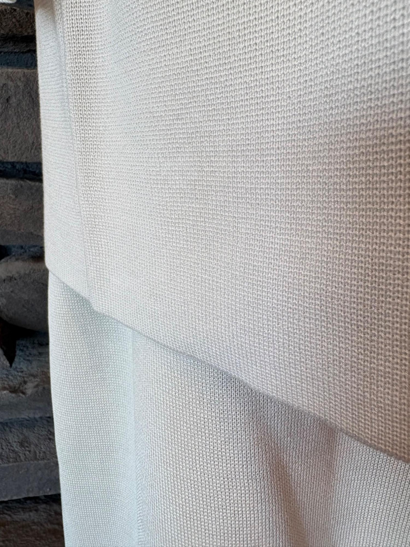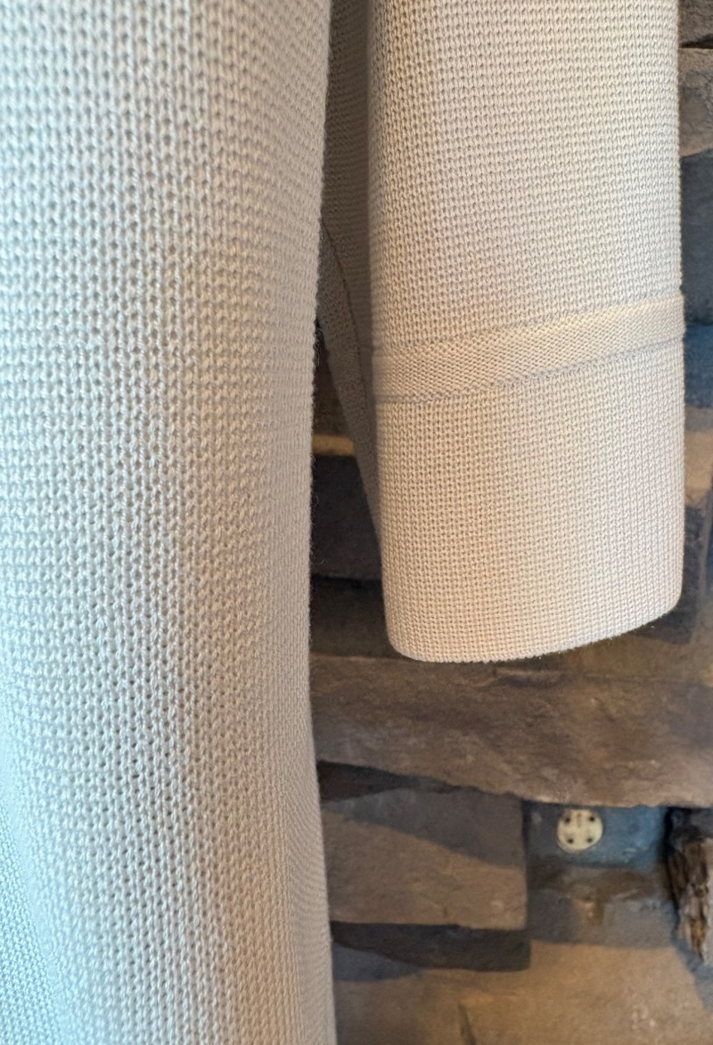 Three fabulous pieces of identical silk knit to wear together or separately. In a very versatile creamy color with minimalist lines and detailing. Long duster has notched collar, narrow ribbed hem & sleeves, split hem on sleeves, and in-seam side pockets. Measures 22" pit to pit and 38" from back neckline to bottom hem. Size tag says XL. Matching straight skirt has knit elasticated waist. New with tag. Measures 18" side to side at waist and 30" from waistband to hem. Size tag says L Coordinating knit top has curved neckline with very narrow band along with three-quarter sleeves. Measures 22" pit to pit and 24" from back neckline to hem. Size tag says L. Paired with delicate pink and pale taupe vintage scarf. Measures approximately 42" x 16". No maker or fabric tag, but appears to be synthetic. Please note small hole discovered when photographing - see last photo.