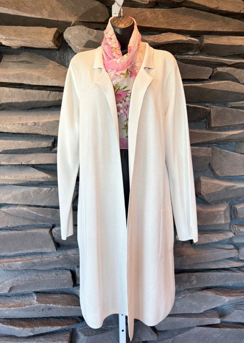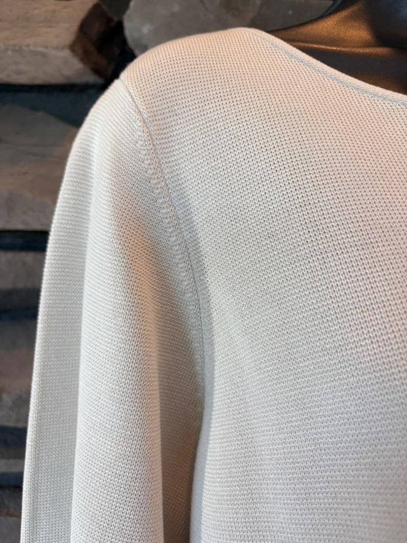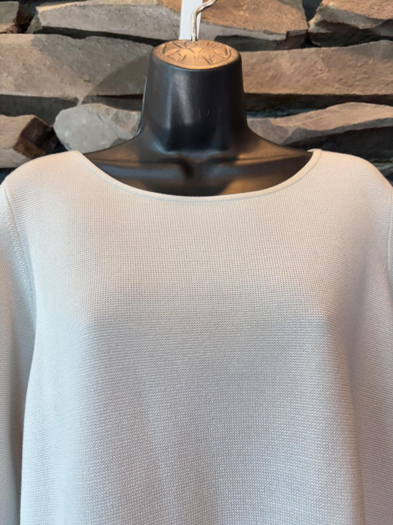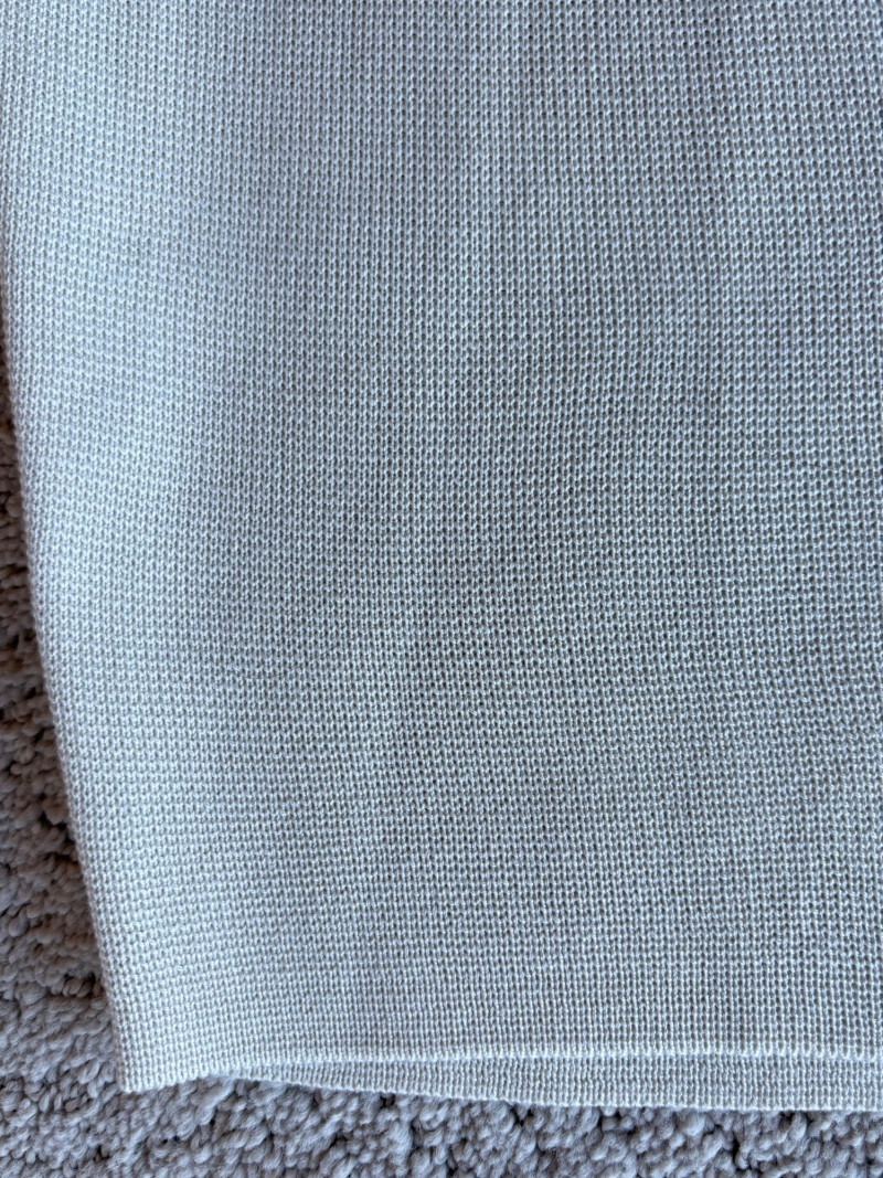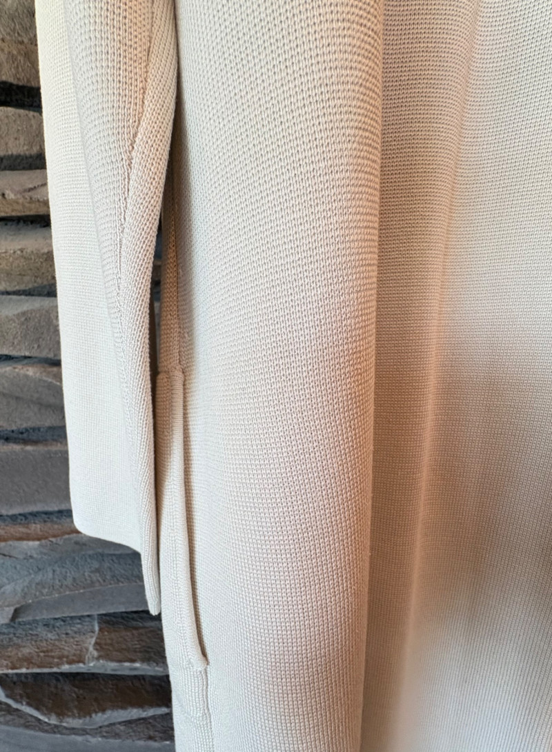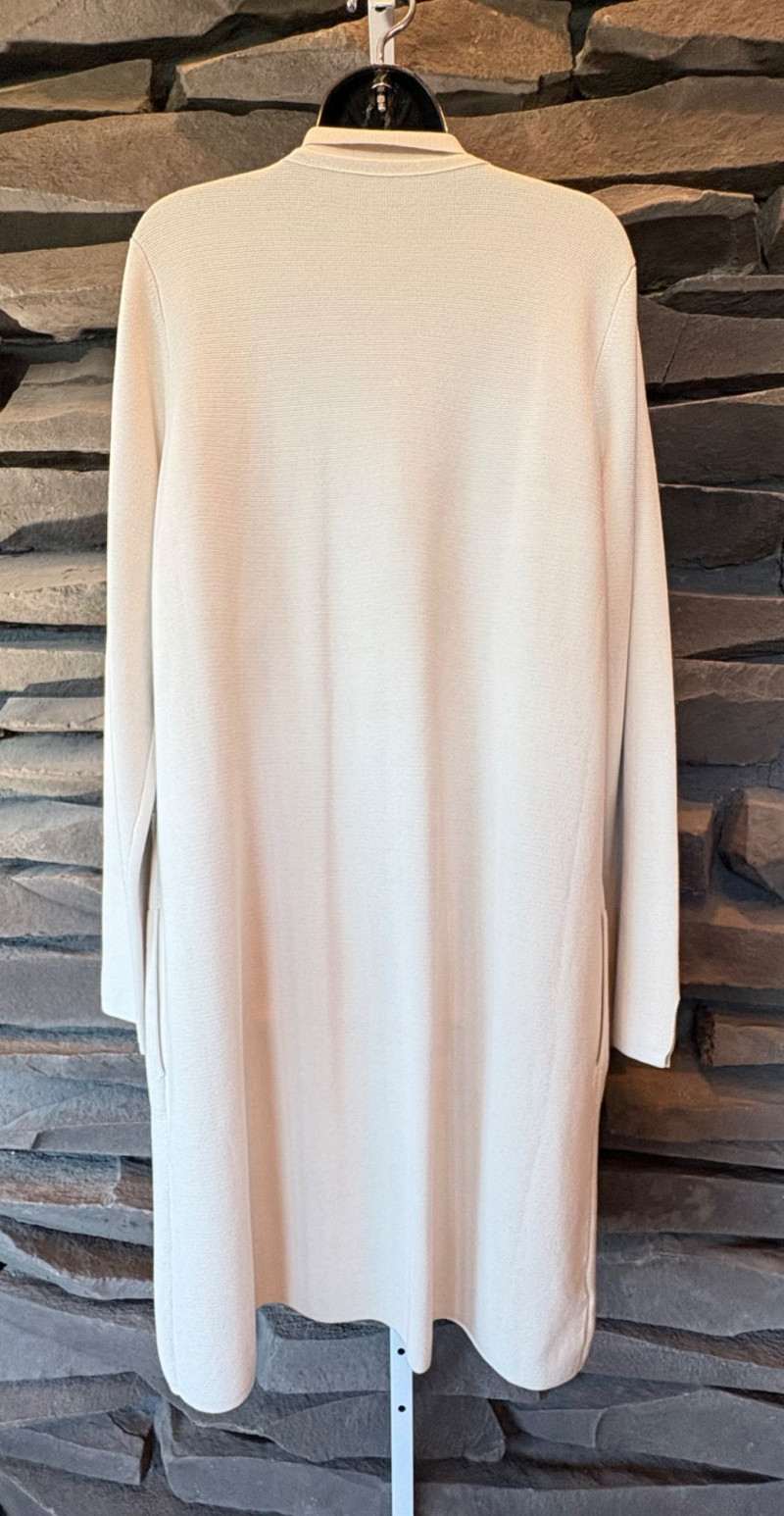 Three fabulous pieces of identical silk knit to wear together or separately. In a very versatile creamy color with minimalist lines and detailing. Long duster has notched collar, narrow ribbed hem & sleeves, split hem on sleeves, and in-seam side pockets. Measures 22" pit to pit and 38" from back neckline to bottom hem. Size tag says XL. Matching straight skirt has knit elasticated waist. New with tag. Measures 18" side to side at waist and 30" from waistband to hem. Size tag says L Coordinating knit top has curved neckline with very narrow band along with three-quarter sleeves. Measures 22" pit to pit and 24" from back neckline to hem. Size tag says L. Paired with delicate pink and pale taupe vintage scarf. Measures approximately 42" x 16". No maker or fabric tag, but appears to be synthetic. Please note small hole discovered when photographing - see last photo.