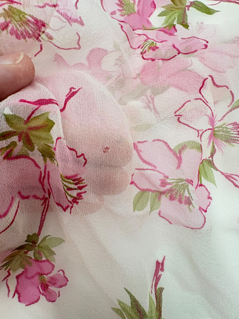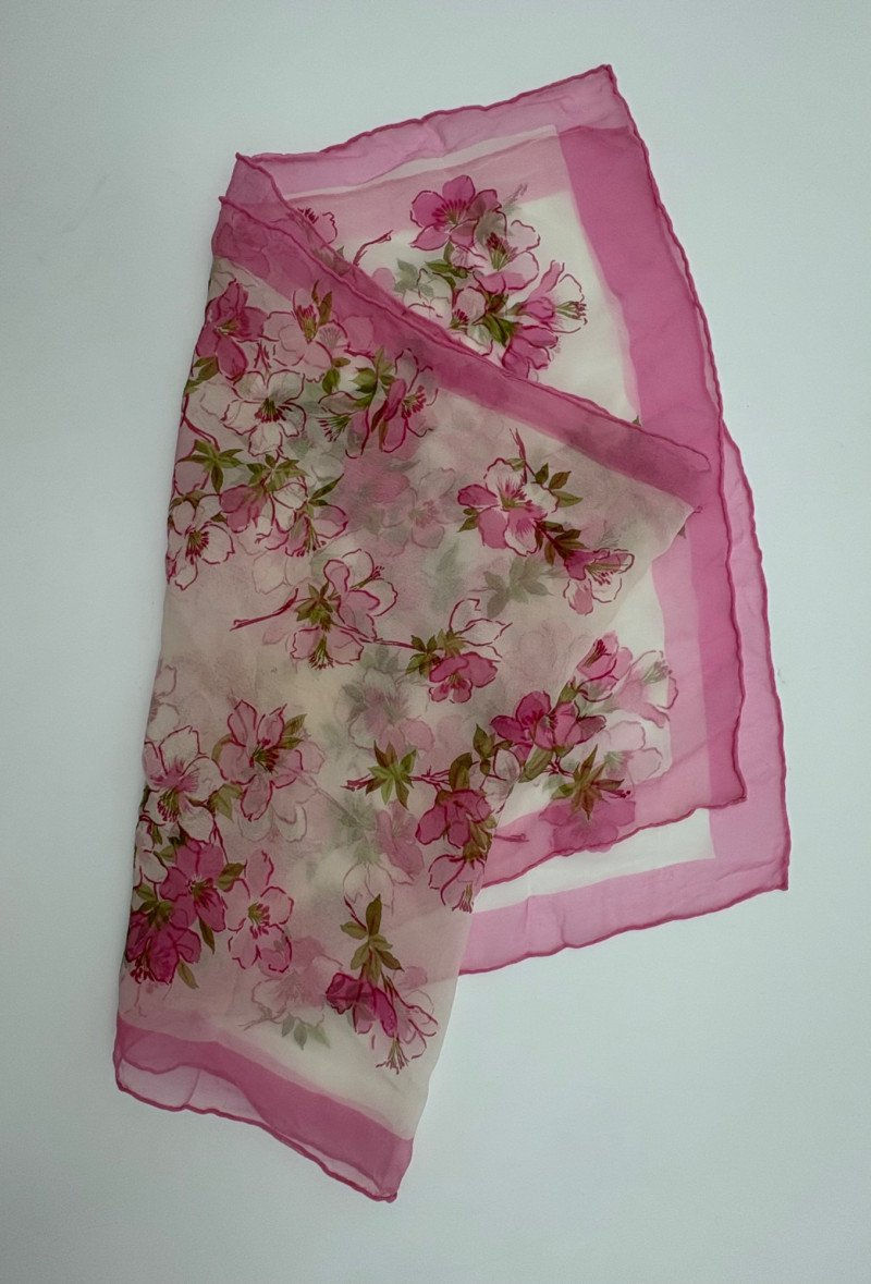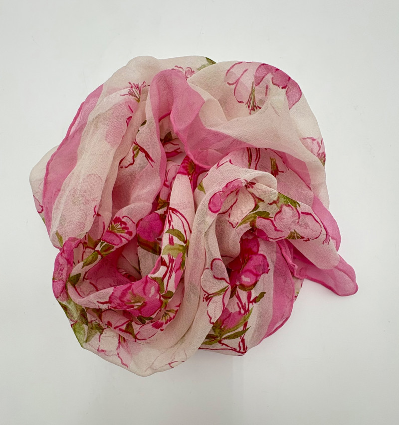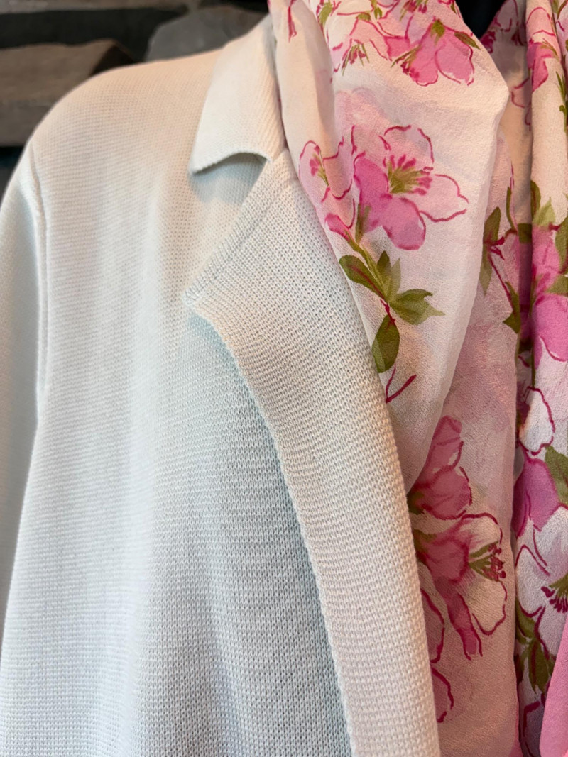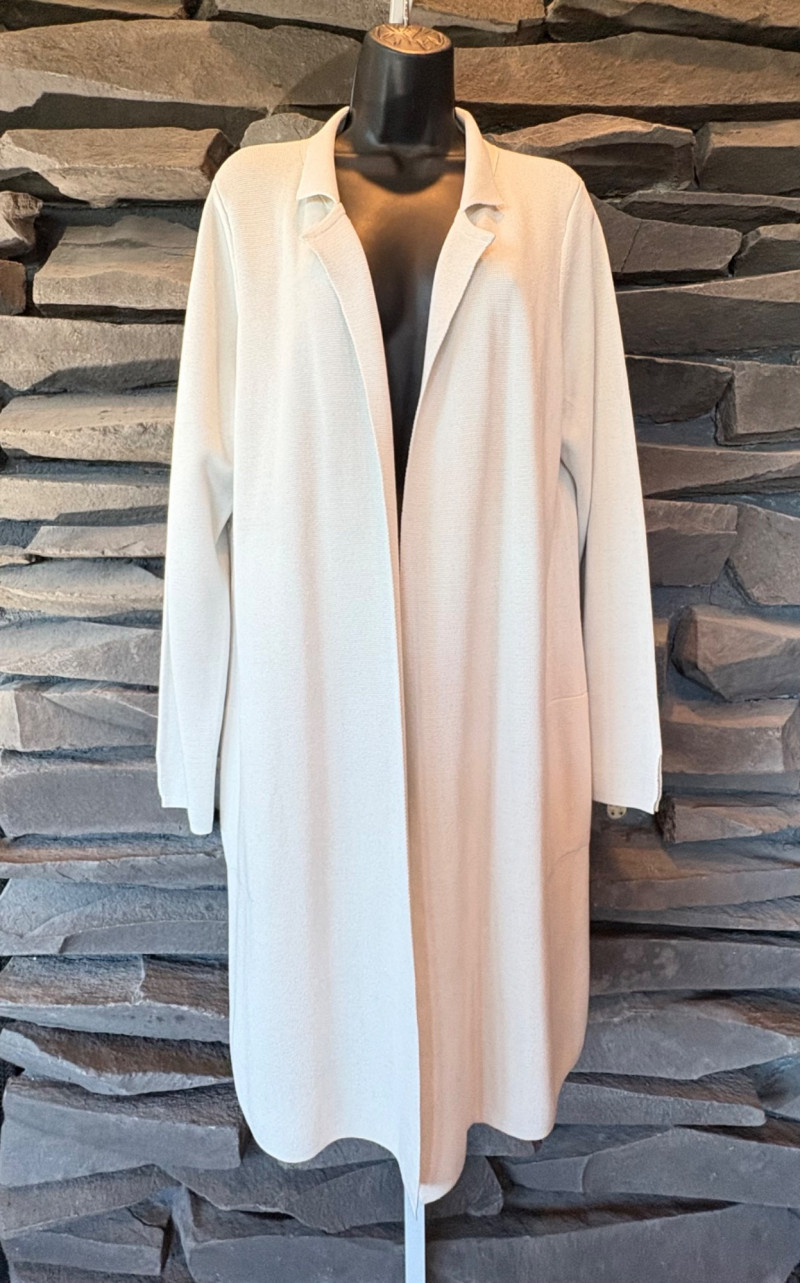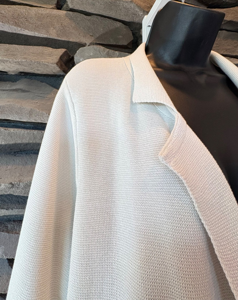 Three fabulous pieces of identical silk knit to wear together or separately. In a very versatile creamy color with minimalist lines and detailing. Long duster has notched collar, narrow ribbed hem & sleeves, split hem on sleeves, and in-seam side pockets. Measures 22" pit to pit and 38" from back neckline to bottom hem. Size tag says XL. Matching straight skirt has knit elasticated waist. New with tag. Measures 18" side to side at waist and 30" from waistband to hem. Size tag says L Coordinating knit top has curved neckline with very narrow band along with three-quarter sleeves. Measures 22" pit to pit and 24" from back neckline to hem. Size tag says L. Paired with delicate pink and pale taupe vintage scarf. Measures approximately 42" x 16". No maker or fabric tag, but appears to be synthetic. Please note small hole discovered when photographing - see last photo.