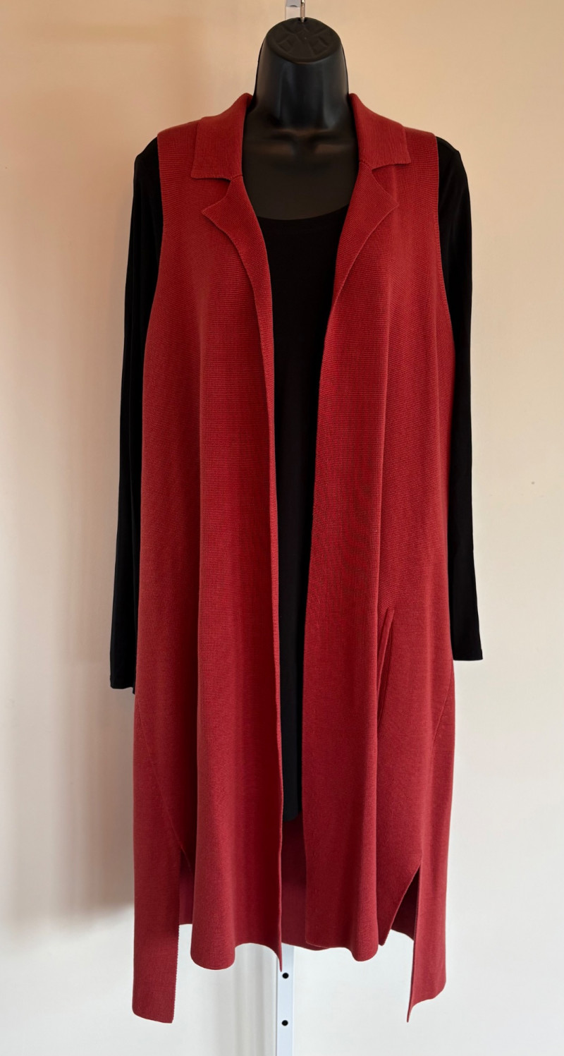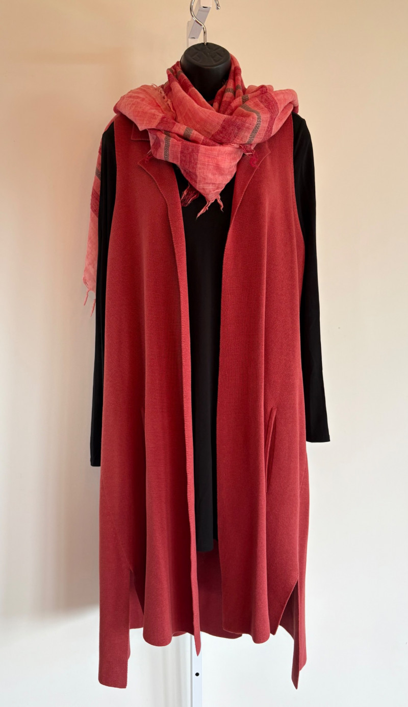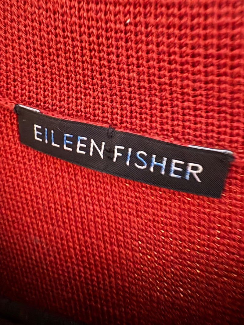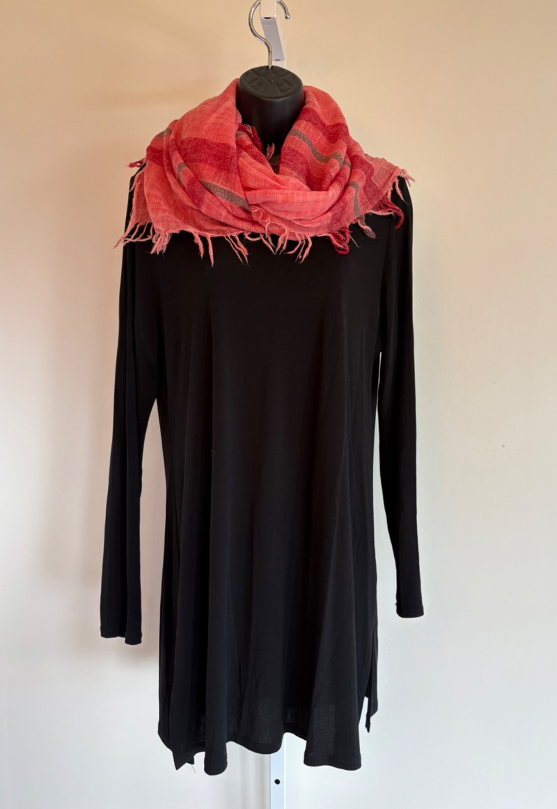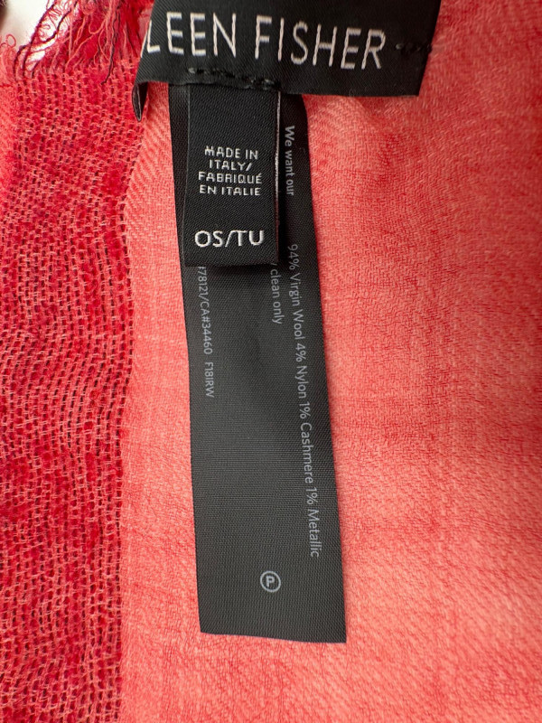 3 coordinating pieces in terrific fall tones from Eileen Fisher. Black long-sleeve lightweight tunic has curved neckline with stitched facing and split him. 100% silk. Measures 20" pit to pit and 31" from back neckline to bottom hem. 100% silk. Size tag says L. Burnt orange sleeveless long vest has pieced back construction, open front, notched collar, split hem, and welted slash pockets. Silk/cotton blend with a little heft - falls beautifully. Measures 20" pit to pit and 42"from back neckline to hem. Size tag is missing. Paired with striped rectangular scarf with fringe on all four sides. Measures approximately 27“ x 76". Wool/nylon/cashmere/metallic blend.