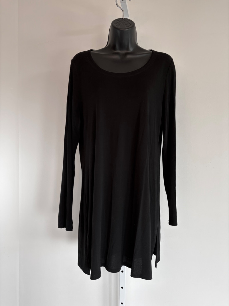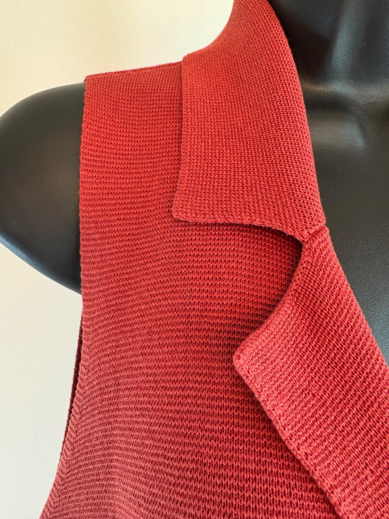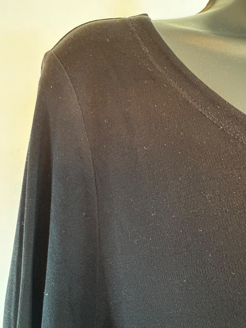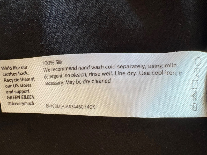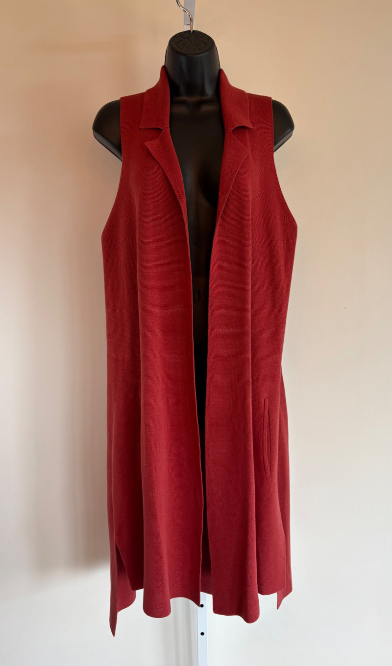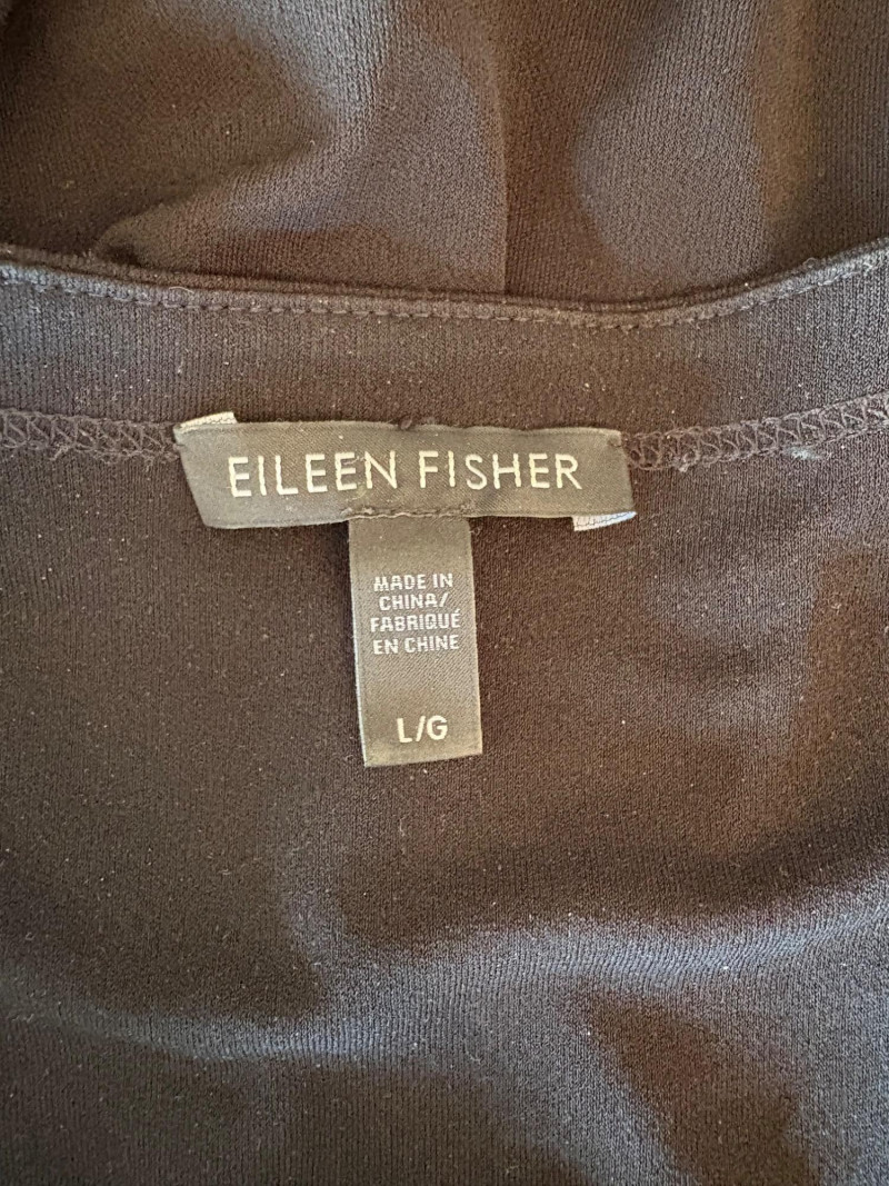 3 coordinating pieces in terrific fall tones from Eileen Fisher. Black long-sleeve lightweight tunic has curved neckline with stitched facing and split him. 100% silk. Measures 20" pit to pit and 31" from back neckline to bottom hem. 100% silk. Size tag says L. Burnt orange sleeveless long vest has pieced back construction, open front, notched collar, split hem, and welted slash pockets. Silk/cotton blend with a little heft - falls beautifully. Measures 20" pit to pit and 42"from back neckline to hem. Size tag is missing. Paired with striped rectangular scarf with fringe on all four sides. Measures approximately 27“ x 76". Wool/nylon/cashmere/metallic blend.