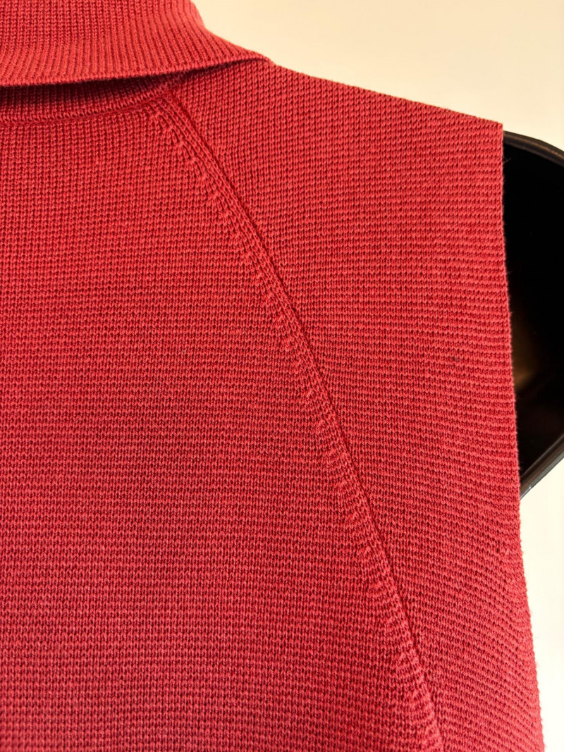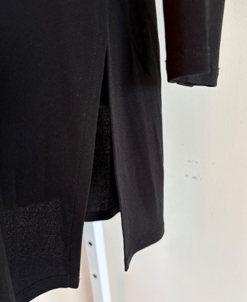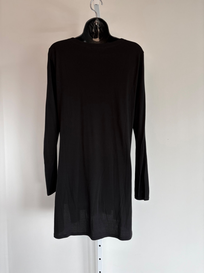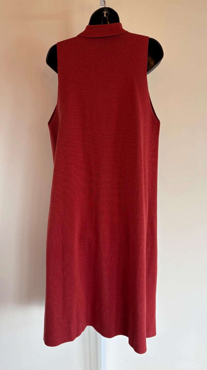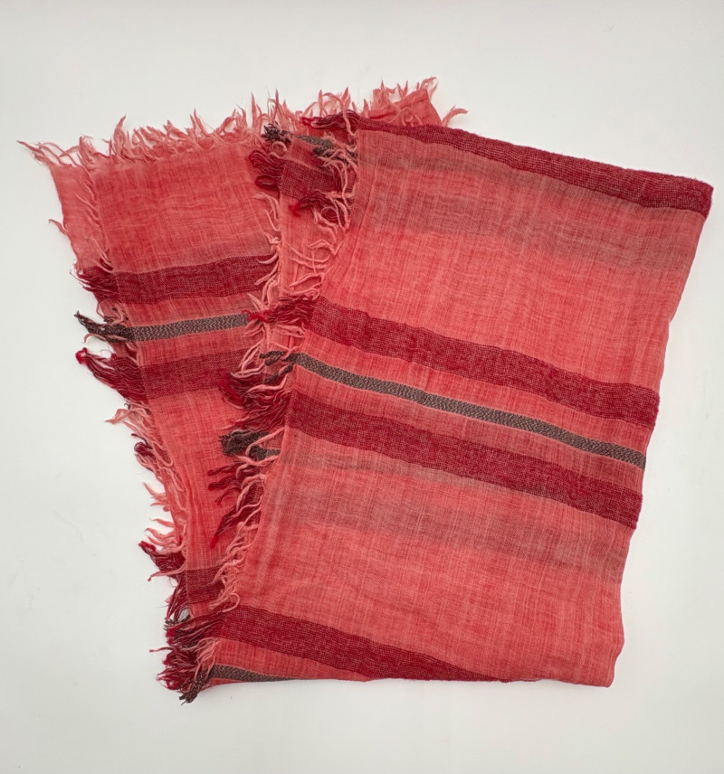 3 coordinating pieces in terrific fall tones from Eileen Fisher. Black long-sleeve lightweight tunic has curved neckline with stitched facing and split him. 100% silk. Measures 20" pit to pit and 31" from back neckline to bottom hem. 100% silk. Size tag says L. Burnt orange sleeveless long vest has pieced back construction, open front, notched collar, split hem, and welted slash pockets. Silk/cotton blend with a little heft - falls beautifully. Measures 20" pit to pit and 42"from back neckline to hem. Size tag is missing. Paired with striped rectangular scarf with fringe on all four sides. Measures approximately 27“ x 76". Wool/nylon/cashmere/metallic blend.