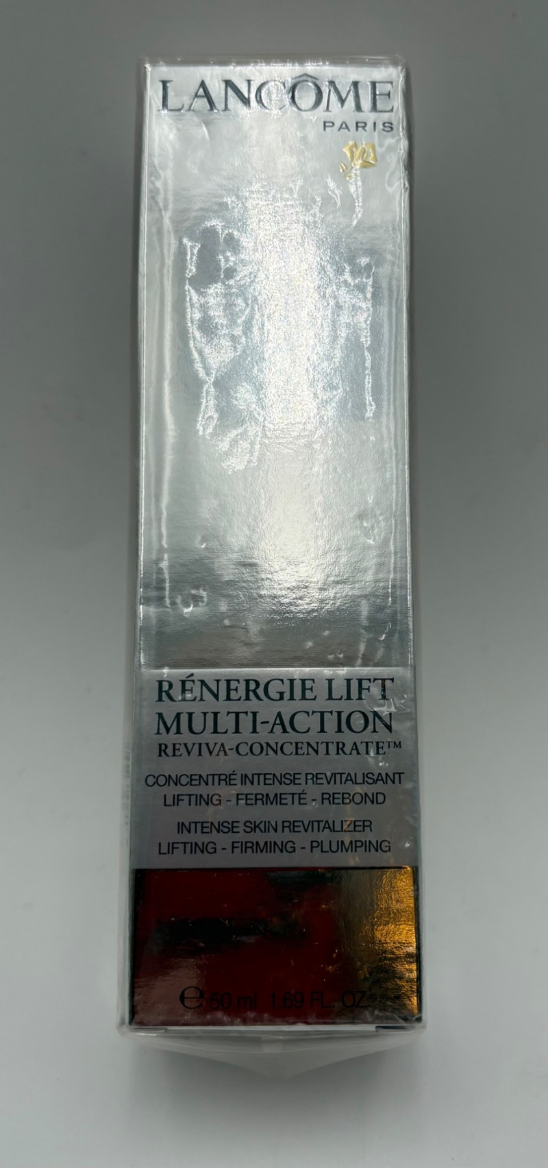 3 Lancome skin care products. All products appear to be new to the best of our determination. - Lancome Renergie Lift Multi-Action Reviva Concentrate - Lancome Renergie Multi-Action Lifting & Firming Moisturizer Cream - Lancome Advanced Genifique Yeux Cream Lancome make-up bag in black (not new)