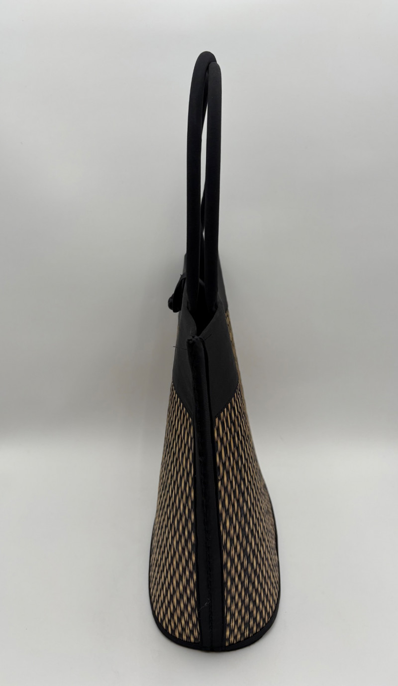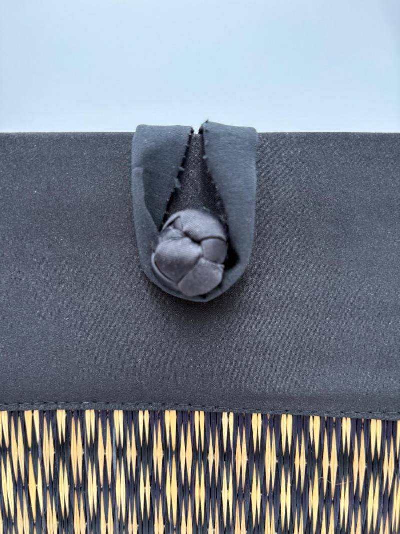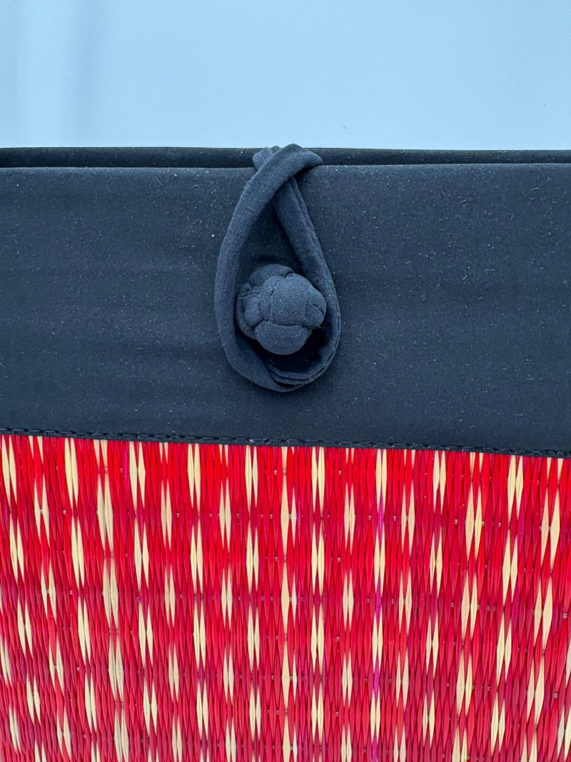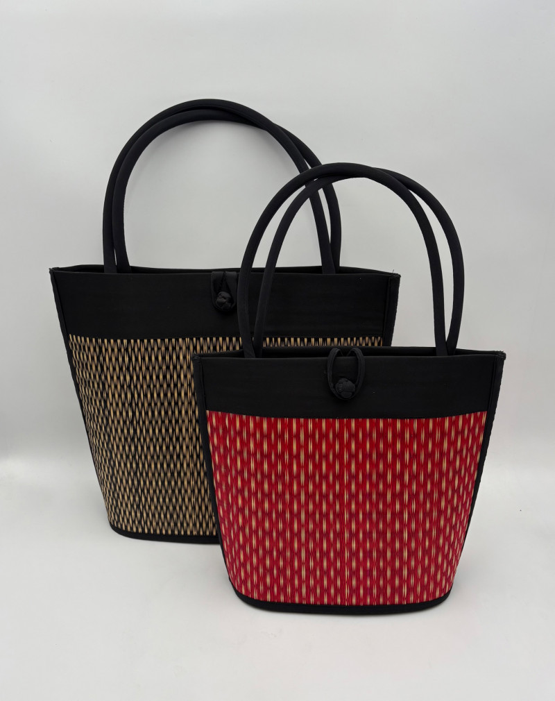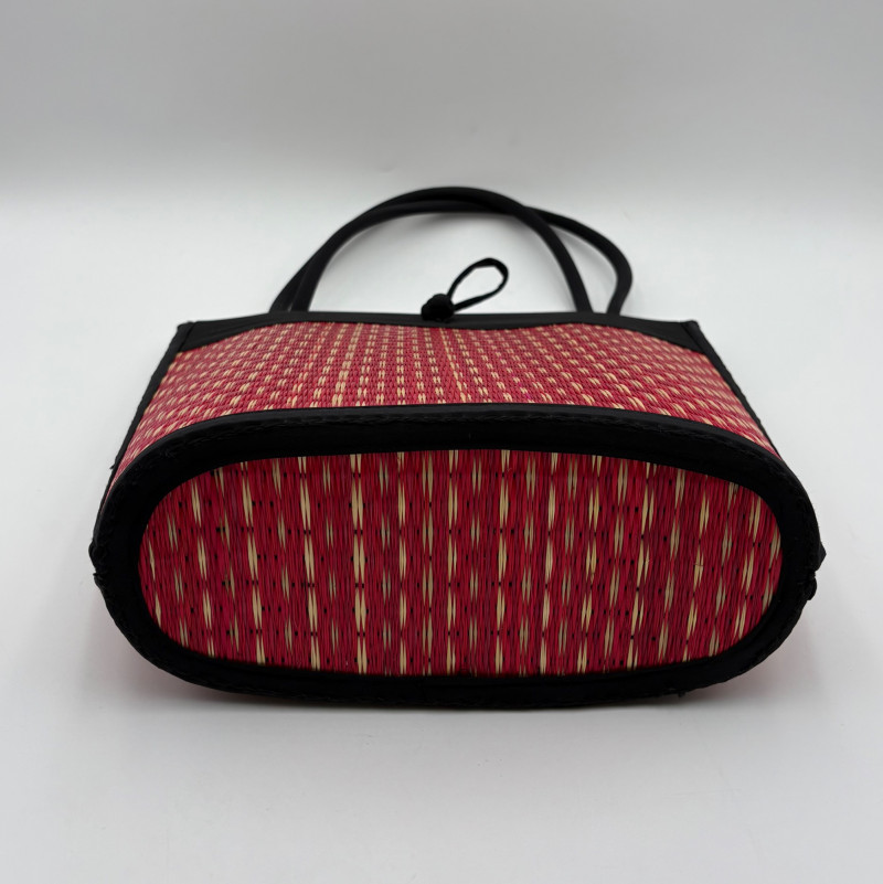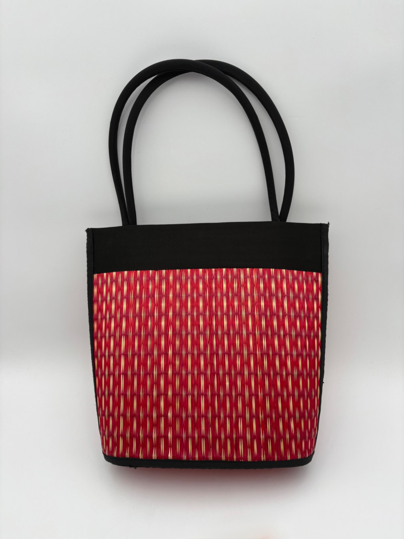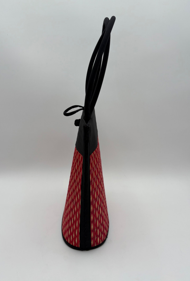 Pair of artsy purses with a hint of Asian minimalist style! Both purses have identical construction but vary in size and exterior weaving. The exterior sides and bottoms closely resemble Japanese tatami mats in weaving and rigidity. Both purses have trim at top/sides, and handles made from black fabric that closely resembles fabrics we've seen in traditional kimonos. Each has an exterior knot closure and is lined in black with interior zip close pocket and phone pocket. If they have been used, it was only minimally as they appear to be in pristine condition. No maker tags or identifying textile tags. Large purse in black & natural weave measures 13.5" H x 12.5" W at base x 6" D at base. Drop from straps to top of purse is 8.5". Smaller purse in red & natural weave measures 11" H x 10" W at base x 4.75" D at base. Drop from straps to top of purse is 8".