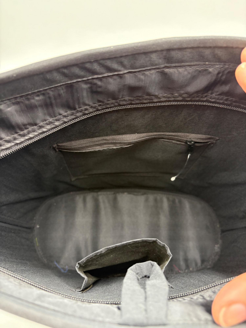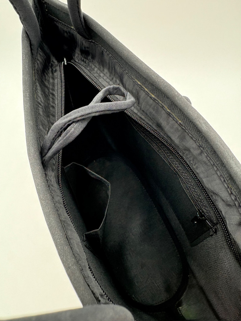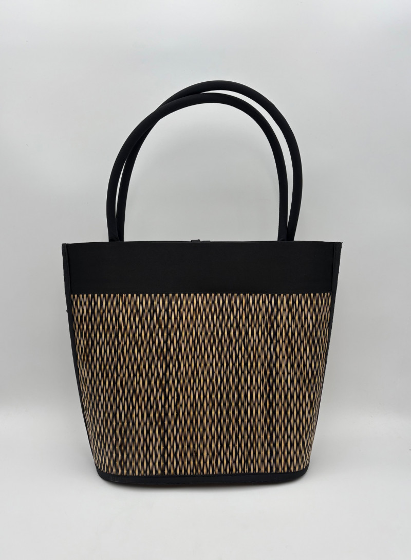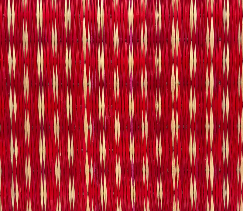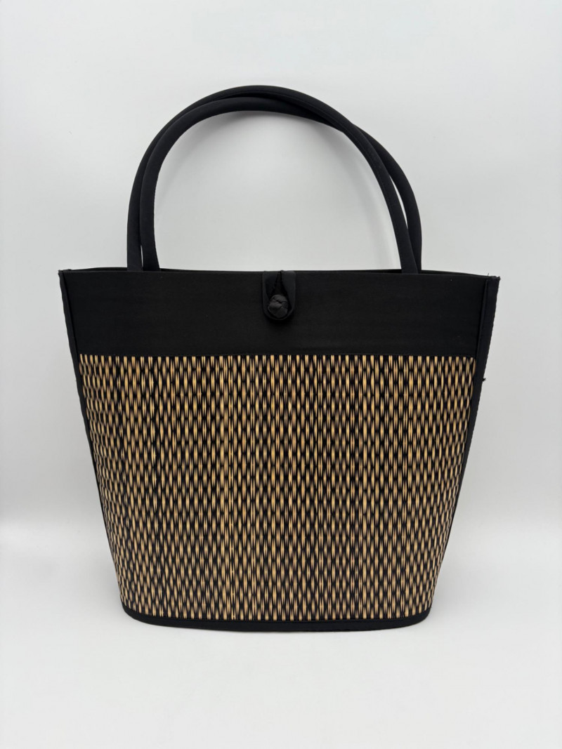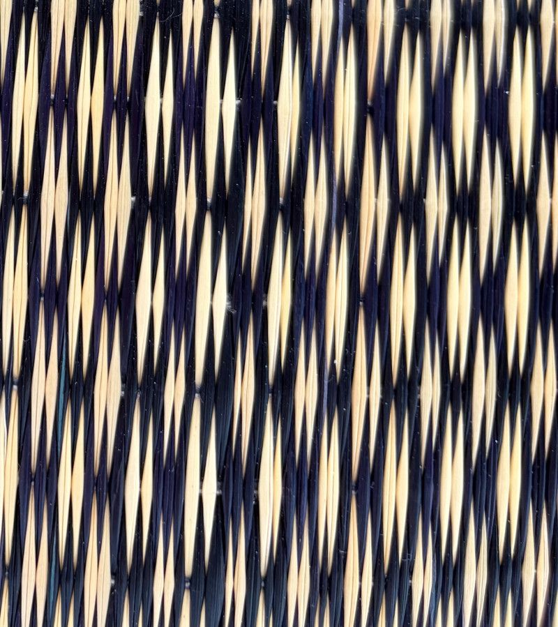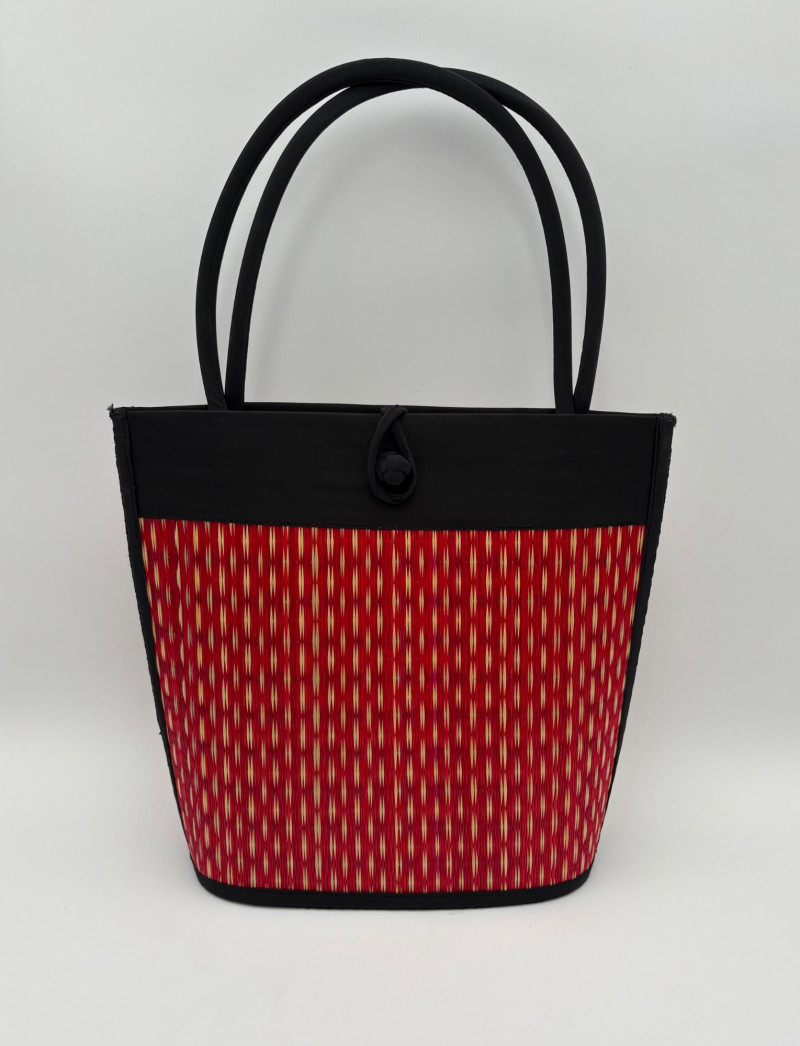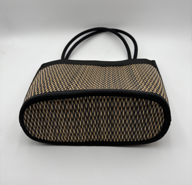 Pair of artsy purses with a hint of Asian minimalist style! Both purses have identical construction but vary in size and exterior weaving. The exterior sides and bottoms closely resemble Japanese tatami mats in weaving and rigidity. Both purses have trim at top/sides, and handles made from black fabric that closely resembles fabrics we've seen in traditional kimonos. Each has an exterior knot closure and is lined in black with interior zip close pocket and phone pocket. If they have been used, it was only minimally as they appear to be in pristine condition. No maker tags or identifying textile tags. Large purse in black & natural weave measures 13.5" H x 12.5" W at base x 6" D at base. Drop from straps to top of purse is 8.5". Smaller purse in red & natural weave measures 11" H x 10" W at base x 4.75" D at base. Drop from straps to top of purse is 8".