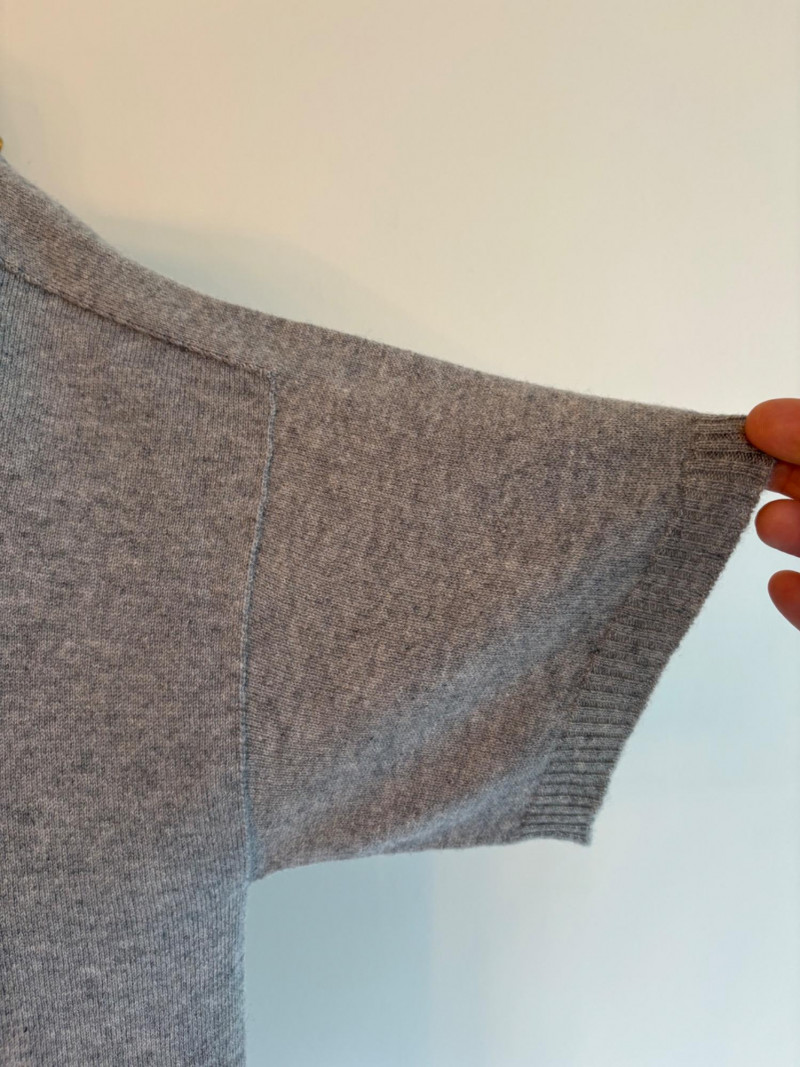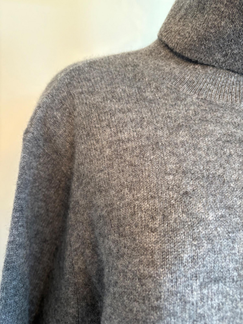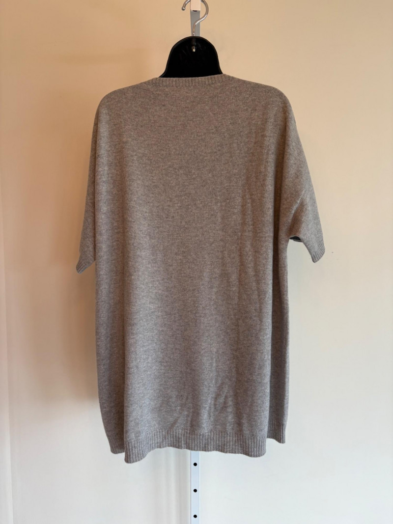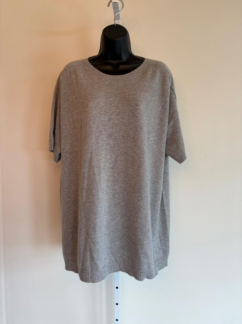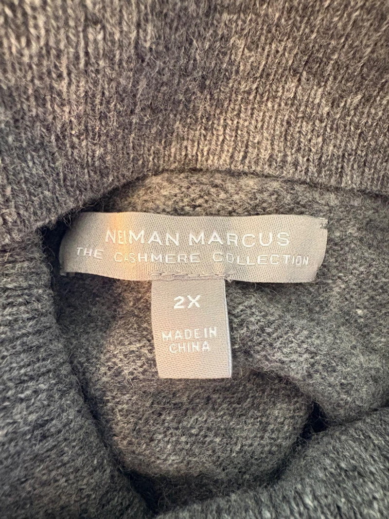 Pair of lightweight 100% cashmere sweaters in two shades of gray from Eileen Fisher and Neiman Marcus. Both measure 24.5" pit to pit. Lighter gray sweater from Eileen Fisher has short sleeves, curved neckline, and straight cut with ribbing around neckline, sleeve, and bottom hem. Size tag says L. Slightly deeper gray sweater from Neiman-Marcus has turtleneck, long sleeves, and ribbing on sleeve, hem, and neckline. Size tag says 2X.