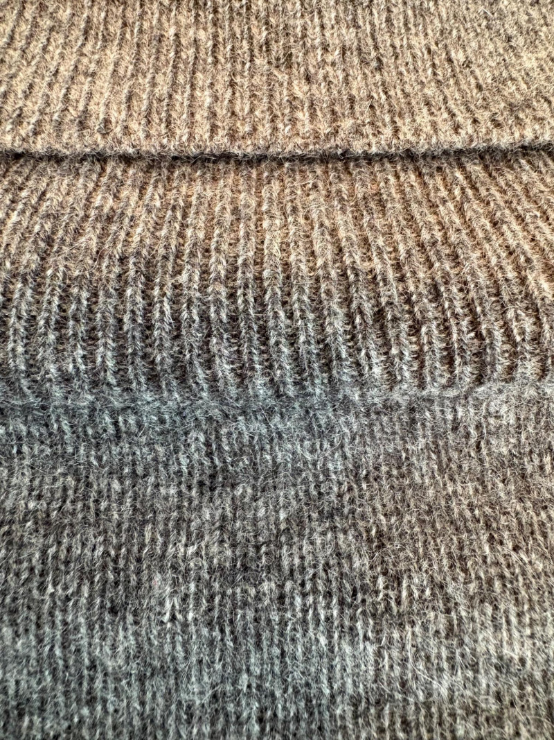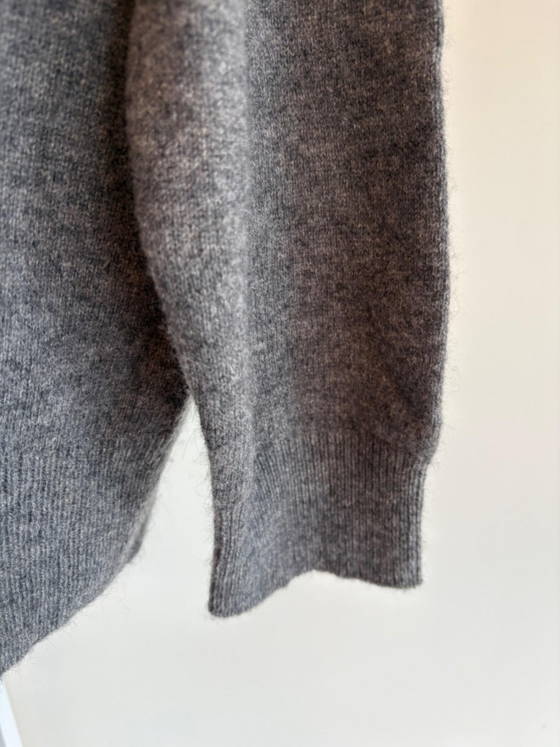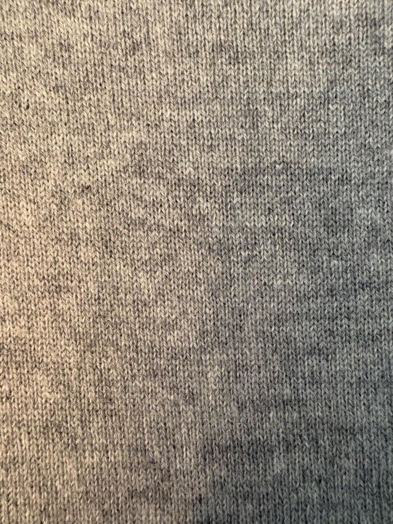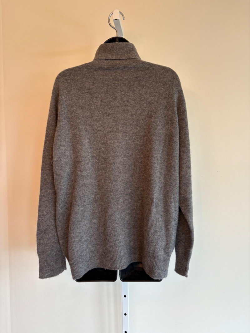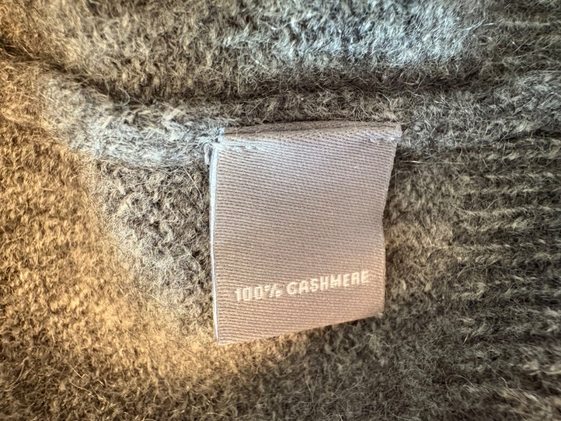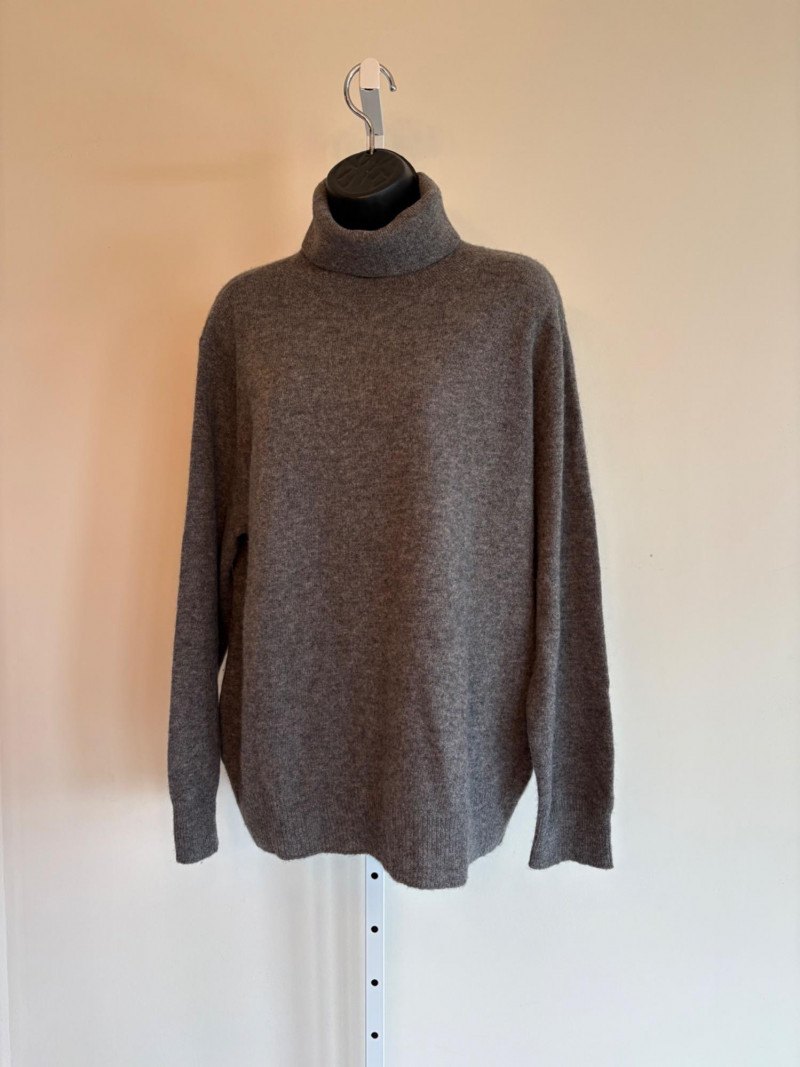 Pair of lightweight 100% cashmere sweaters in two shades of gray from Eileen Fisher and Neiman Marcus. Both measure 24.5" pit to pit. Lighter gray sweater from Eileen Fisher has short sleeves, curved neckline, and straight cut with ribbing around neckline, sleeve, and bottom hem. Size tag says L. Slightly deeper gray sweater from Neiman-Marcus has turtleneck, long sleeves, and ribbing on sleeve, hem, and neckline. Size tag says 2X.