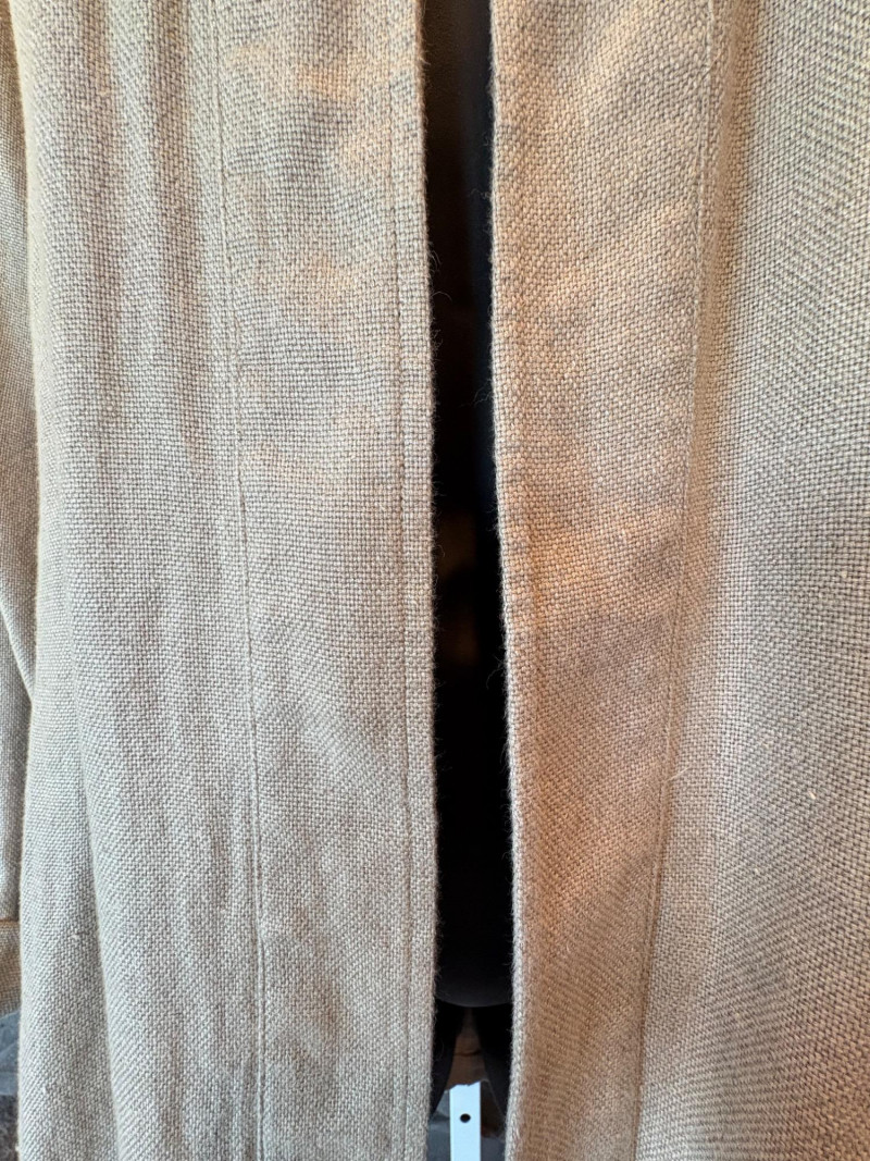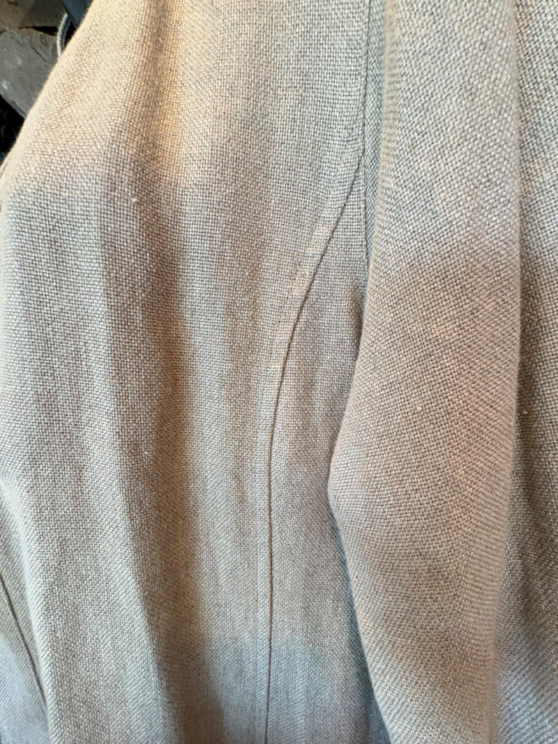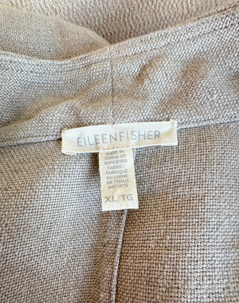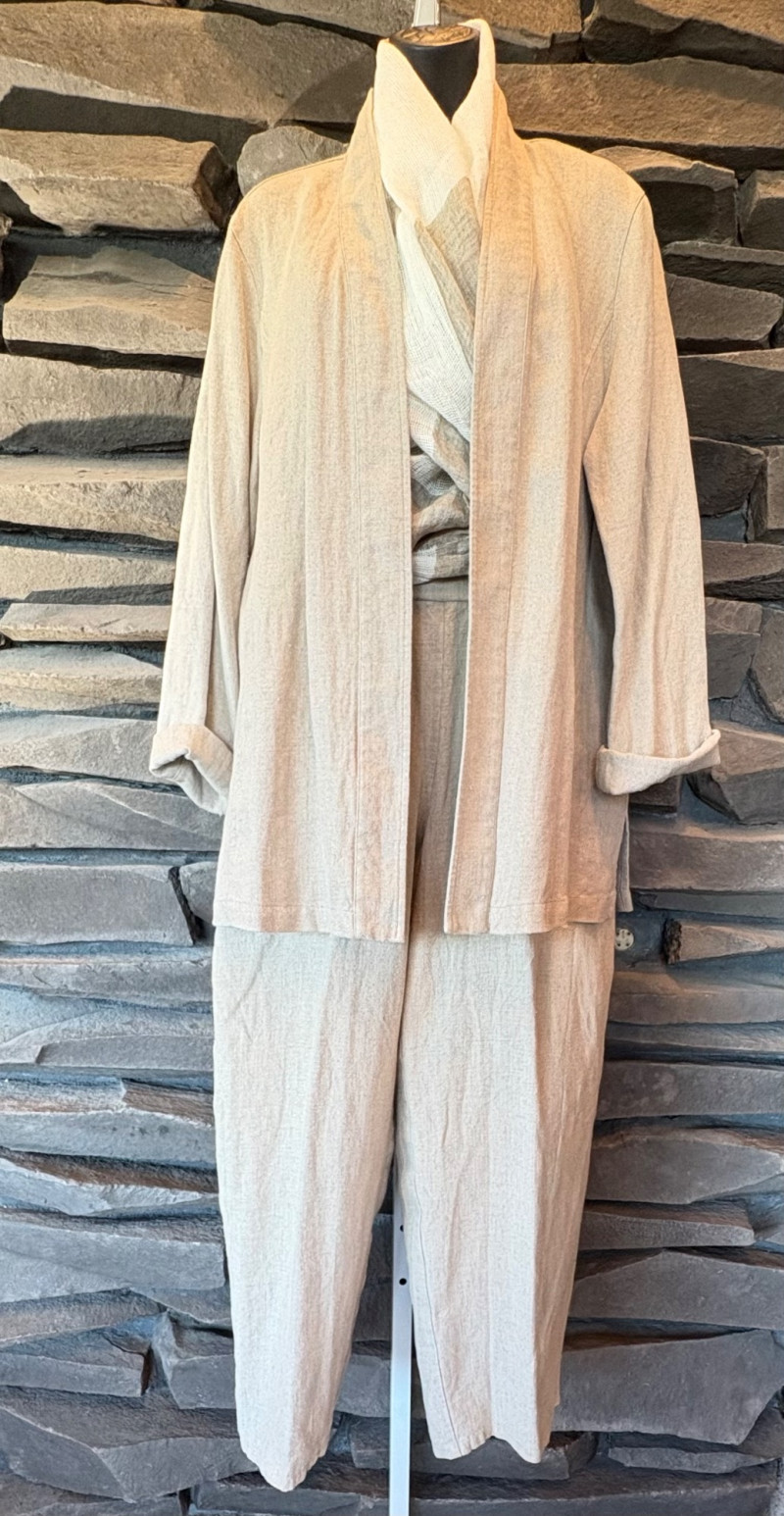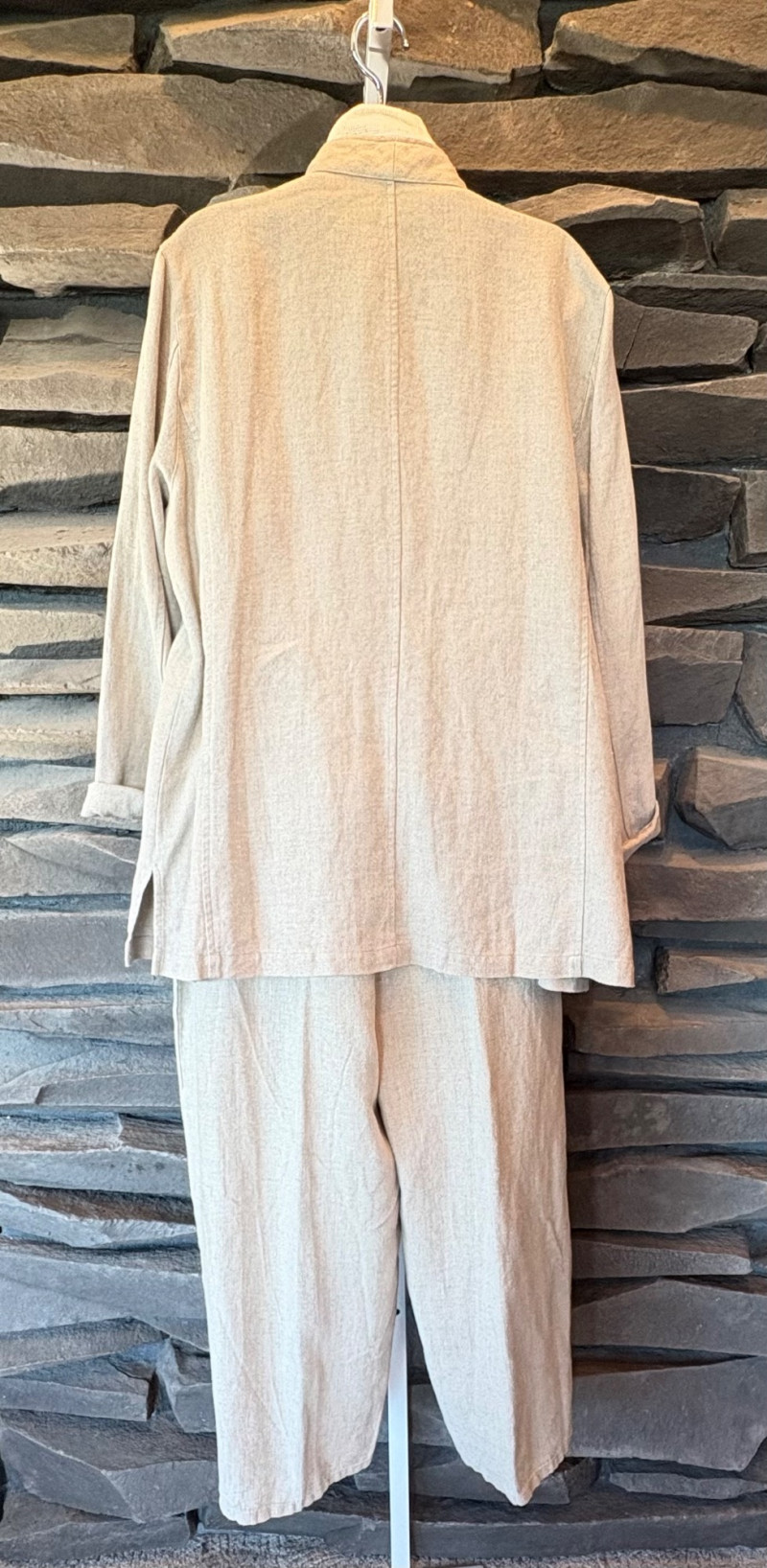 2-piece taupe linen suit from Eileen Fisher plus matching scarf. Longer jacket has front band facing, princess seams with front in-seam pockets, two-piece sleeve construction, and split hem. but has facing behind the pockets of the inside. Jacket is unlined. 100% organic linen. Measures 23" pit to pit and 29" from neckline to back hem. Size tag says XL. Matching linen pants have flat-fit waistband in front with elasticated back and set-in side pockets. 100% organic linen. Measure 20" side to side at waist. Size tag says XL. Paired with cream and taupe striped scarf. Measures approximately 78" x 27“. No maker or content tag, but appears to be cotton and linen mix.