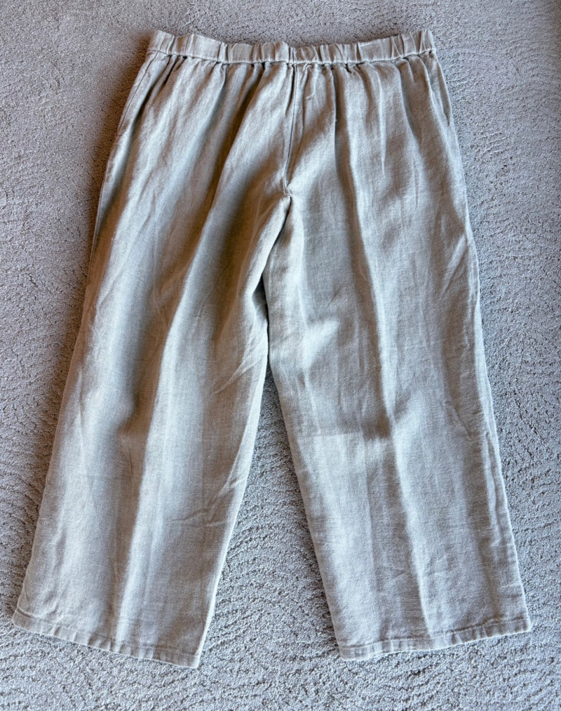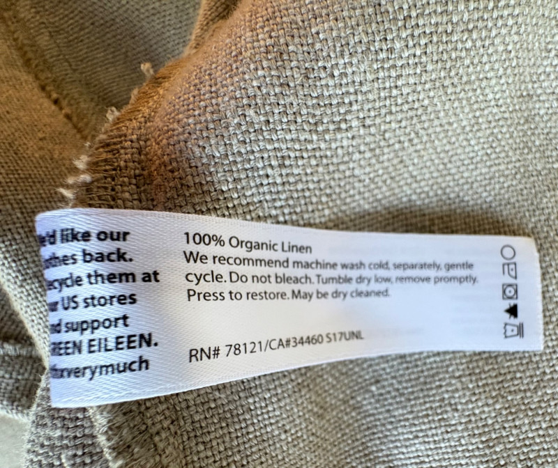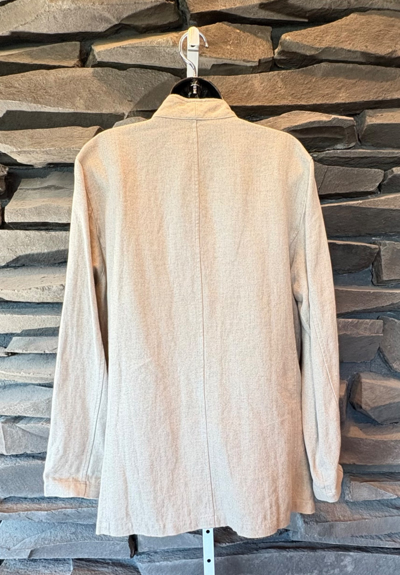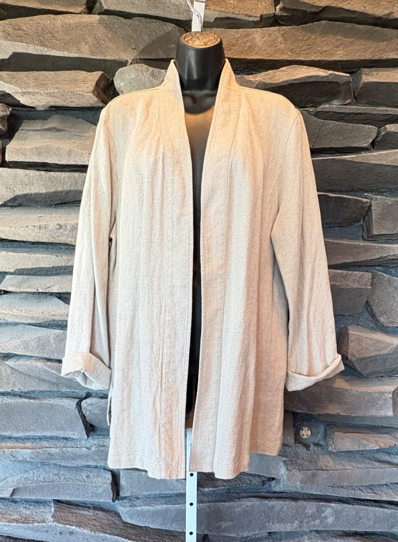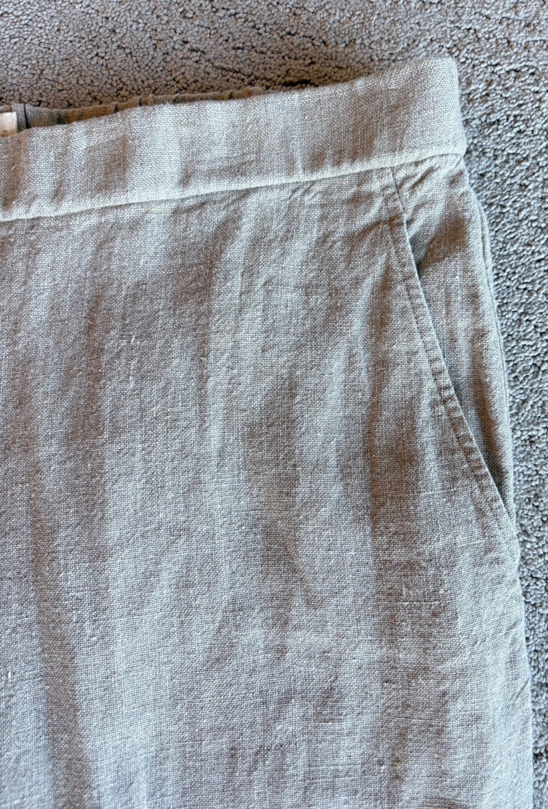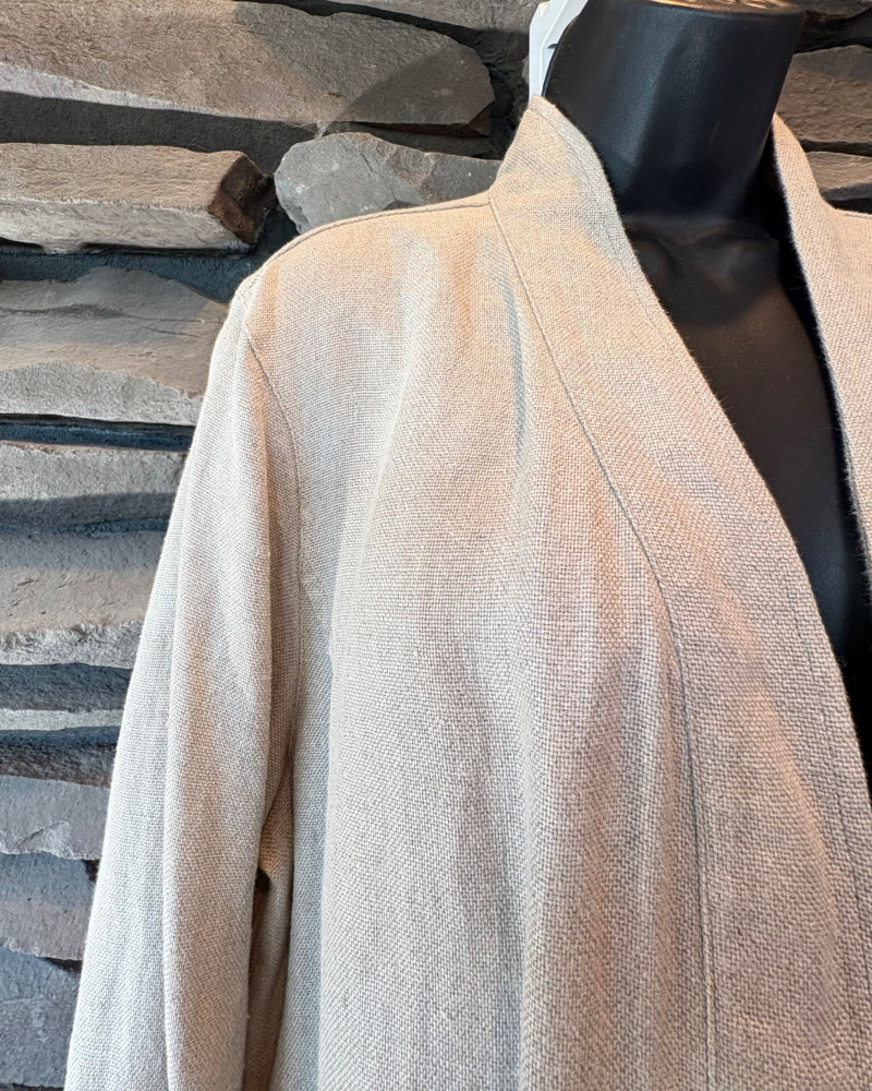 2-piece taupe linen suit from Eileen Fisher plus matching scarf. Longer jacket has front band facing, princess seams with front in-seam pockets, two-piece sleeve construction, and split hem. but has facing behind the pockets of the inside. Jacket is unlined. 100% organic linen. Measures 23" pit to pit and 29" from neckline to back hem. Size tag says XL. Matching linen pants have flat-fit waistband in front with elasticated back and set-in side pockets. 100% organic linen. Measure 20" side to side at waist. Size tag says XL. Paired with cream and taupe striped scarf. Measures approximately 78" x 27“. No maker or content tag, but appears to be cotton and linen mix.