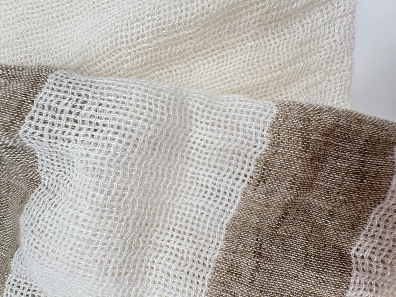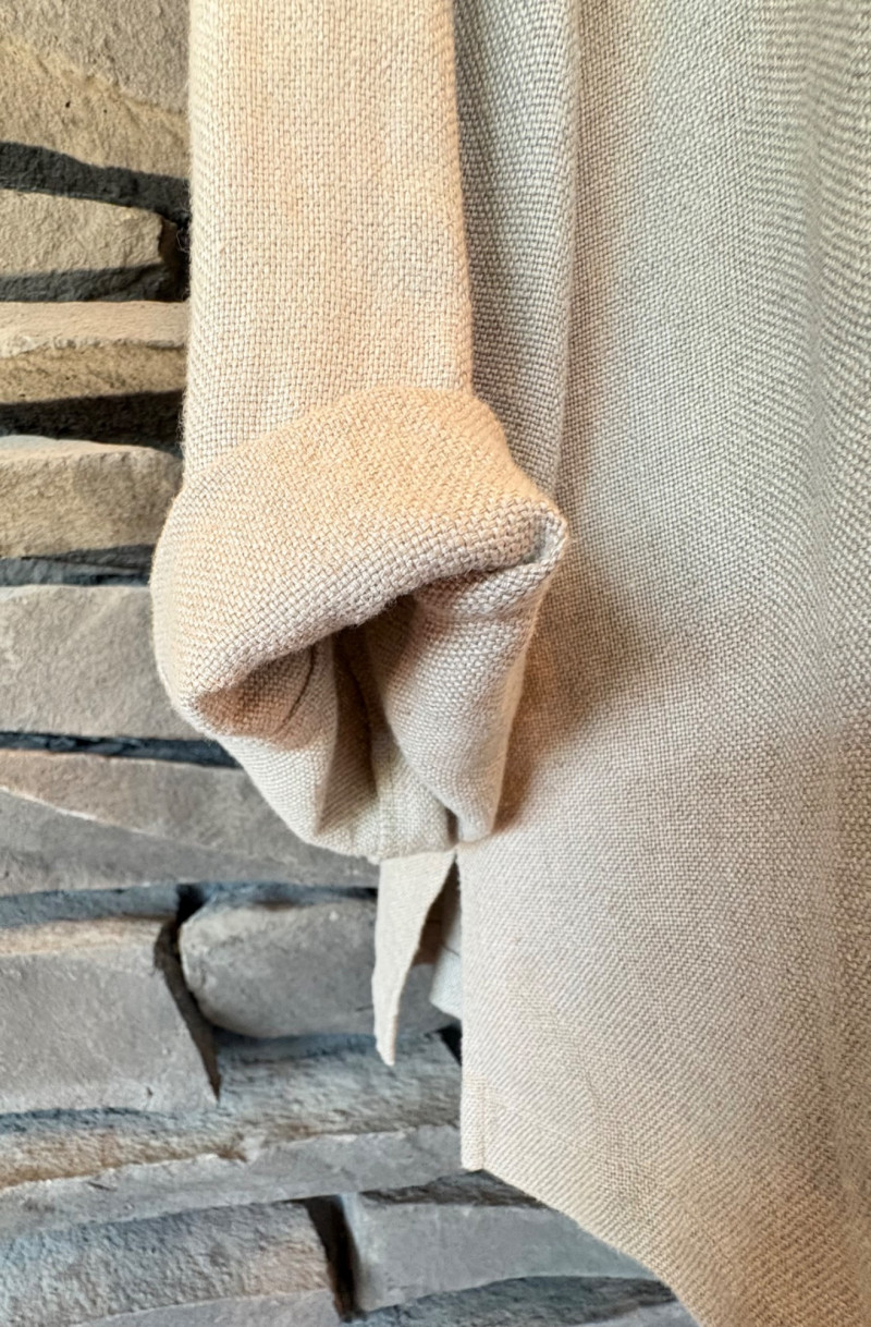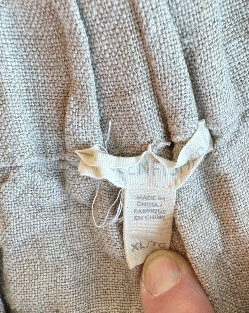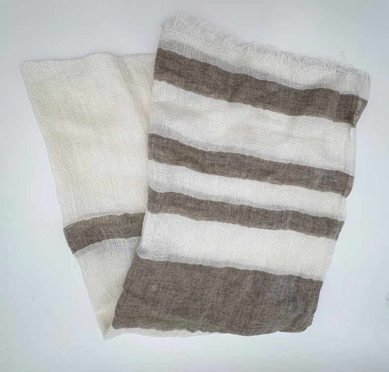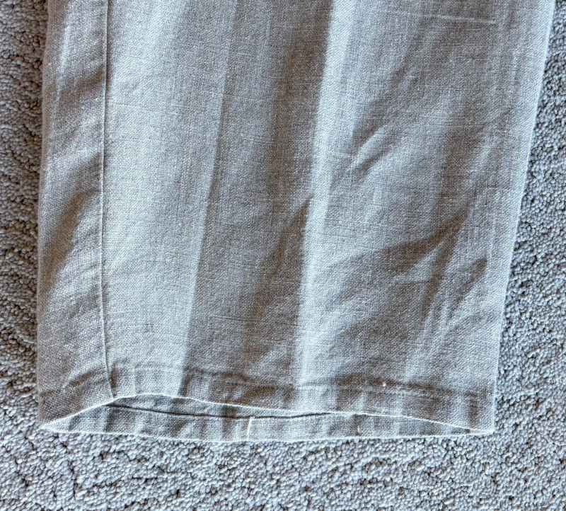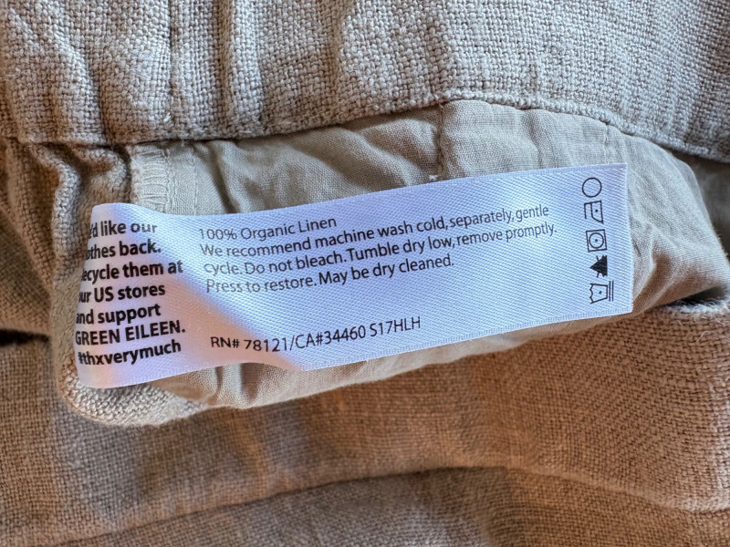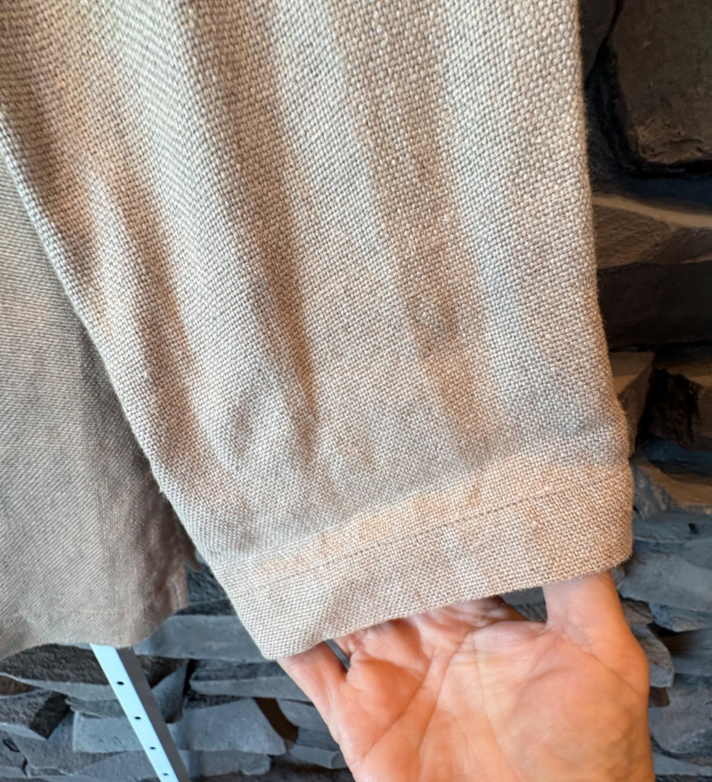 2-piece taupe linen suit from Eileen Fisher plus matching scarf. Longer jacket has front band facing, princess seams with front in-seam pockets, two-piece sleeve construction, and split hem. but has facing behind the pockets of the inside. Jacket is unlined. 100% organic linen. Measures 23" pit to pit and 29" from neckline to back hem. Size tag says XL. Matching linen pants have flat-fit waistband in front with elasticated back and set-in side pockets. 100% organic linen. Measure 20" side to side at waist. Size tag says XL. Paired with cream and taupe striped scarf. Measures approximately 78" x 27“. No maker or content tag, but appears to be cotton and linen mix.