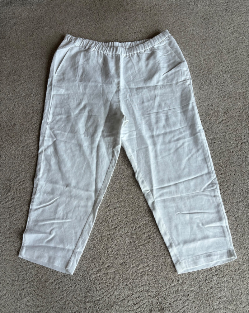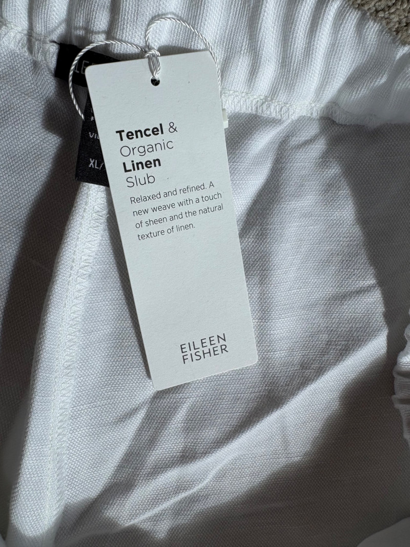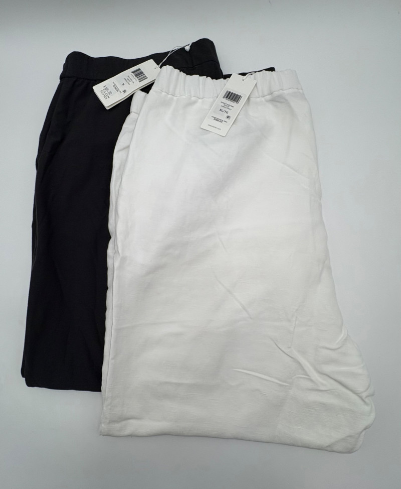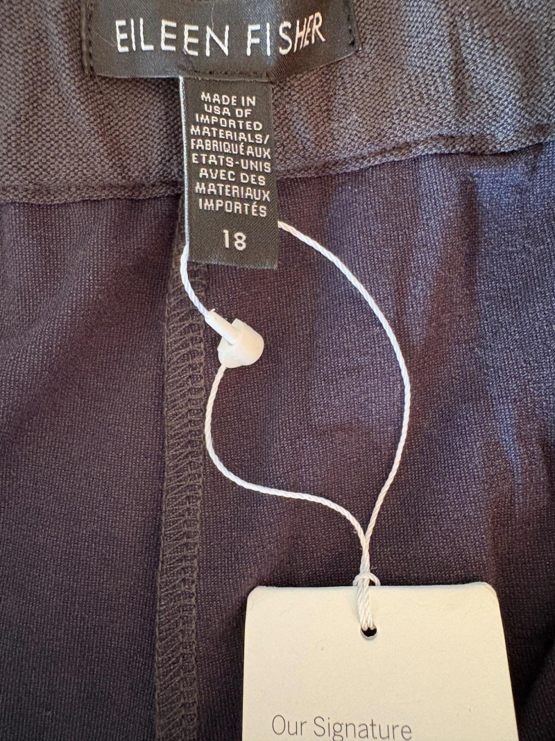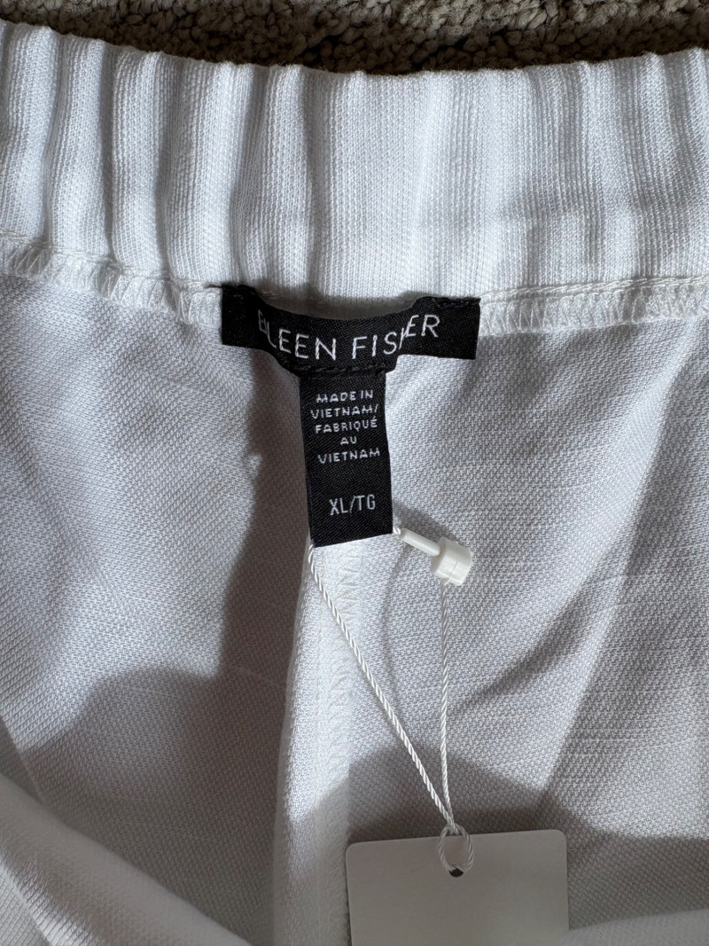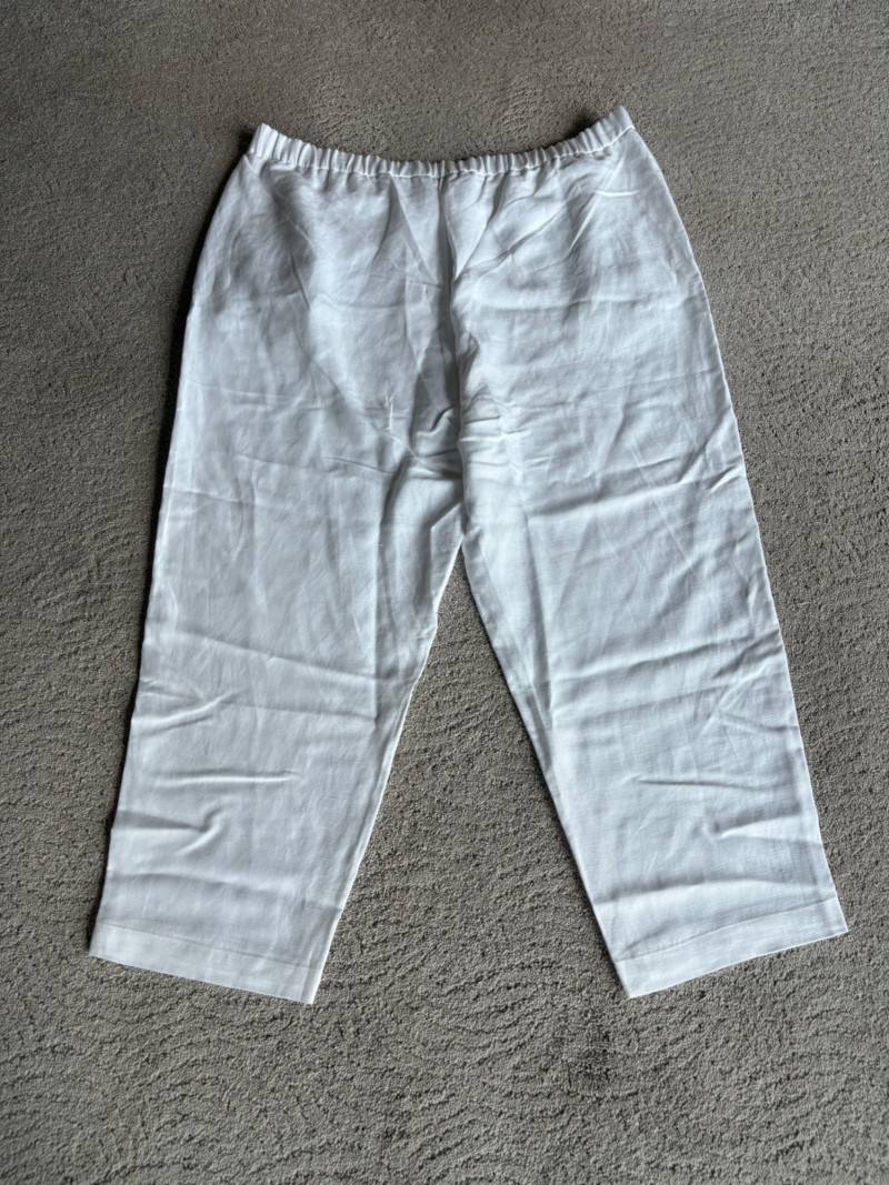 Two pairs of wonderfully neutral pants in different fibers from Eileen Fisher. Both are new with tag, and measure 19" side to side at waist. White pair has elasticated waistband, set- in front pockets, and appear to be slightly cropped with a 24" inseam. Lyocell/linen blend. Size tag says XL. Grey knit pair has flat waistband with slight elastication in back, button/zip fly, set-in front pockets and wide legs. Viscose/nylon/spandex crêpe blend. (Inseam on this pair is 27"). Size tag says 18.