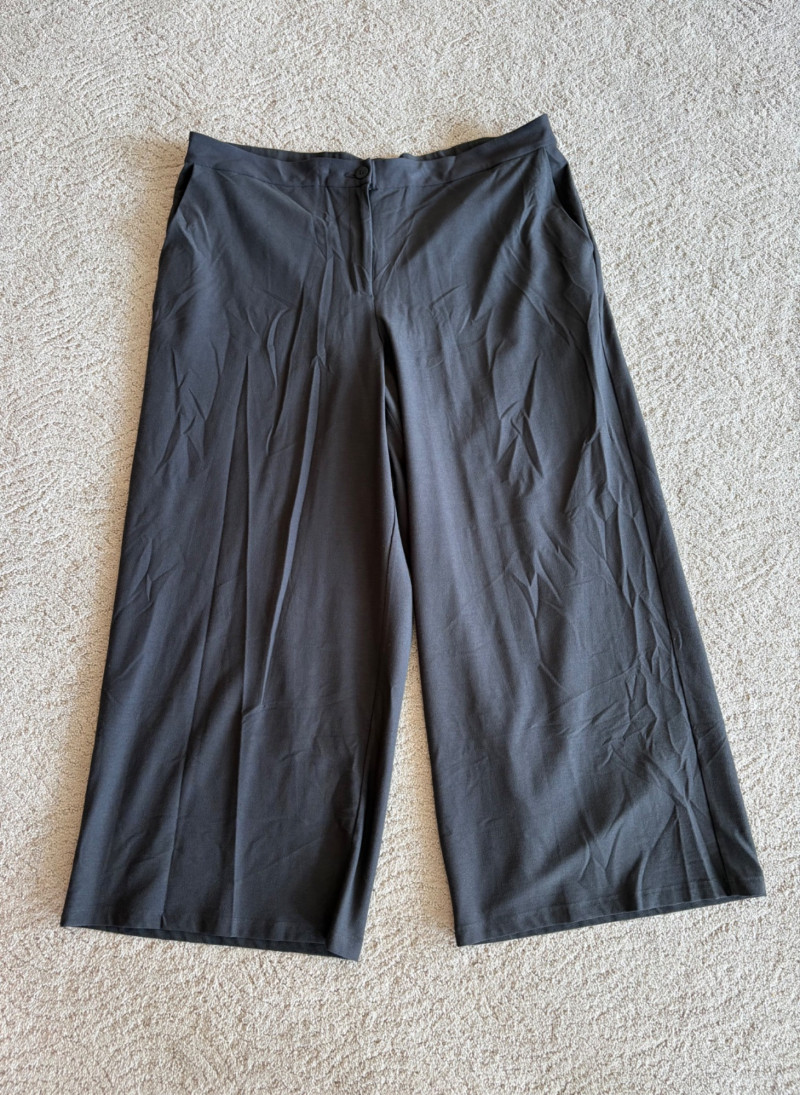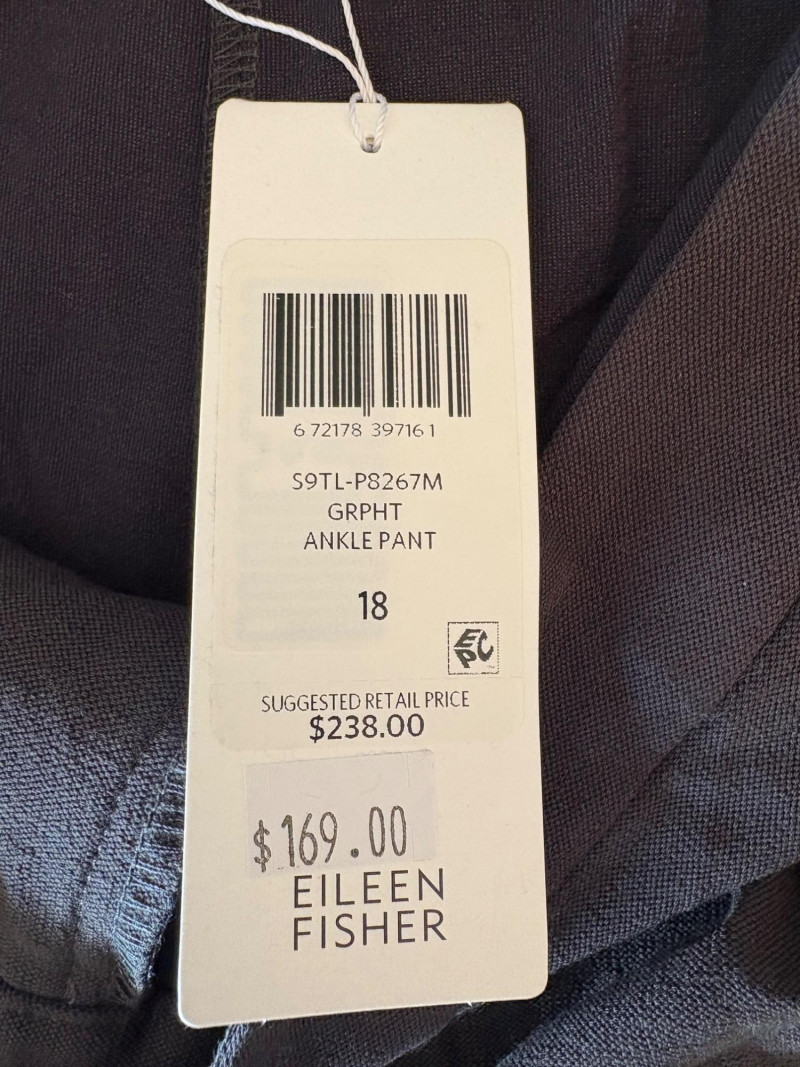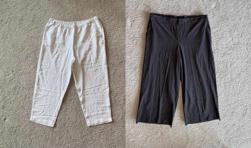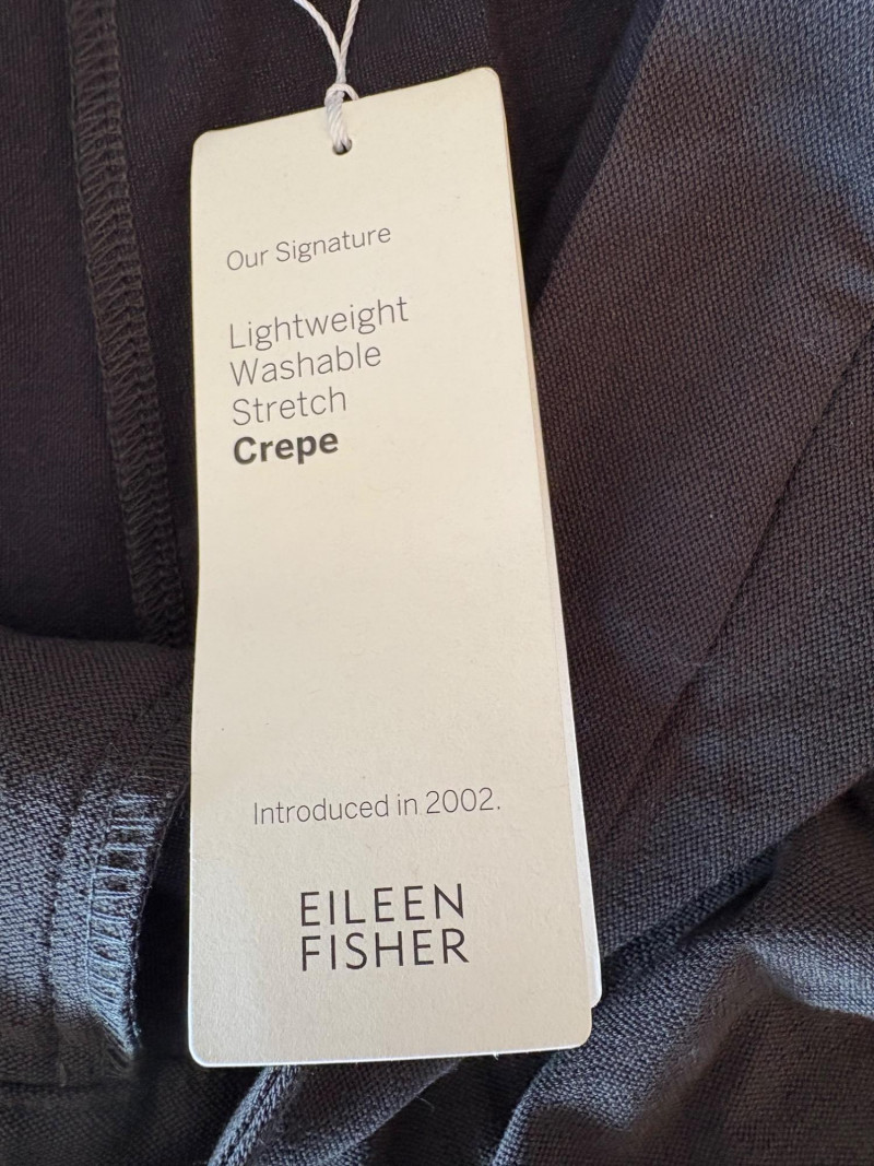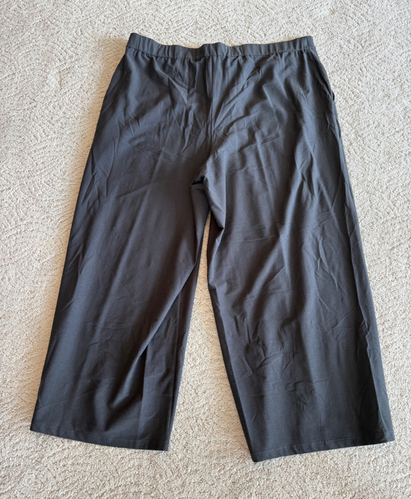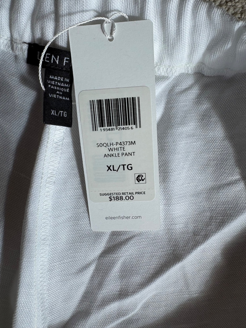 Two pairs of wonderfully neutral pants in different fibers from Eileen Fisher. Both are new with tag, and measure 19" side to side at waist. White pair has elasticated waistband, set- in front pockets, and appear to be slightly cropped with a 24" inseam. Lyocell/linen blend. Size tag says XL. Grey knit pair has flat waistband with slight elastication in back, button/zip fly, set-in front pockets and wide legs. Viscose/nylon/spandex crêpe blend. (Inseam on this pair is 27"). Size tag says 18.