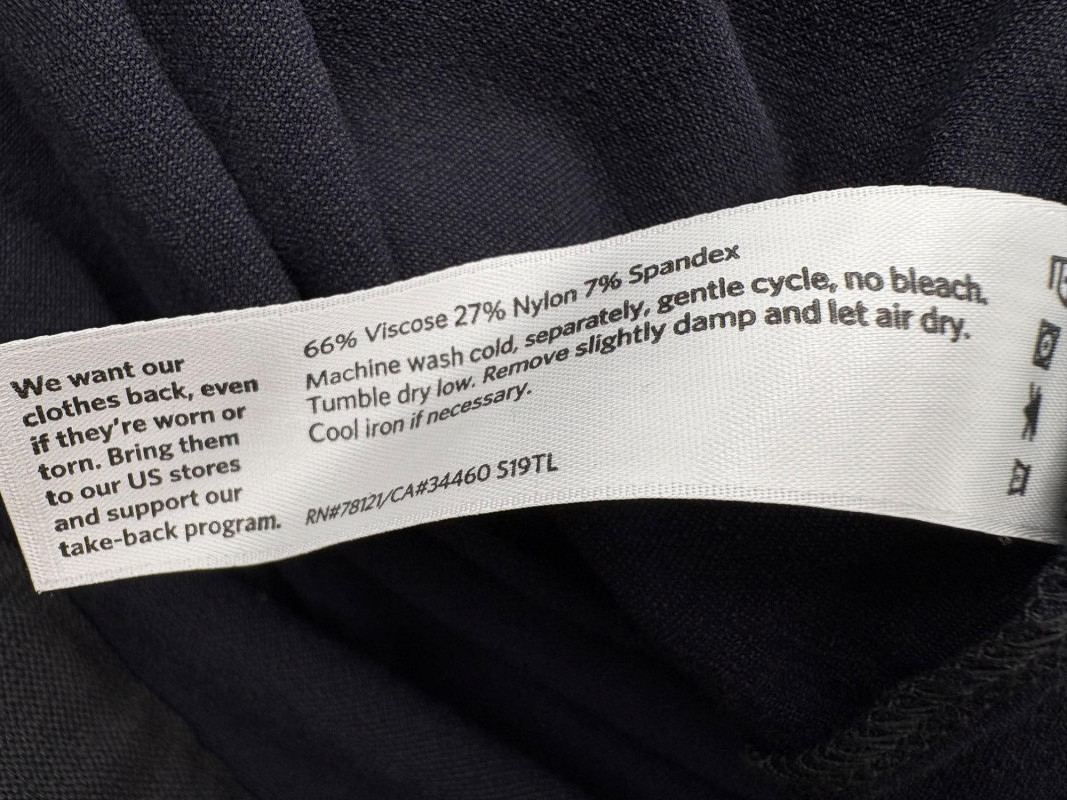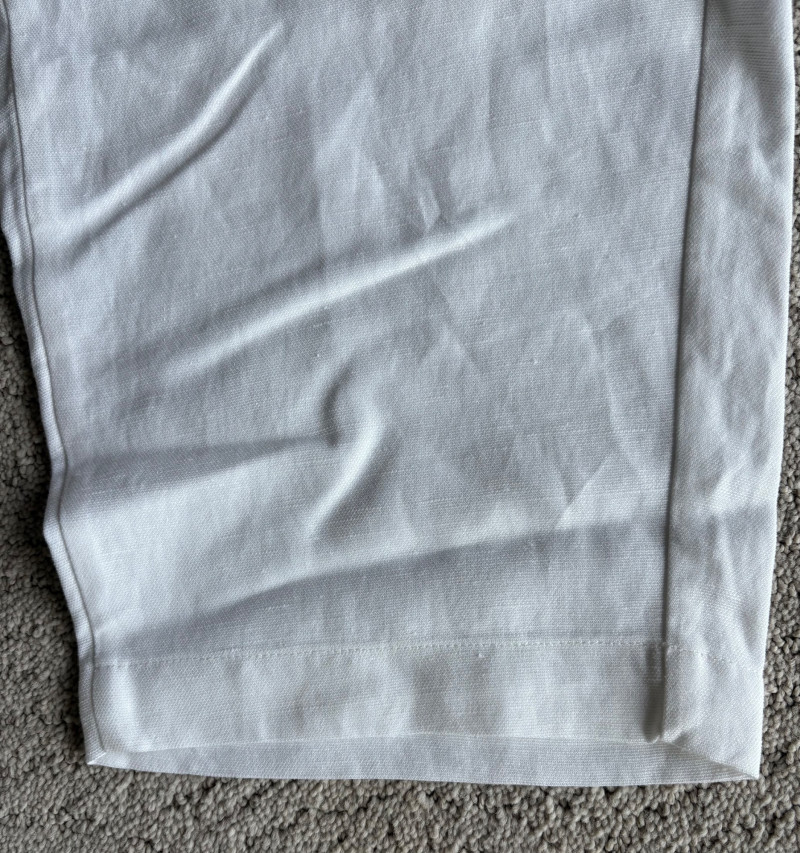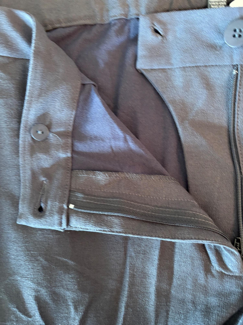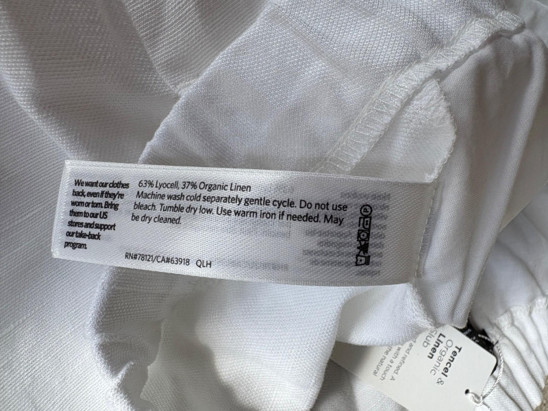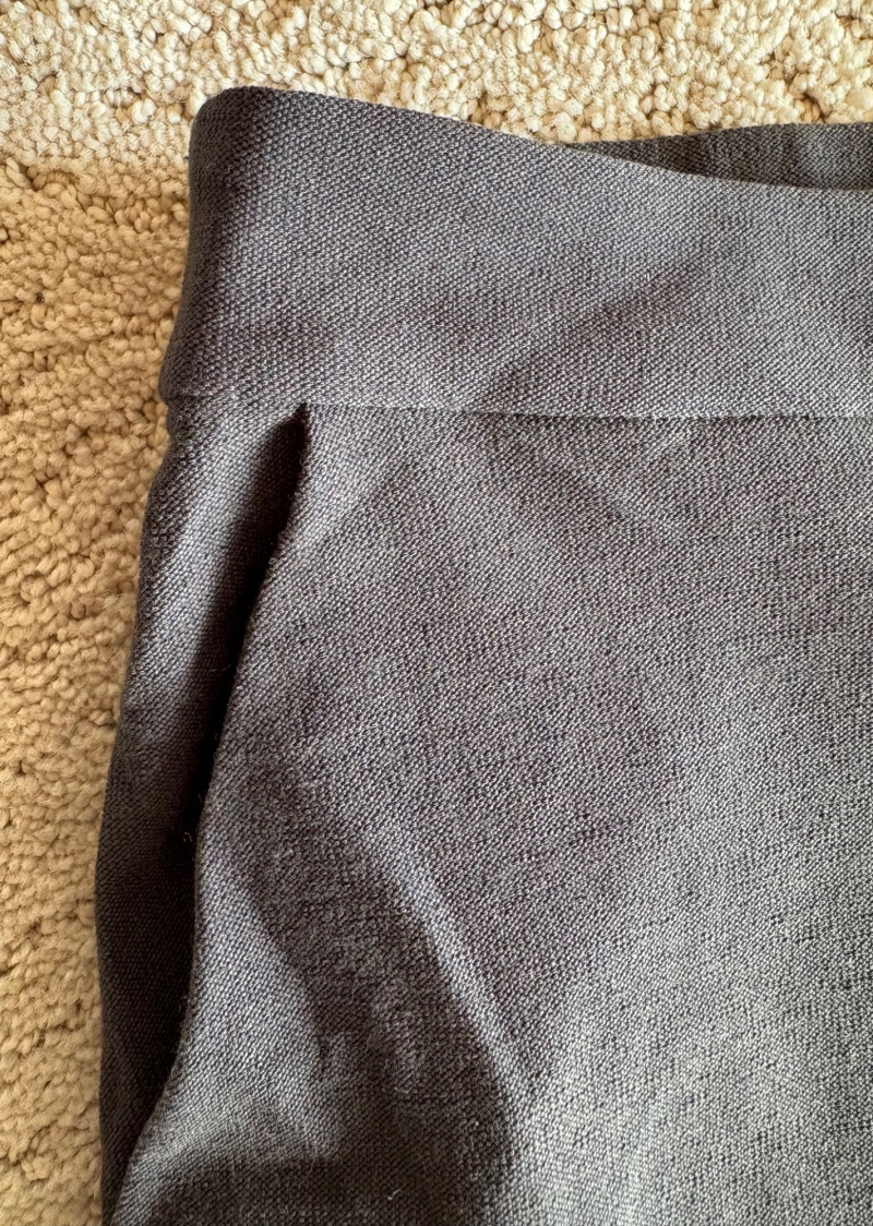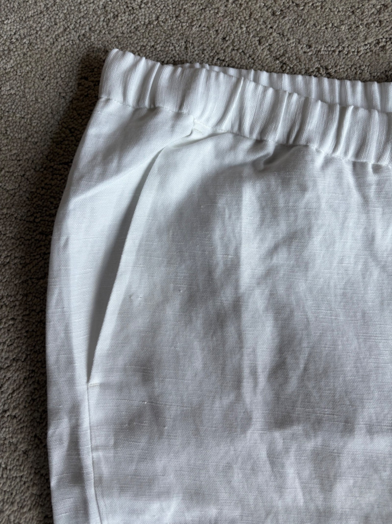 Two pairs of wonderfully neutral pants in different fibers from Eileen Fisher. Both are new with tag, and measure 19" side to side at waist. White pair has elasticated waistband, set- in front pockets, and appear to be slightly cropped with a 24" inseam. Lyocell/linen blend. Size tag says XL. Grey knit pair has flat waistband with slight elastication in back, button/zip fly, set-in front pockets and wide legs. Viscose/nylon/spandex crêpe blend. (Inseam on this pair is 27"). Size tag says 18.