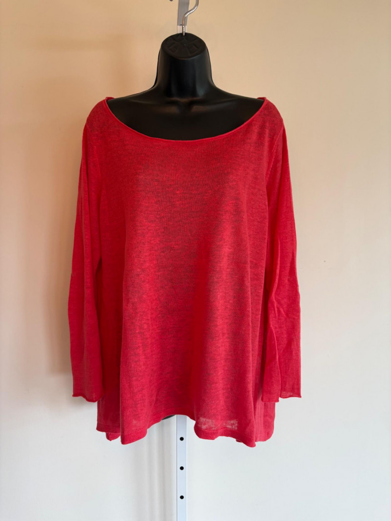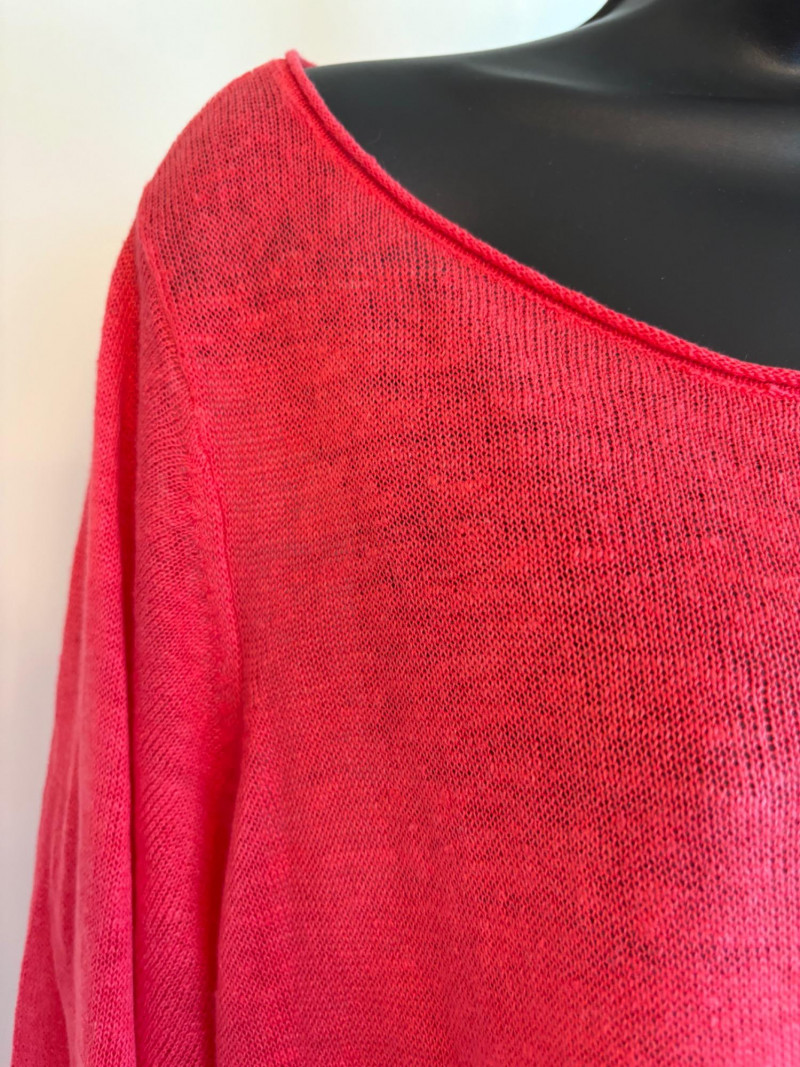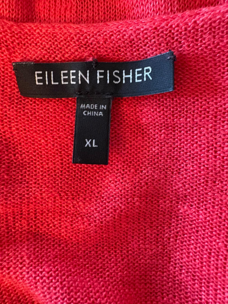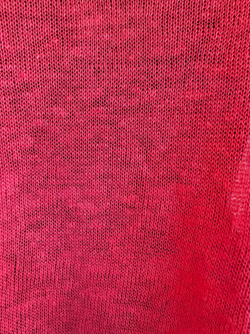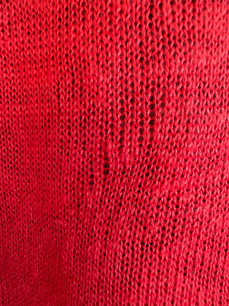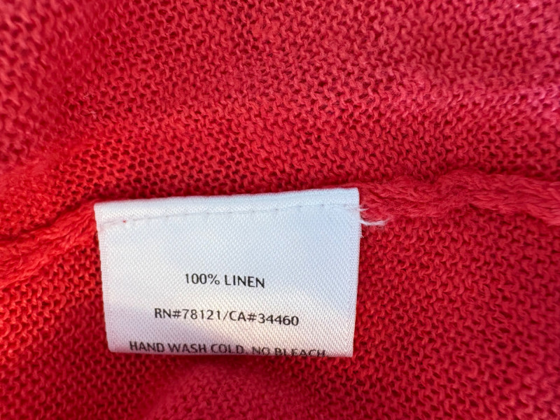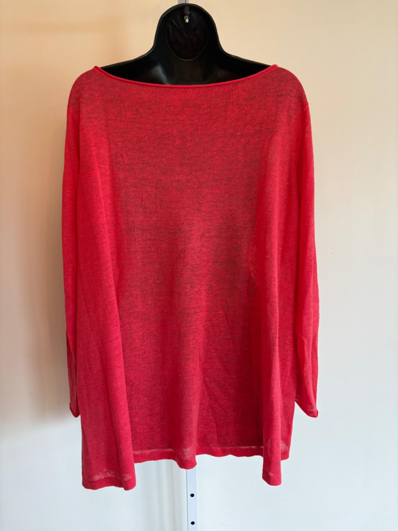 Three beautiful lightweight sweaters for the fall or spring transitional season. All three measure 24" pit to pit. Pale beige sweater from Poetry has banded curved neckline, asymmetrical hem with points, and contrast-weave sleeves & hem section. 100% linen. Size tag says 18. Midnight blue cashmere sweater from Eileen Fisher is minimalism at its best with asymmetrical hem, two-piece construction, 3/4 length sleeves. and slight ribbing on sleeve cuffs & hem. 100% cashmere. Size tag says M. Red lightweight sweater from Eileen Fisher has round neck with rolled hem on neckline and sleeve ends. Bottom hem is ribbed and shorter in the front than the back. 100% linen. Size tax says XL. Note that there is a pull on the back left of the sweater as well as some places where the weave has been pulled on the back; these wouldn't show with a jacket - see last 2 photos..