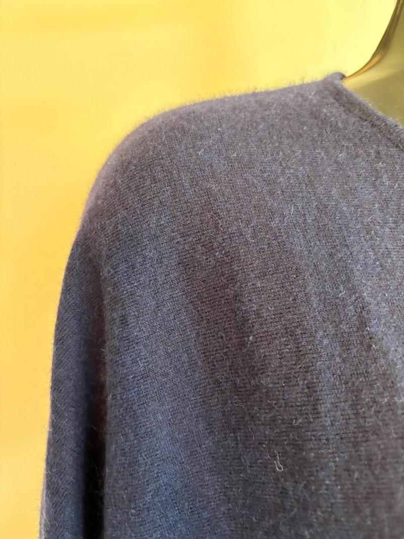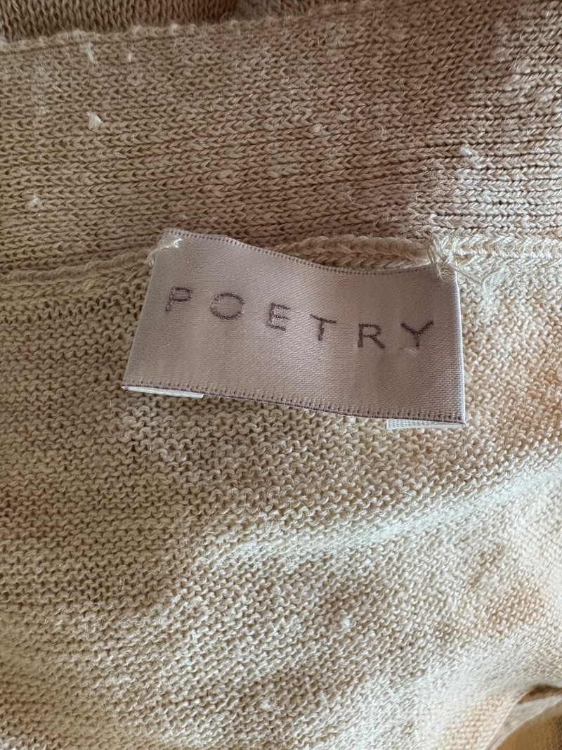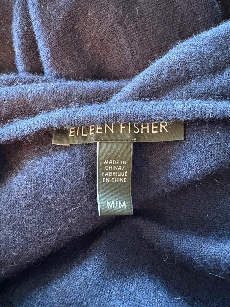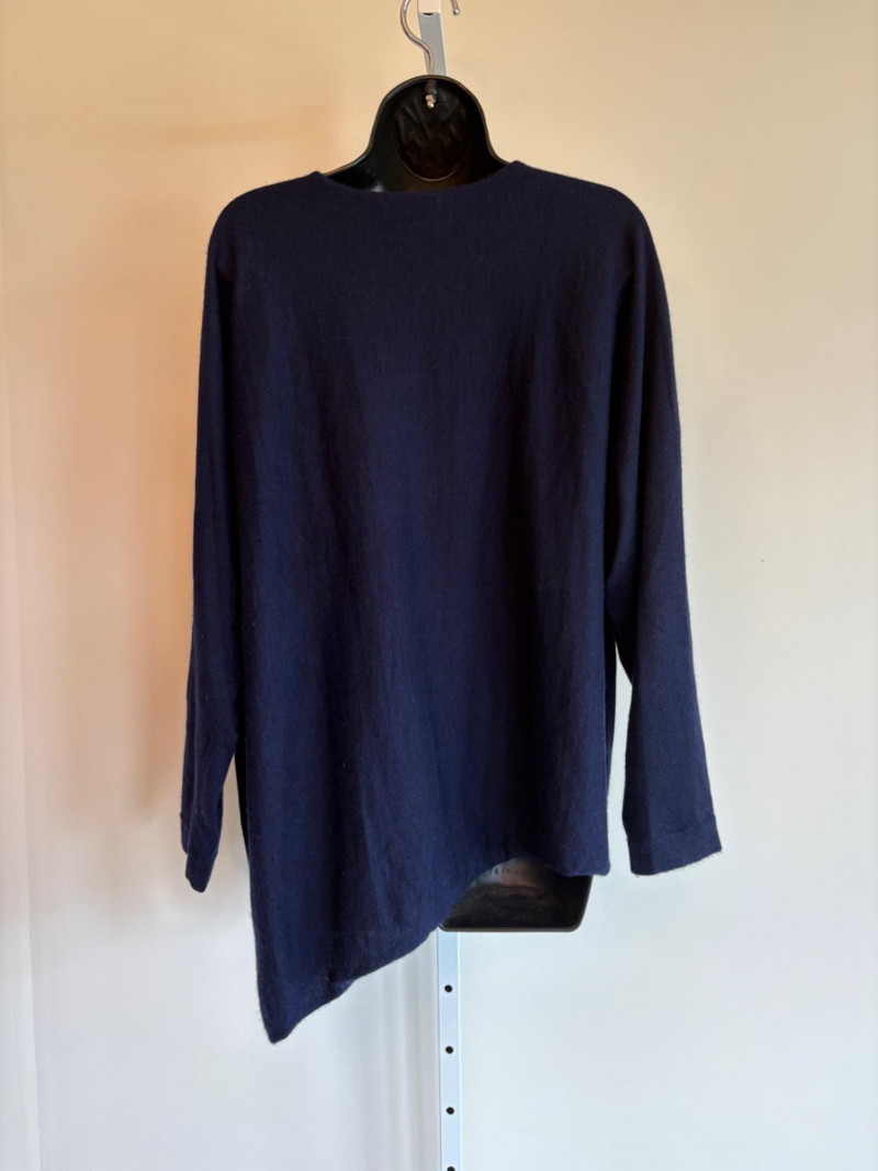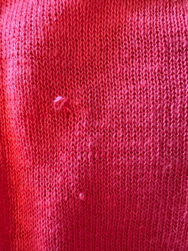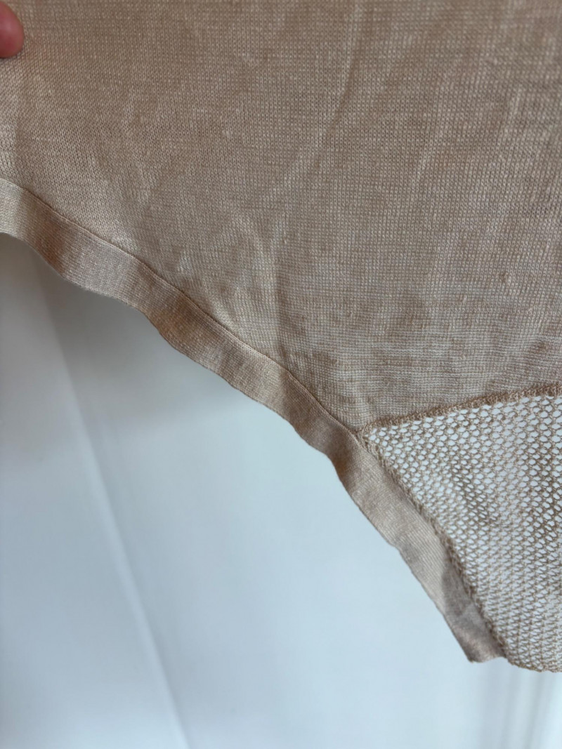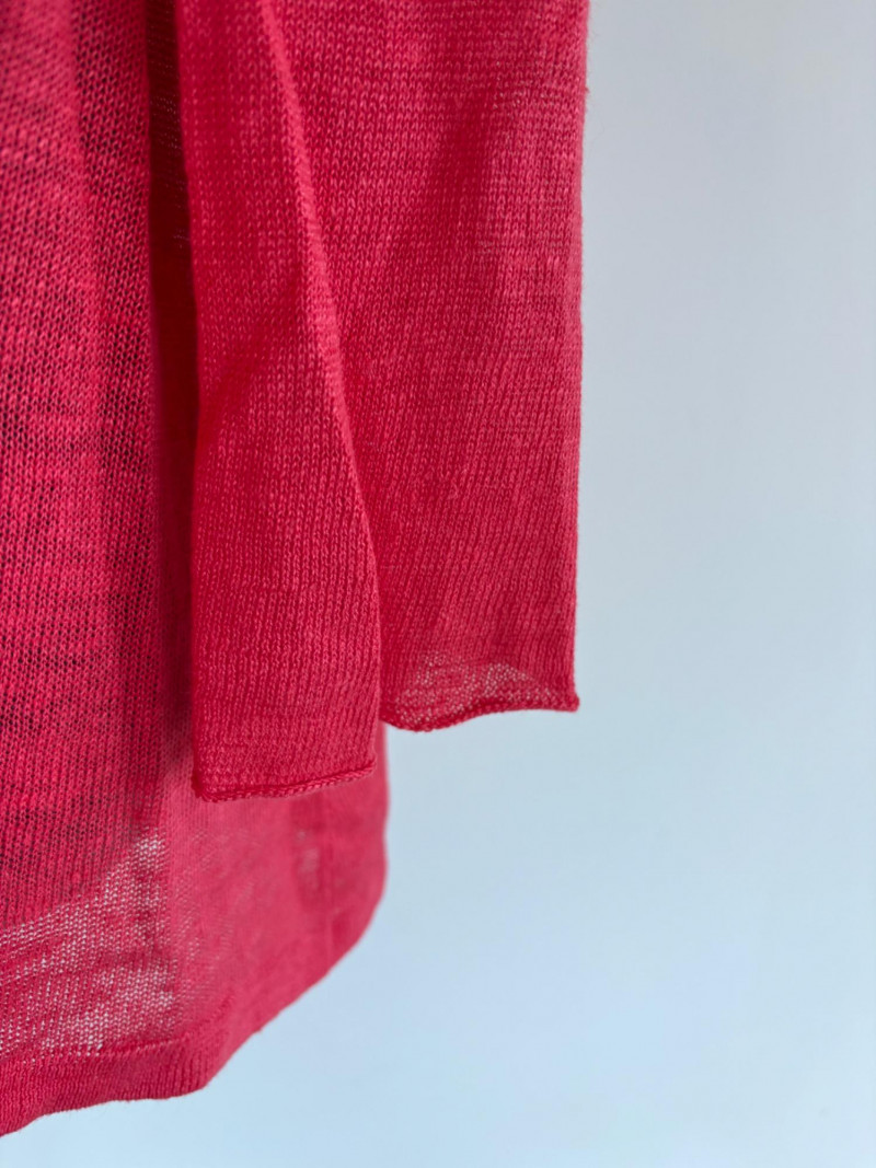 Three beautiful lightweight sweaters for the fall or spring transitional season. All three measure 24" pit to pit. Pale beige sweater from Poetry has banded curved neckline, asymmetrical hem with points, and contrast-weave sleeves & hem section. 100% linen. Size tag says 18. Midnight blue cashmere sweater from Eileen Fisher is minimalism at its best with asymmetrical hem, two-piece construction, 3/4 length sleeves. and slight ribbing on sleeve cuffs & hem. 100% cashmere. Size tag says M. Red lightweight sweater from Eileen Fisher has round neck with rolled hem on neckline and sleeve ends. Bottom hem is ribbed and shorter in the front than the back. 100% linen. Size tax says XL. Note that there is a pull on the back left of the sweater as well as some places where the weave has been pulled on the back; these wouldn't show with a jacket - see last 2 photos..