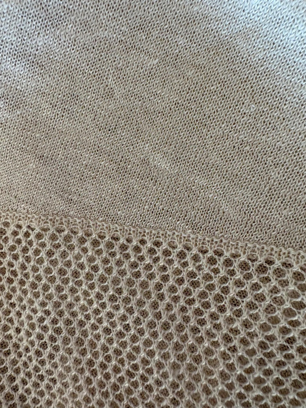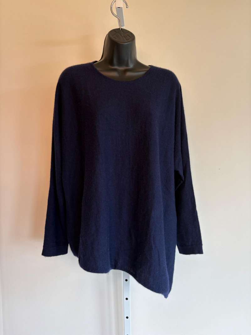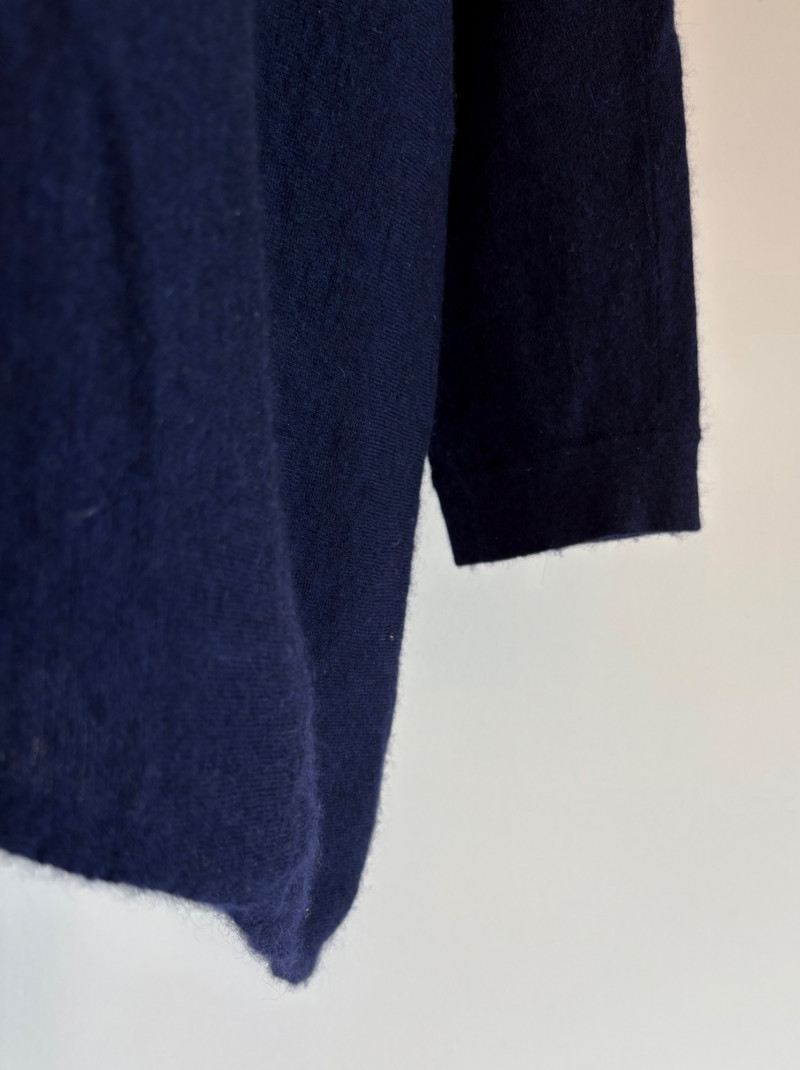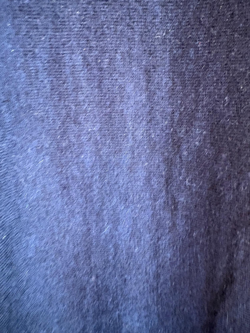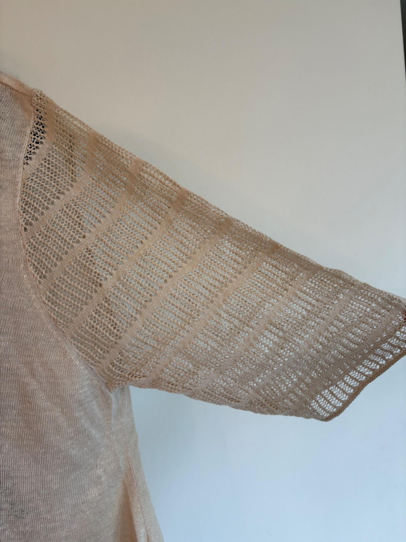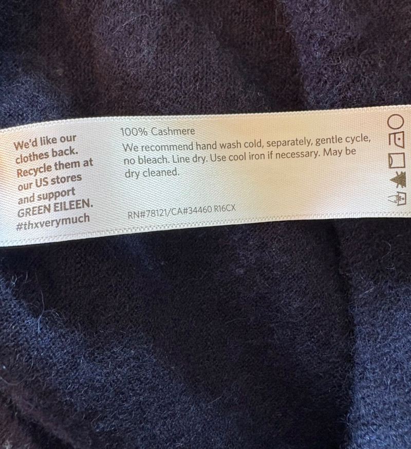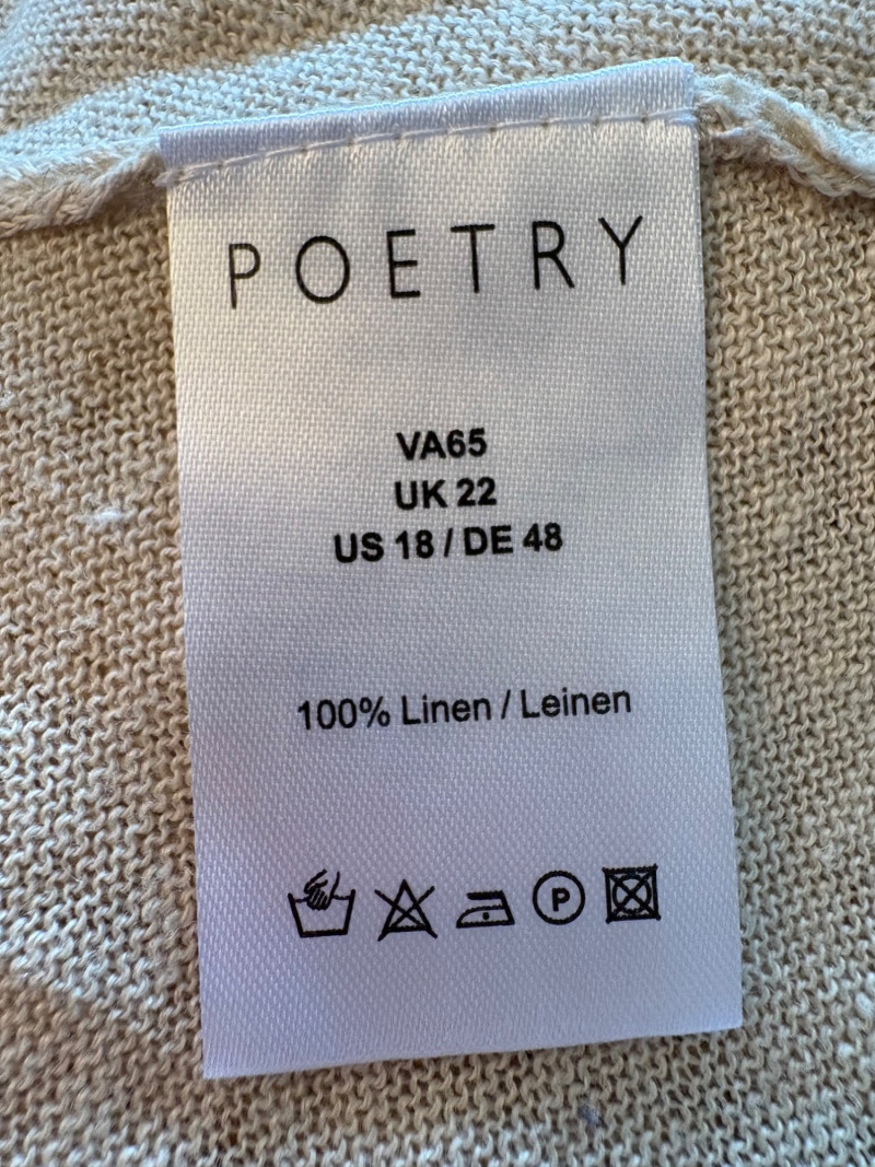Three beautiful lightweight sweaters for the fall or spring transitional season. All three measure 24" pit to pit. Pale beige sweater from Poetry has banded curved neckline, asymmetrical hem with points, and contrast-weave sleeves & hem section. 100% linen. Size tag says 18. Midnight blue cashmere sweater from Eileen Fisher is minimalism at its best with asymmetrical hem, two-piece construction, 3/4 length sleeves. and slight ribbing on sleeve cuffs & hem. 100% cashmere. Size tag says M. Red lightweight sweater from Eileen Fisher has round neck with rolled hem on neckline and sleeve ends. Bottom hem is ribbed and shorter in the front than the back. 100% linen. Size tax says XL. Note that there is a pull on the back left of the sweater as well as some places where the weave has been pulled on the back; these wouldn't show with a jacket - see last 2 photos..