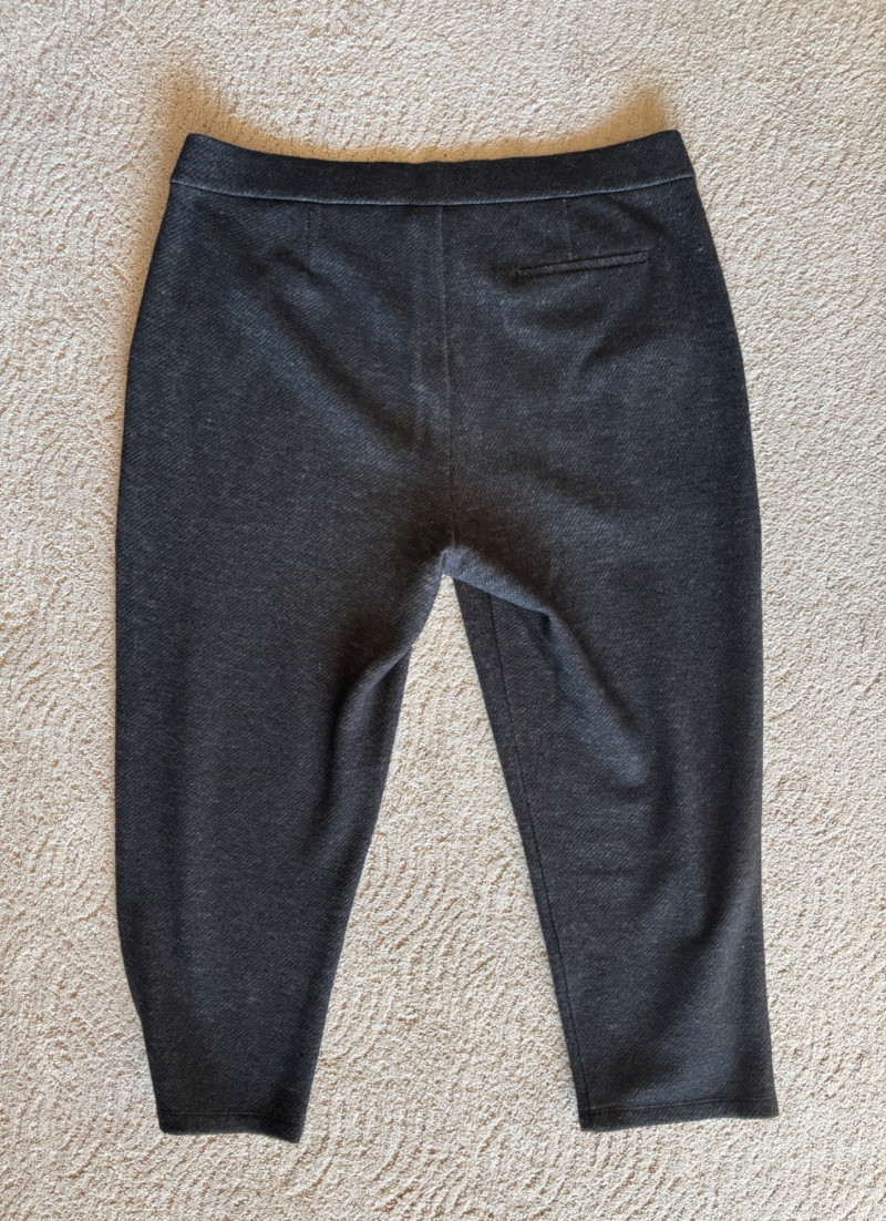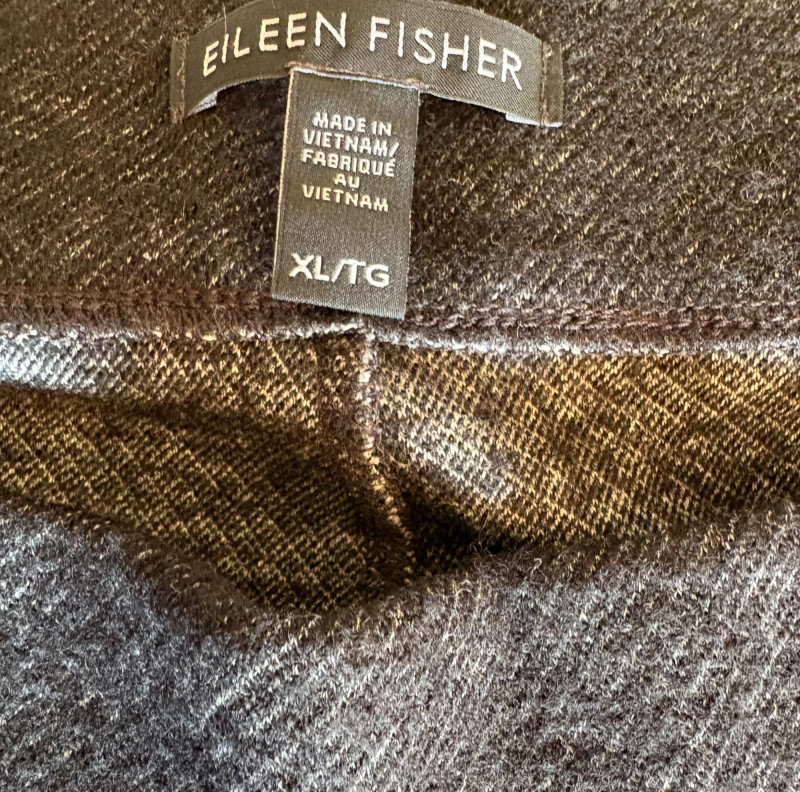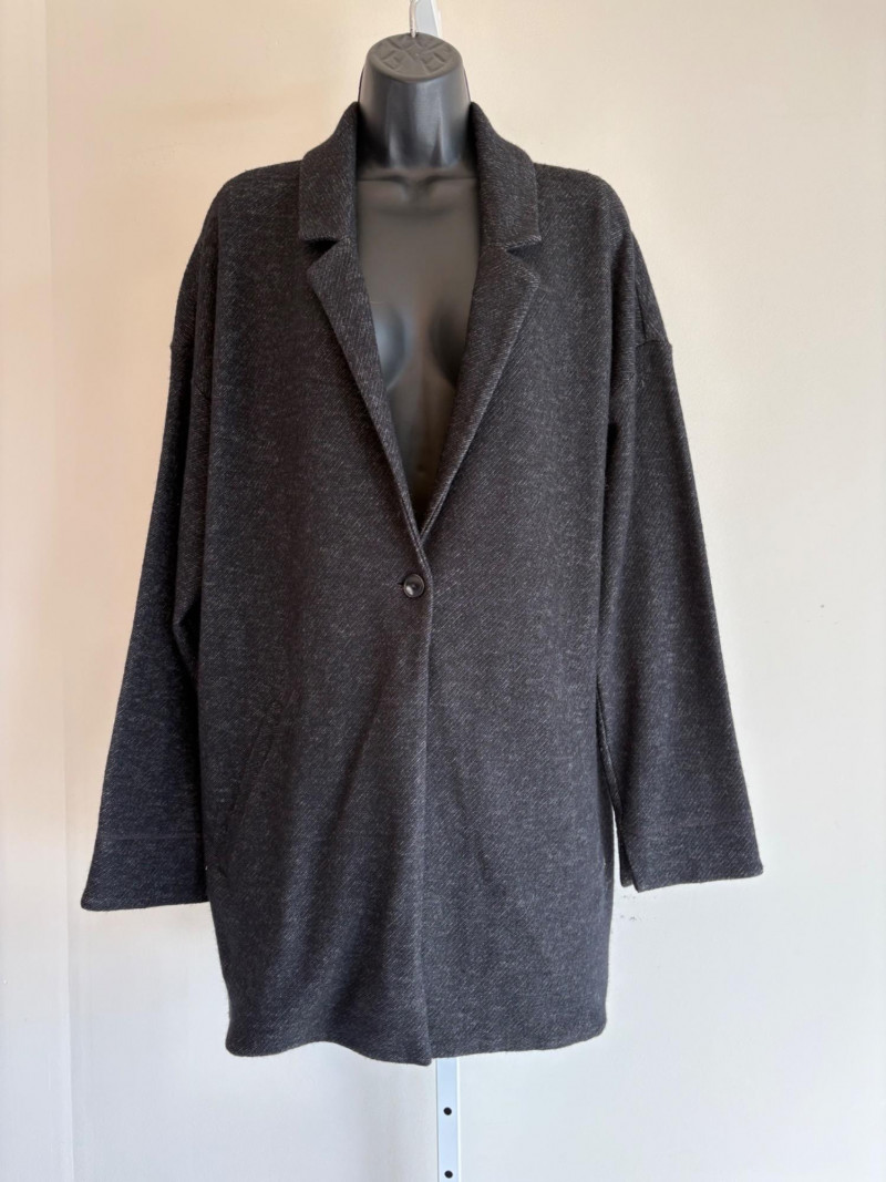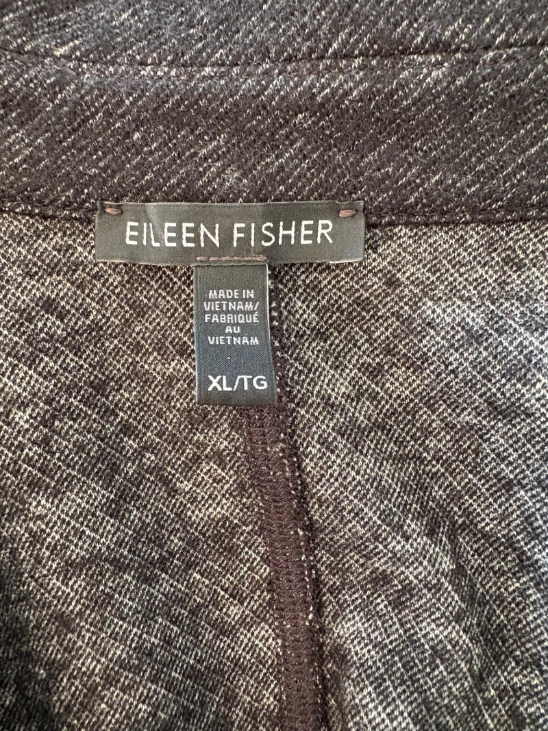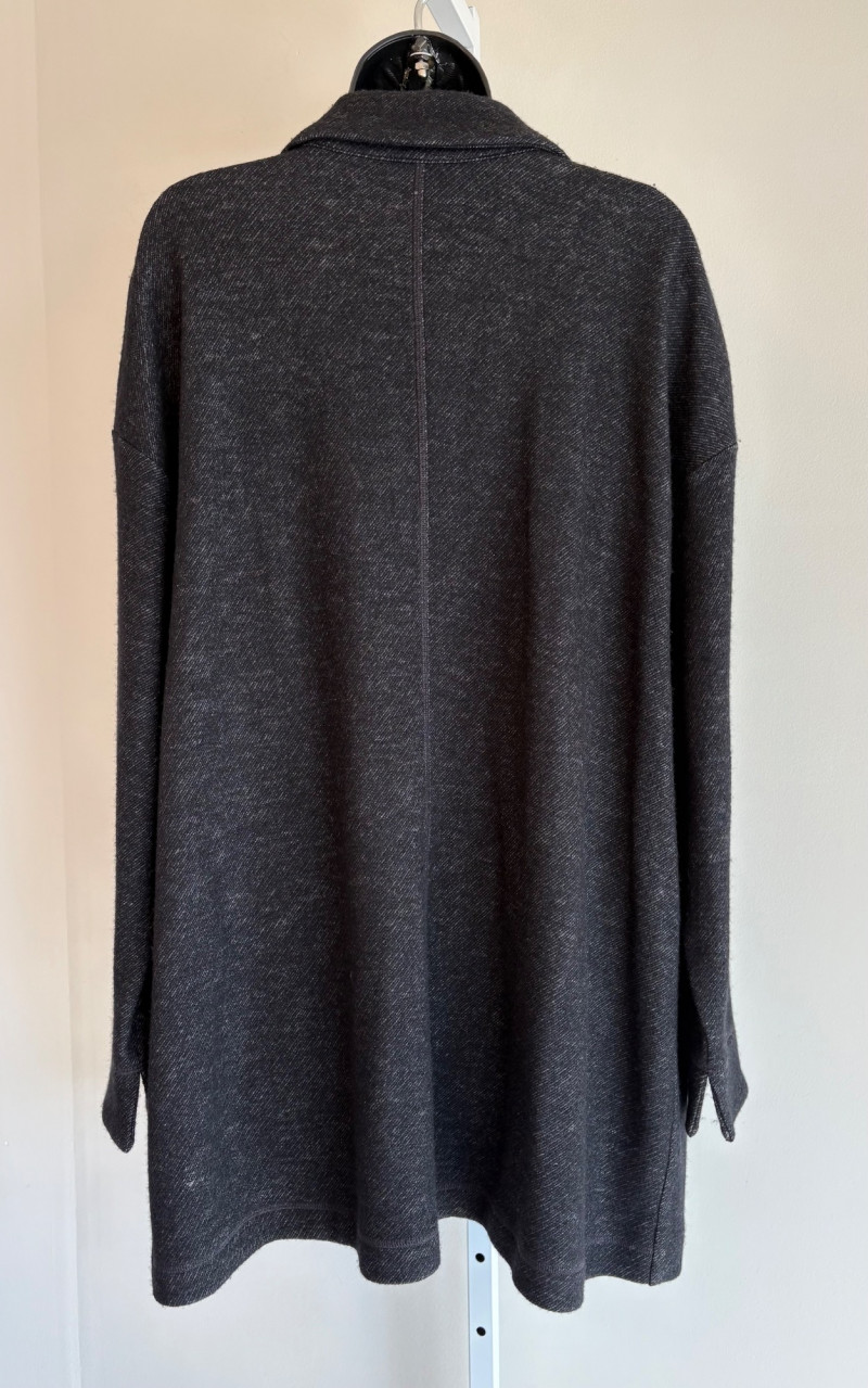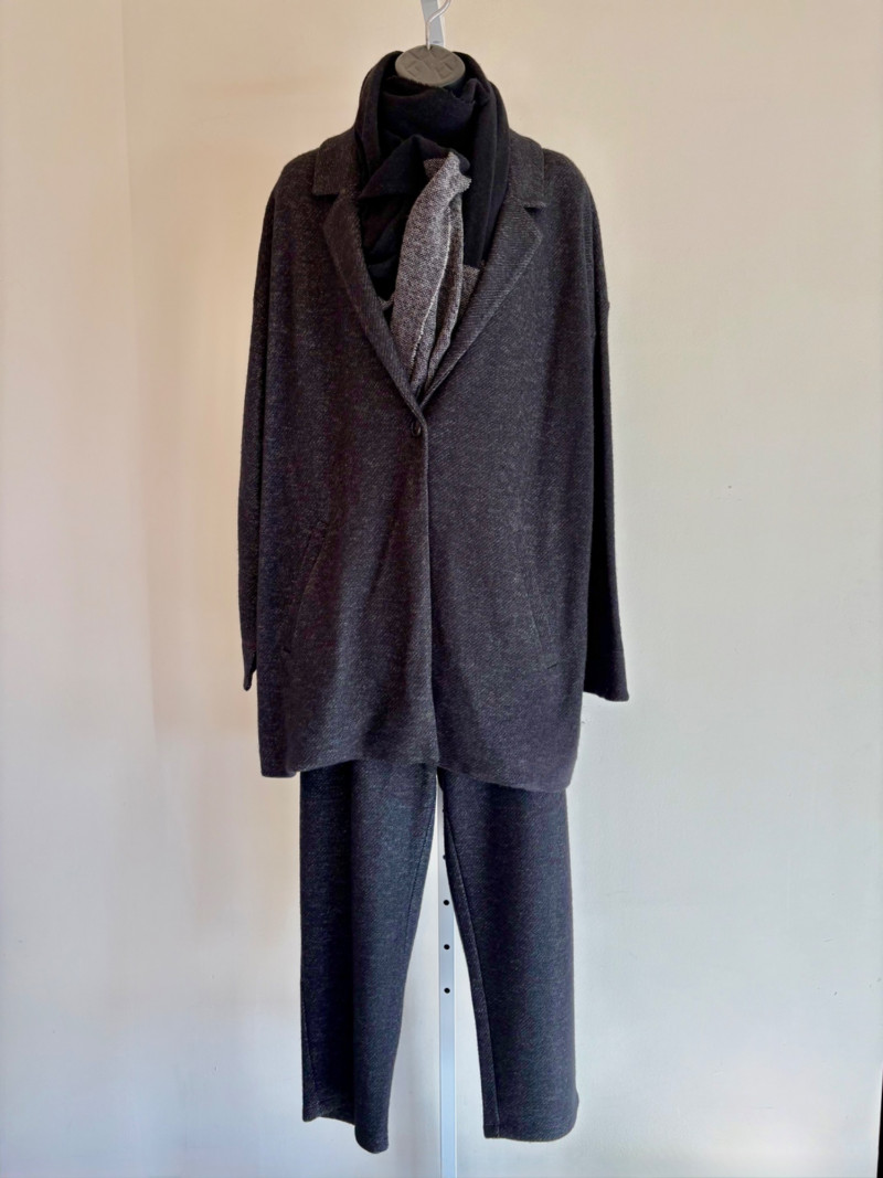 2-piece comfortable knit suit from Eileen Fisher with coordinating scarf. Black-grey casual blazer style coat from Eileen Fisher has notched collar, welted slash pockets, split cuff sleeves, and single button front closure. Wool/ rayon/cotton blend Measures 26" pit to pit and 32" from back neckline to hem. Size tag says XL. Note that we found a small hole on the right back hip that does not show unless stretched & could easily be repaired with a couple of stitches - see last 2 photos. Matching Eileen Fisher pants from same fabric have flat elastic waistband, set-in side pockets, back right welt pocket, and straight legs. Measure 20.5" side to side at waist with 24.5" inseam. Size tag says XL. Paired with gray and black wide-striped scarf with fringe on short edges. Measures approximately 64“ x 20“. No make or fabric tag, but feels like a very soft wool. NOTE: the actual color of the suit is deep striated charcoal/black - pants front & back photos are most representative.