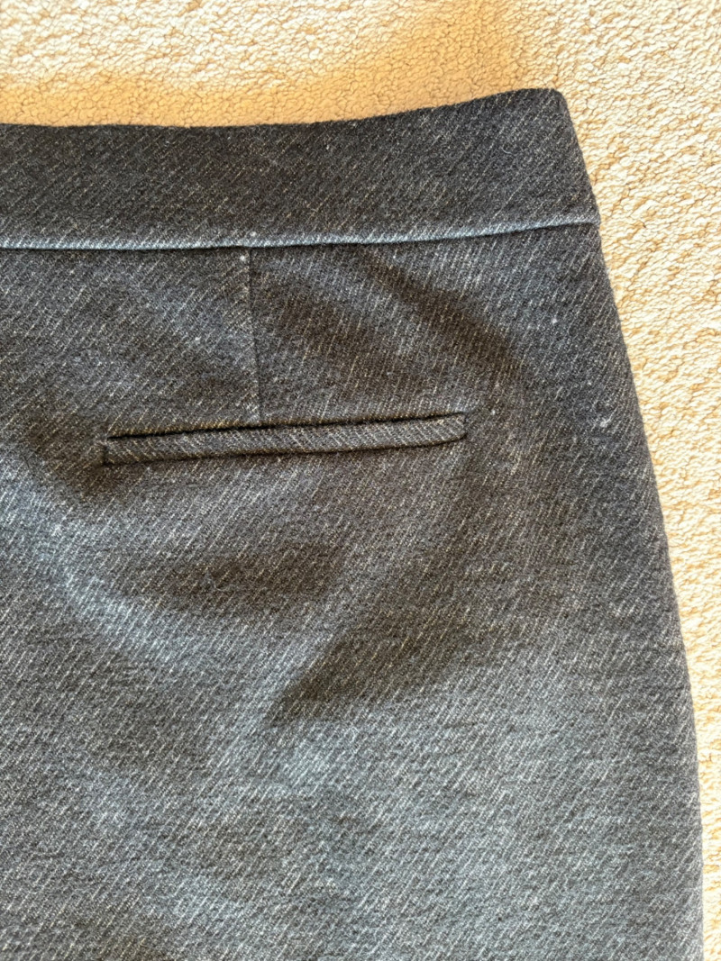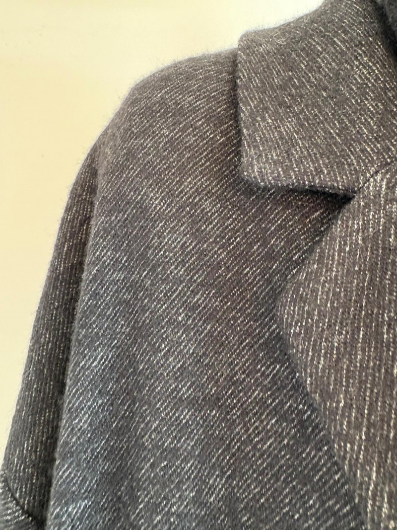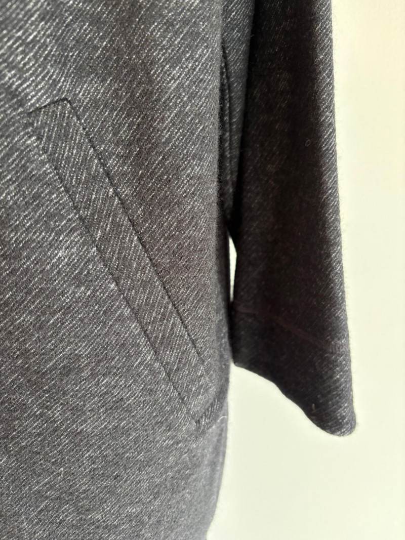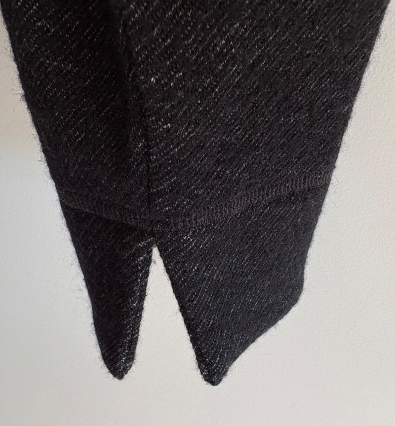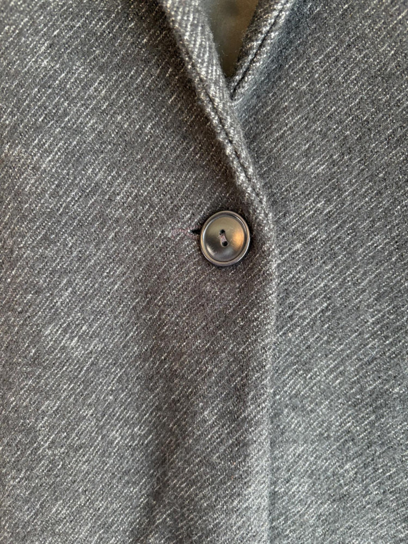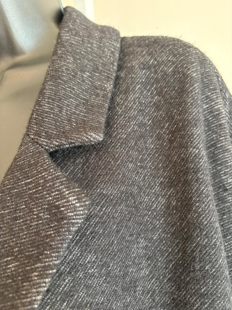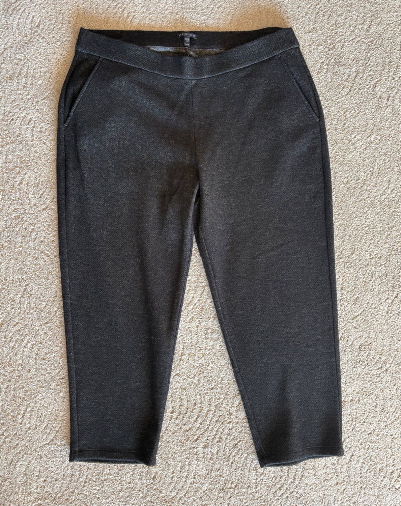 2-piece comfortable knit suit from Eileen Fisher with coordinating scarf. Black-grey casual blazer style coat from Eileen Fisher has notched collar, welted slash pockets, split cuff sleeves, and single button front closure. Wool/ rayon/cotton blend Measures 26" pit to pit and 32" from back neckline to hem. Size tag says XL. Note that we found a small hole on the right back hip that does not show unless stretched & could easily be repaired with a couple of stitches - see last 2 photos. Matching Eileen Fisher pants from same fabric have flat elastic waistband, set-in side pockets, back right welt pocket, and straight legs. Measure 20.5" side to side at waist with 24.5" inseam. Size tag says XL. Paired with gray and black wide-striped scarf with fringe on short edges. Measures approximately 64“ x 20“. No make or fabric tag, but feels like a very soft wool. NOTE: the actual color of the suit is deep striated charcoal/black - pants front & back photos are most representative.