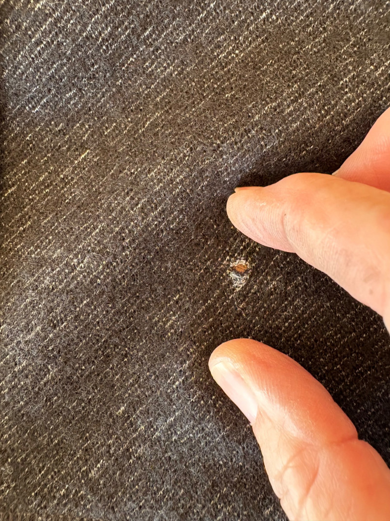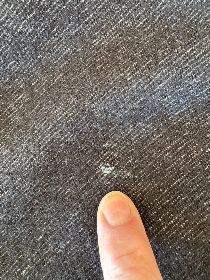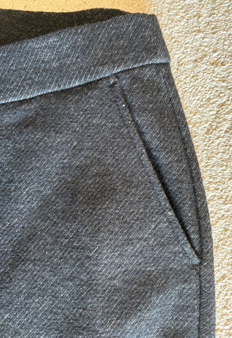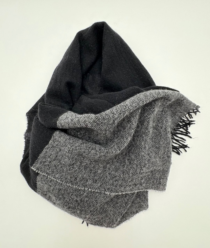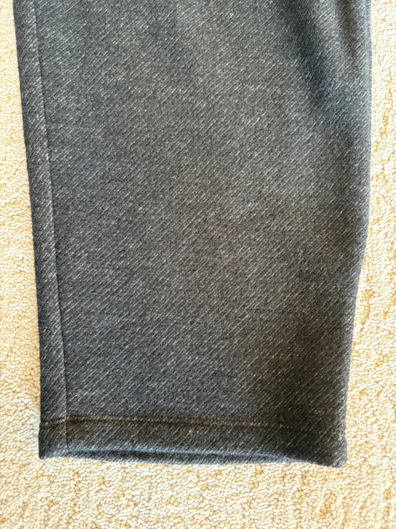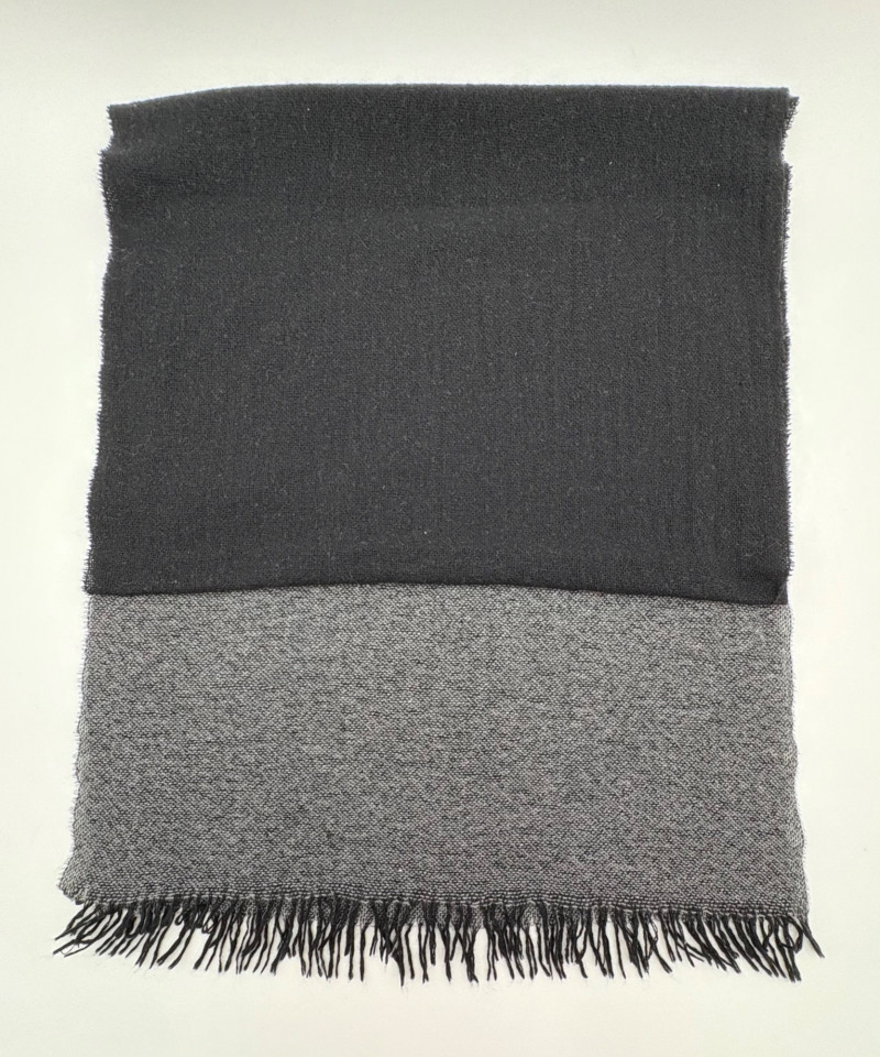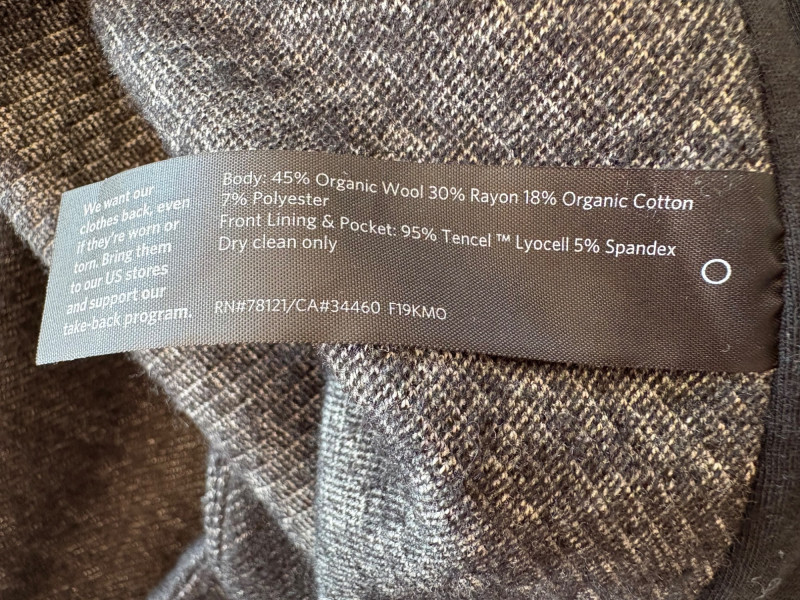 2-piece comfortable knit suit from Eileen Fisher with coordinating scarf. Black-grey casual blazer style coat from Eileen Fisher has notched collar, welted slash pockets, split cuff sleeves, and single button front closure. Wool/ rayon/cotton blend Measures 26" pit to pit and 32" from back neckline to hem. Size tag says XL. Note that we found a small hole on the right back hip that does not show unless stretched & could easily be repaired with a couple of stitches - see last 2 photos. Matching Eileen Fisher pants from same fabric have flat elastic waistband, set-in side pockets, back right welt pocket, and straight legs. Measure 20.5" side to side at waist with 24.5" inseam. Size tag says XL. Paired with gray and black wide-striped scarf with fringe on short edges. Measures approximately 64“ x 20“. No make or fabric tag, but feels like a very soft wool. NOTE: the actual color of the suit is deep striated charcoal/black - pants front & back photos are most representative.