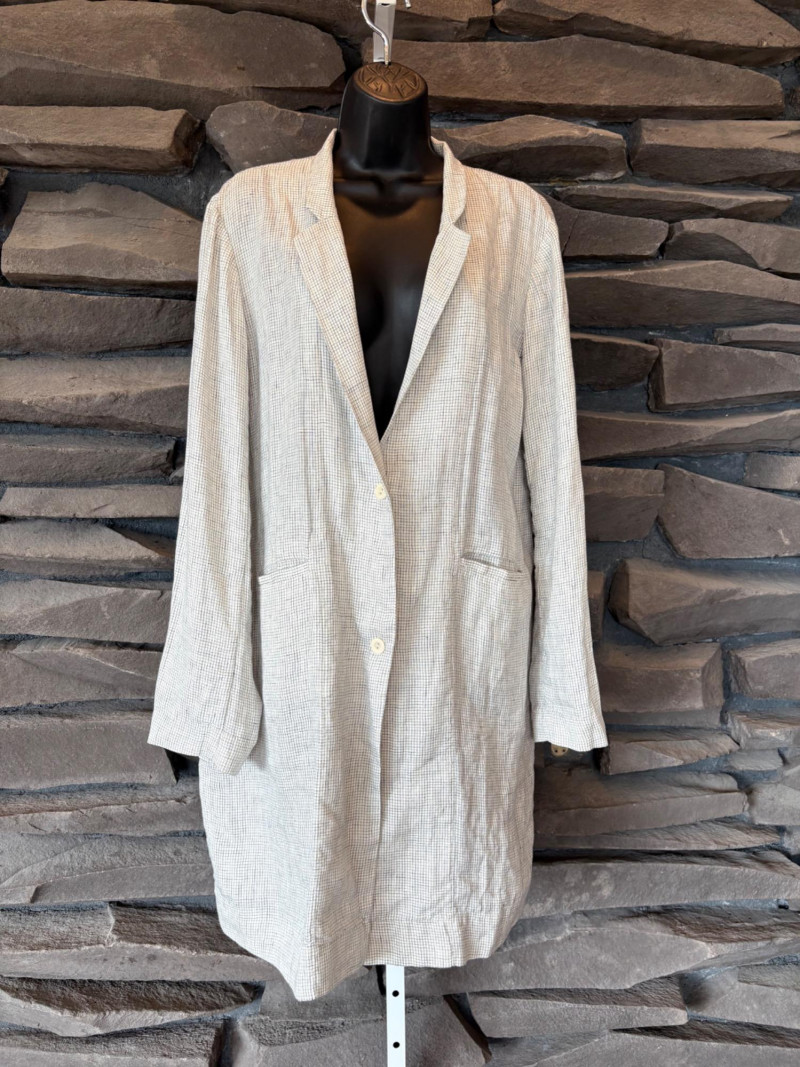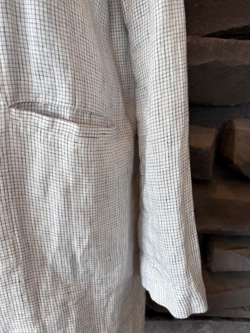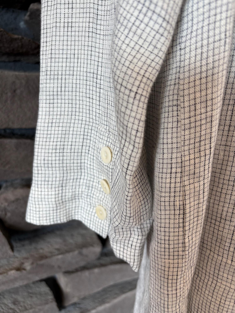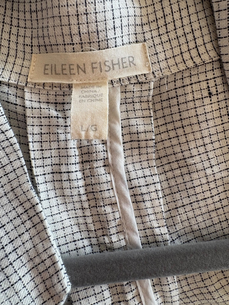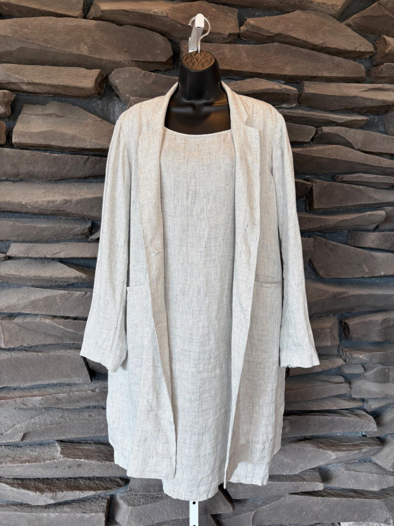 Lovely linen dress with matching jacket from Eileen Fisher. Both pieces are 100% organic linen. Long jacket in small black grid pattern on white has notched collar. sleeves with 3 buttons, welted slash front pockets, and center back pleat. Measures 25" pit to pit and 35.5" from back neckline to hem. Size tag says L. Sleeveless dress in same linen print has banded dolman sleeves with princess seaming, inseam front pockets, and split hem. Measures 25" pit to pit and 37" from back neckline to hem. Size tag says L.