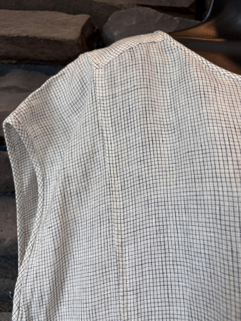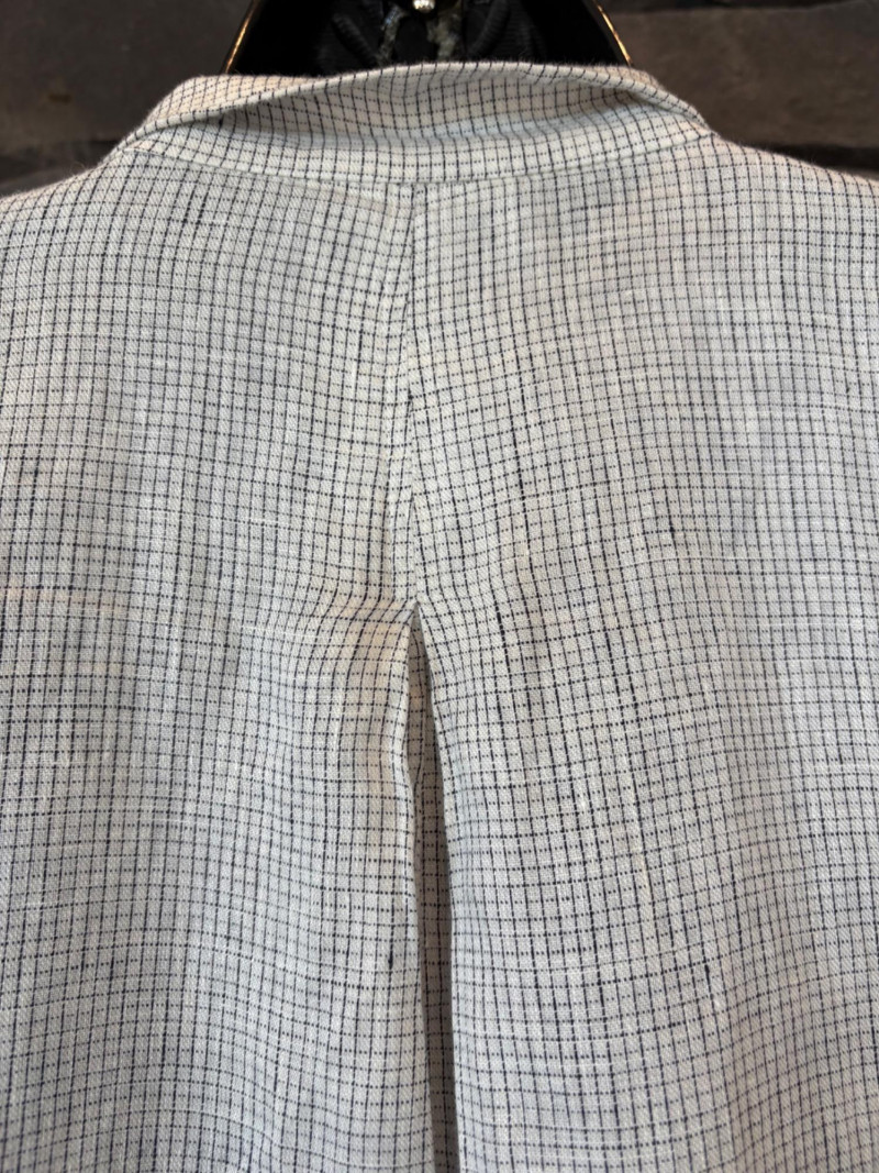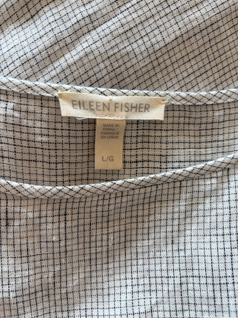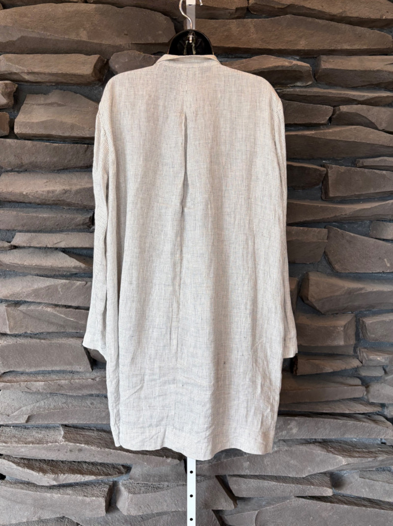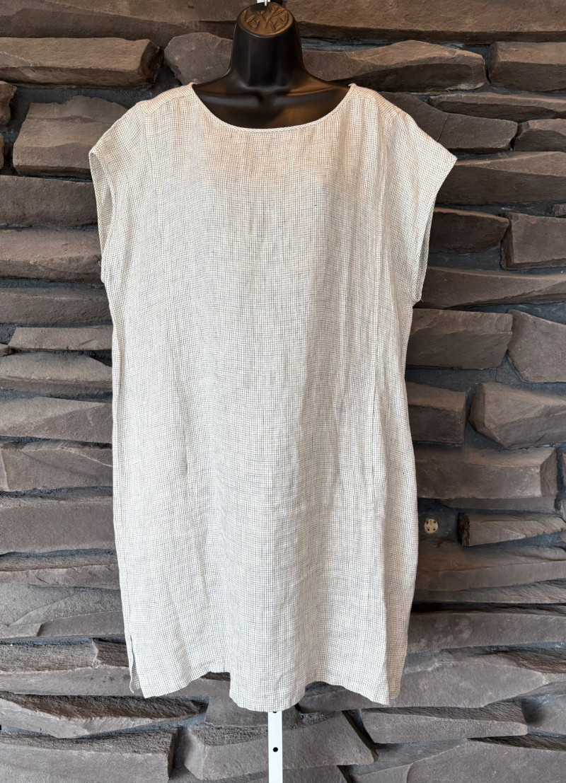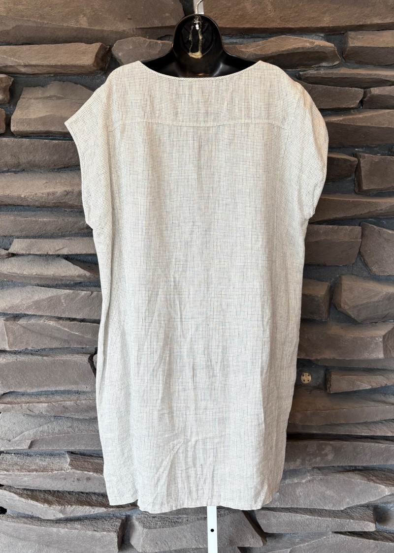 Lovely linen dress with matching jacket from Eileen Fisher. Both pieces are 100% organic linen. Long jacket in small black grid pattern on white has notched collar. sleeves with 3 buttons, welted slash front pockets, and center back pleat. Measures 25" pit to pit and 35.5" from back neckline to hem. Size tag says L. Sleeveless dress in same linen print has banded dolman sleeves with princess seaming, inseam front pockets, and split hem. Measures 25" pit to pit and 37" from back neckline to hem. Size tag says L.