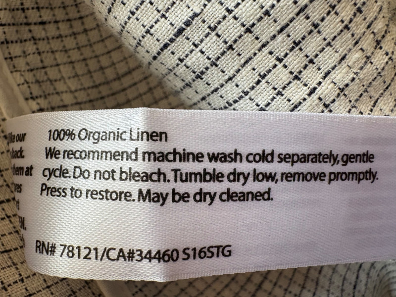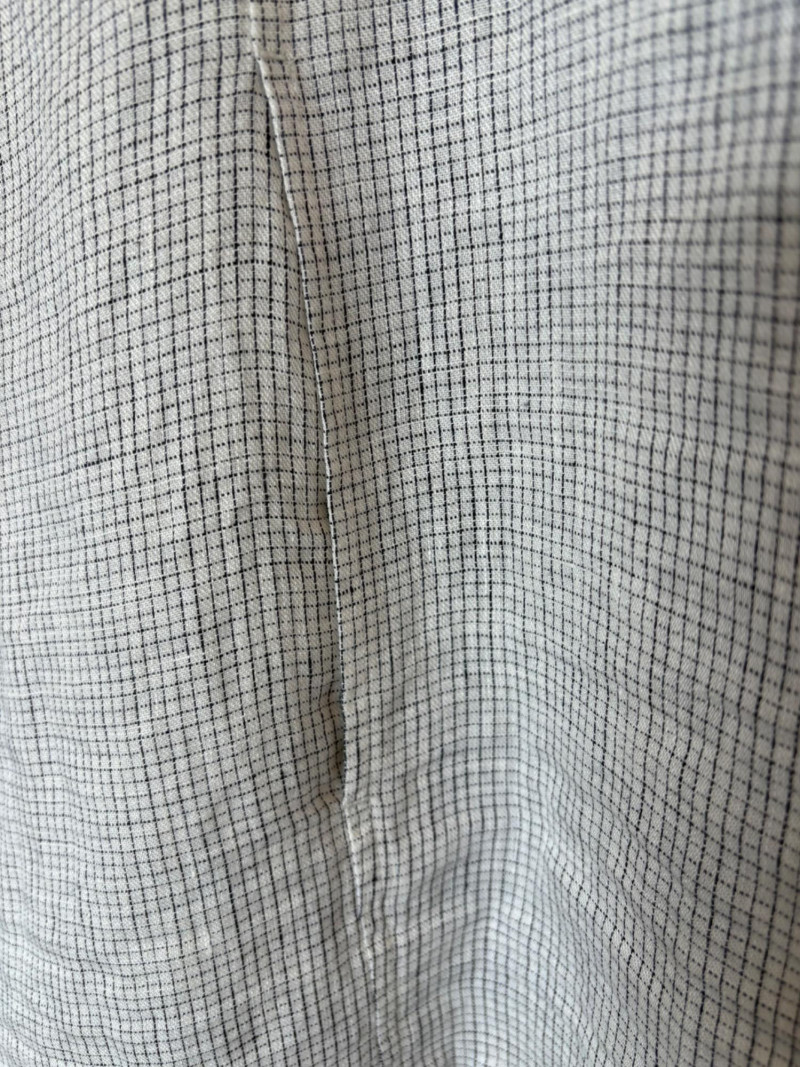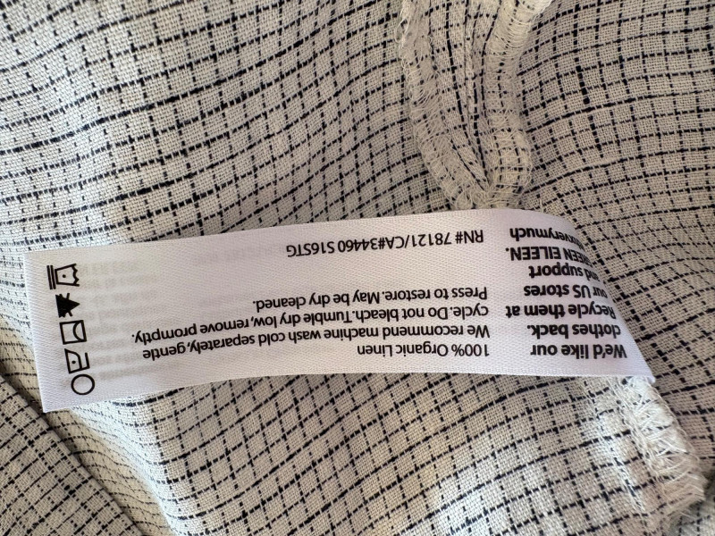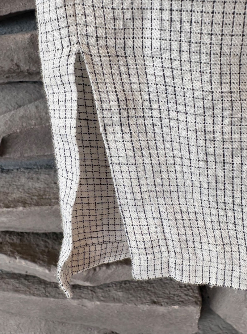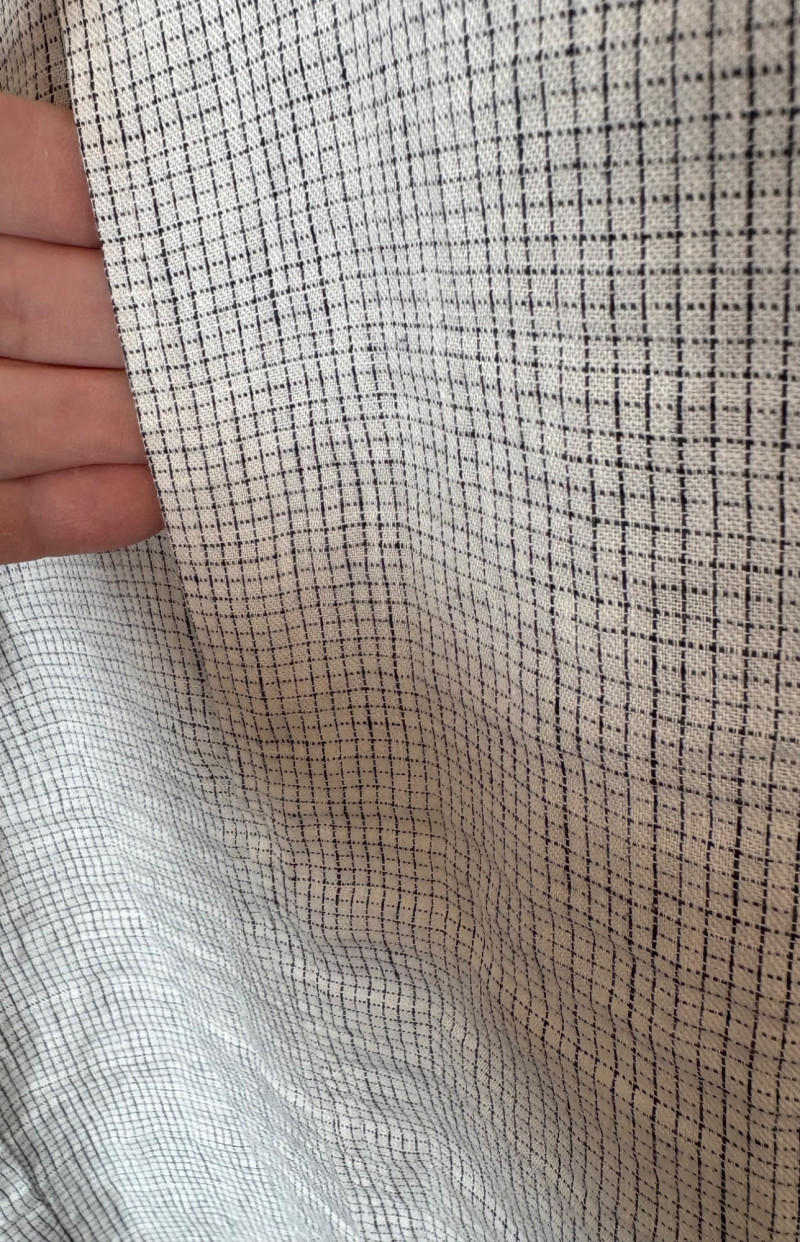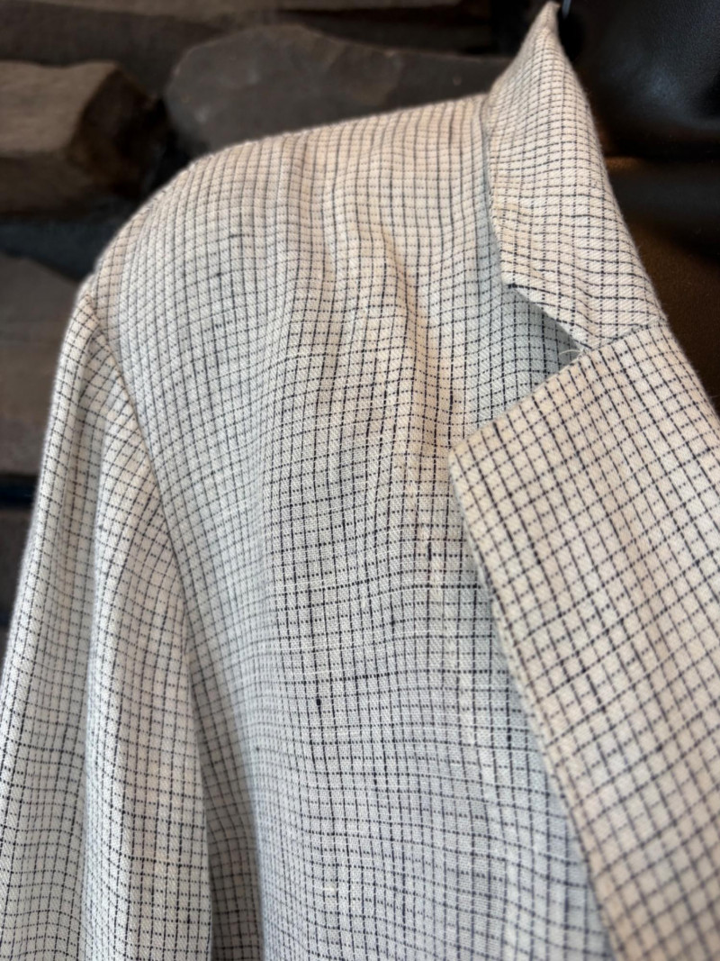 Lovely linen dress with matching jacket from Eileen Fisher. Both pieces are 100% organic linen. Long jacket in small black grid pattern on white has notched collar. sleeves with 3 buttons, welted slash front pockets, and center back pleat. Measures 25" pit to pit and 35.5" from back neckline to hem. Size tag says L. Sleeveless dress in same linen print has banded dolman sleeves with princess seaming, inseam front pockets, and split hem. Measures 25" pit to pit and 37" from back neckline to hem. Size tag says L.