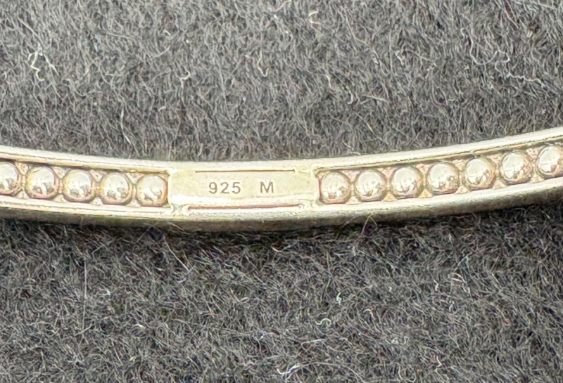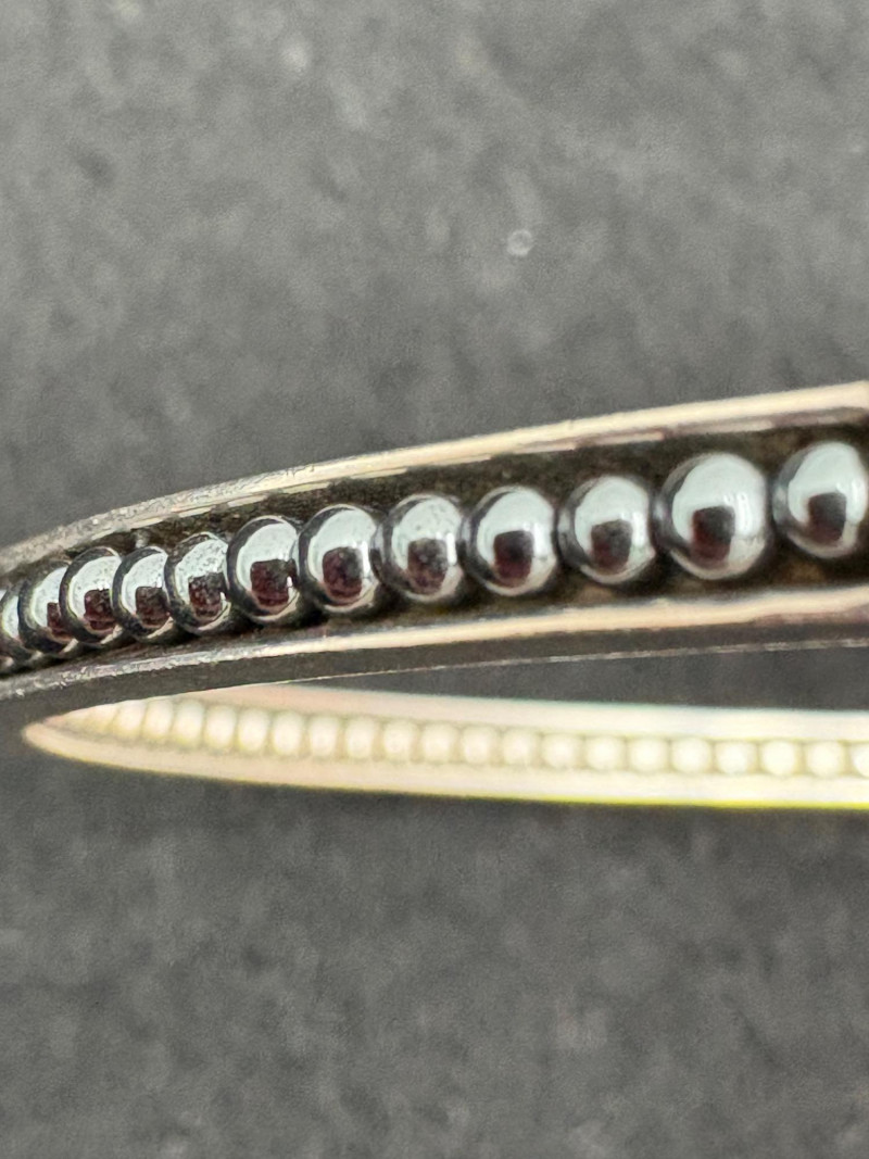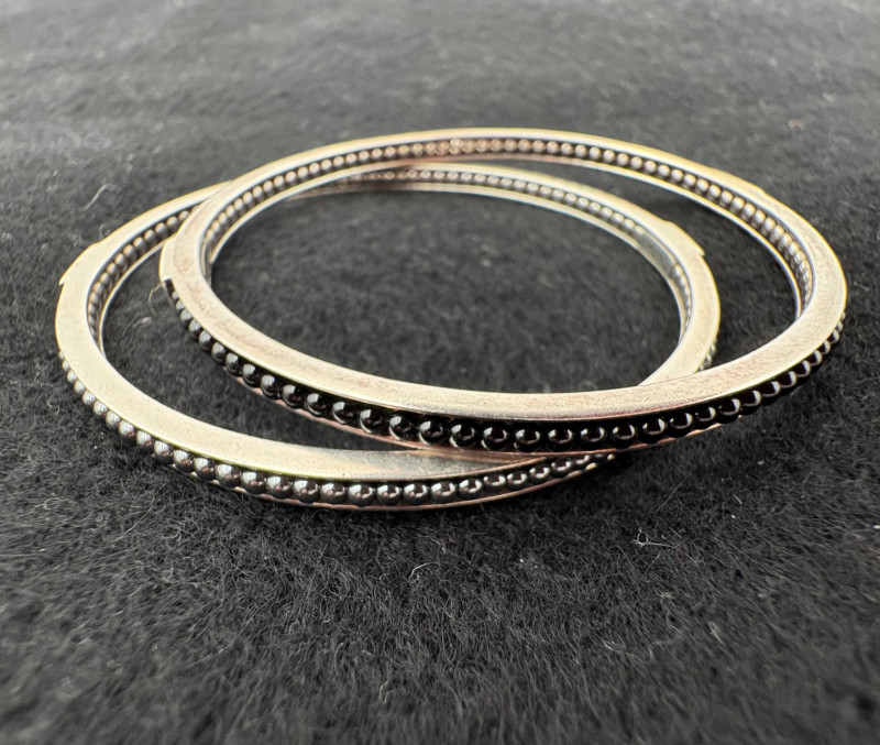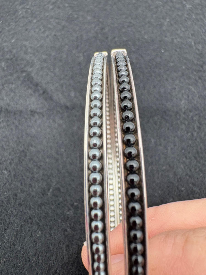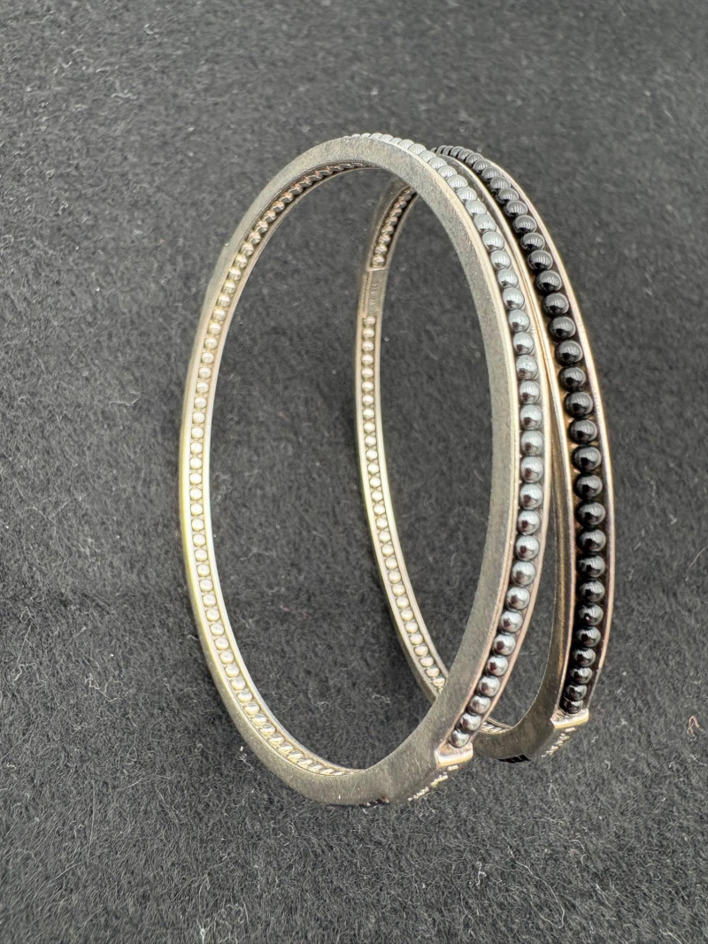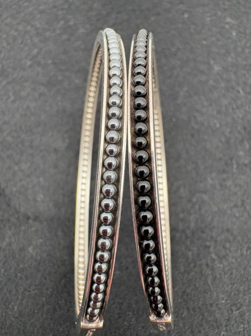 2 sterling Icon Caviat bangle bracelets in black/grey with what appears to be hematite & onyx beading - from luxury jewelry company Lagos. Superb detailing adds interest, but still retains a minimalist feel. Measures 2.5" across inside the bracelets. These are still available on the Lagos site: https://www.lagos.com/products/caviar-icon-hematite-05-81242