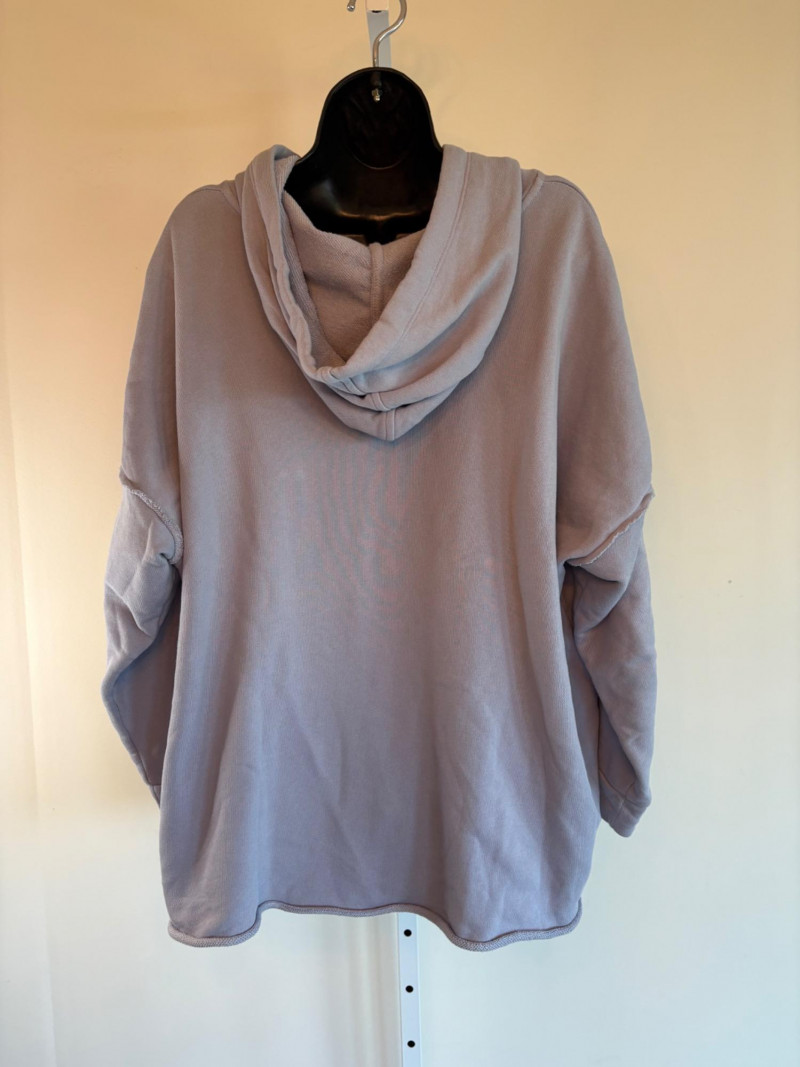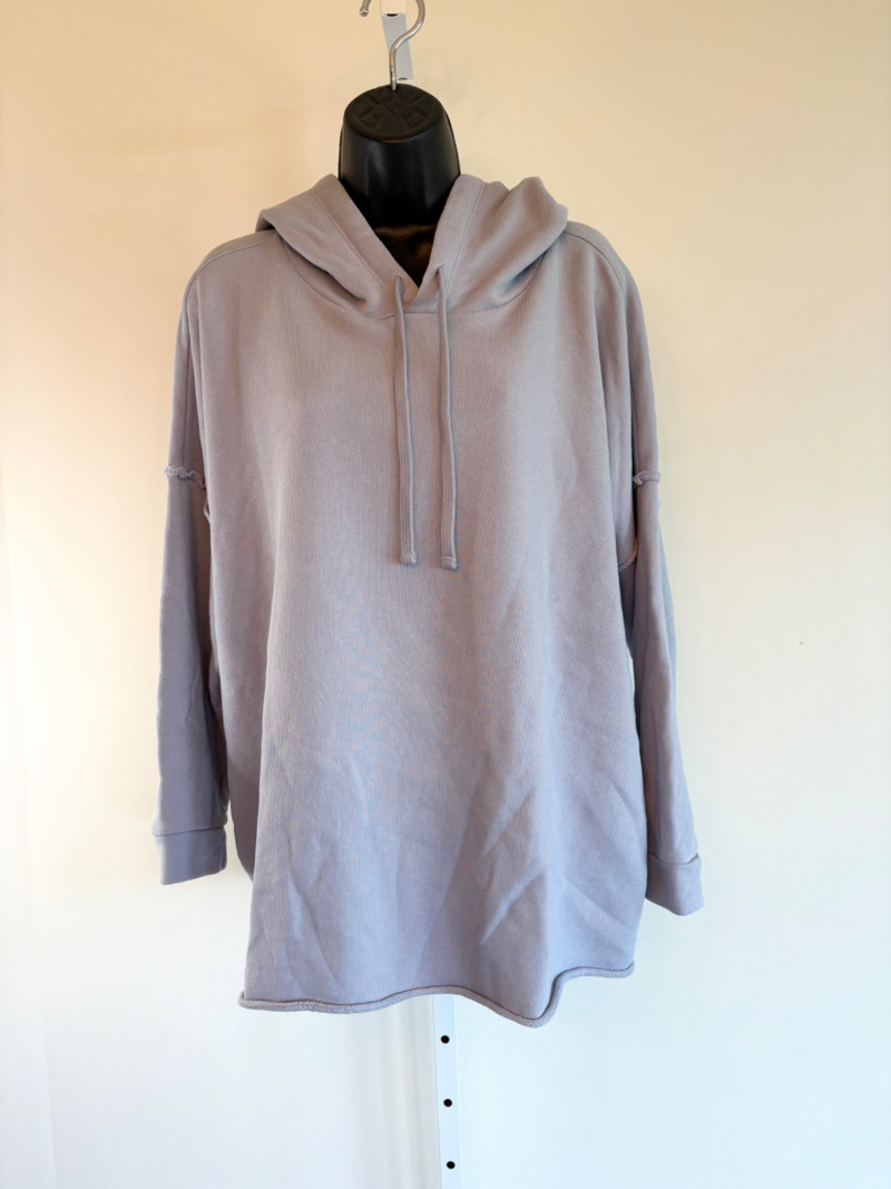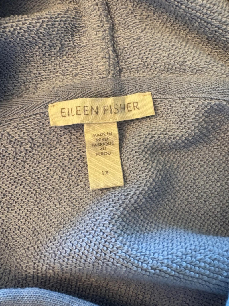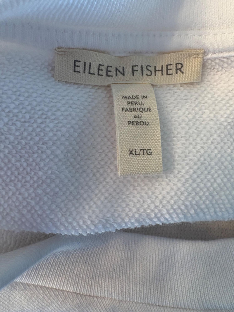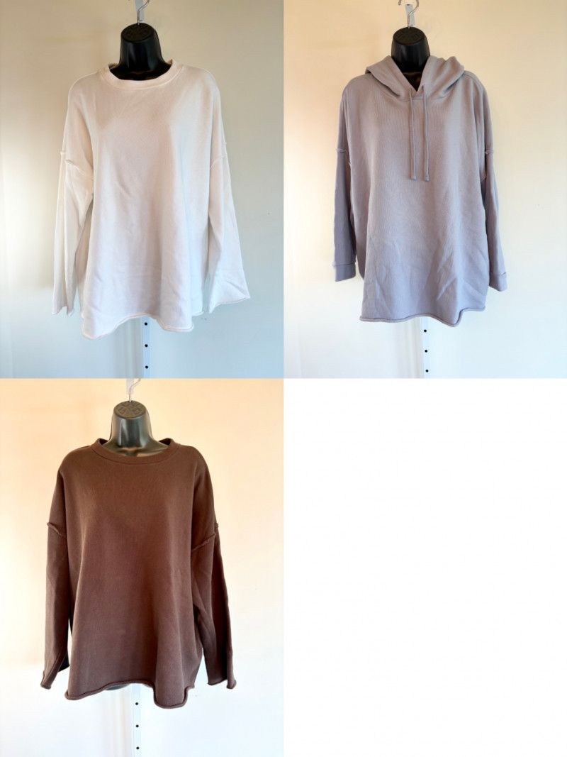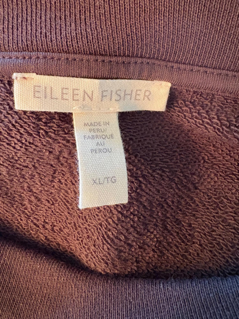 These are "old school" heavy sweatshirts from Eileen Fisher with loop terry interior and deconstructed seaming on the exterior. White crewneck sweatshirt has dropped shoulder seams. ribbed neckline. and rolled hem/sleeve cuffs. Measures 26" pit to pit. 100% organic cotton. Size tag says XL Lilac sweatshirt has hood, dropped shoulder seams, ribbed cuffs, rolled bottom hem, and hood with drawstring. Measures 30" pit to pit. 100% organic cotton. Size tag says 1X. Dark brown sweatshirt has ribbed crewneck, dropped shoulder seams, and rolled cuffs/hem. Measures 27" pit to pit. 100% organic cotton. Size tag says XL.