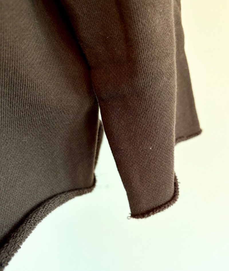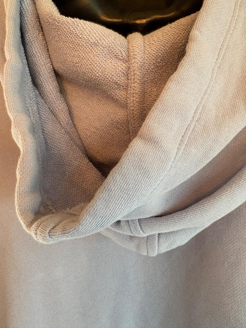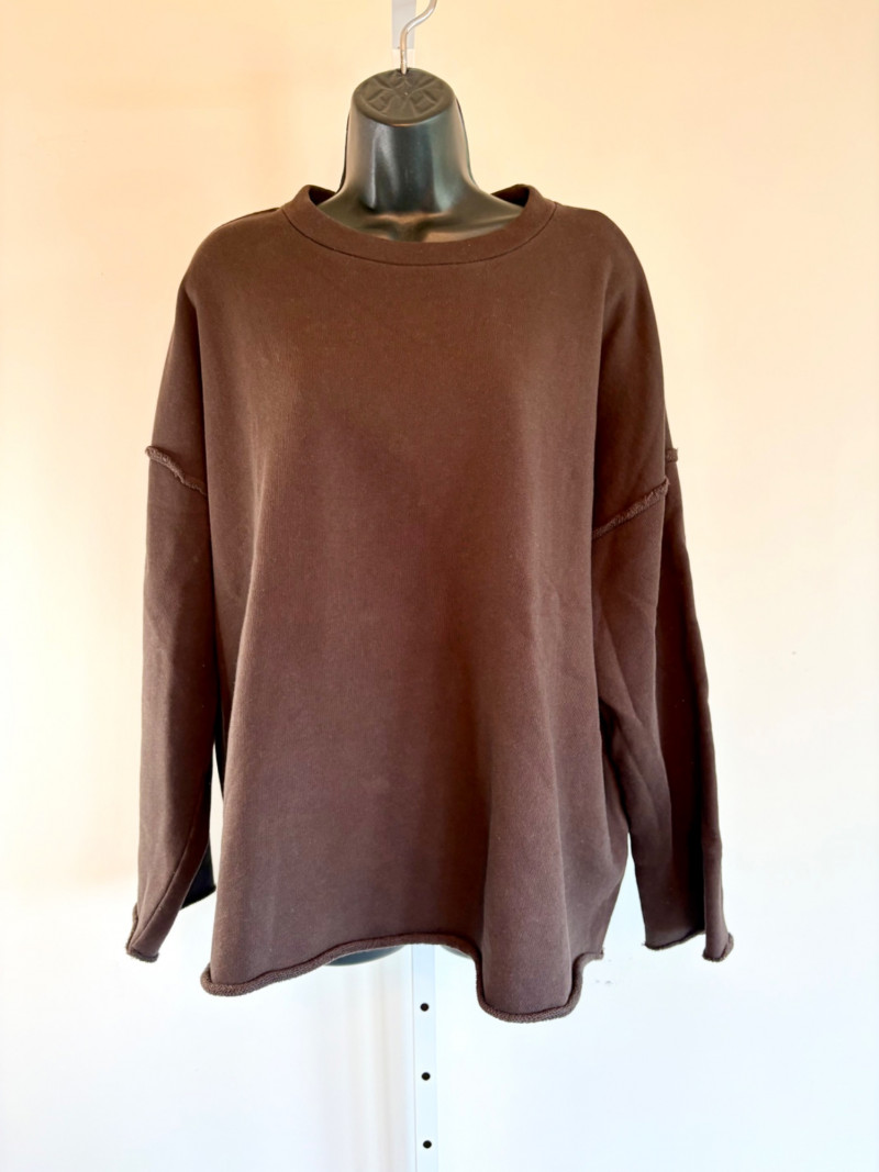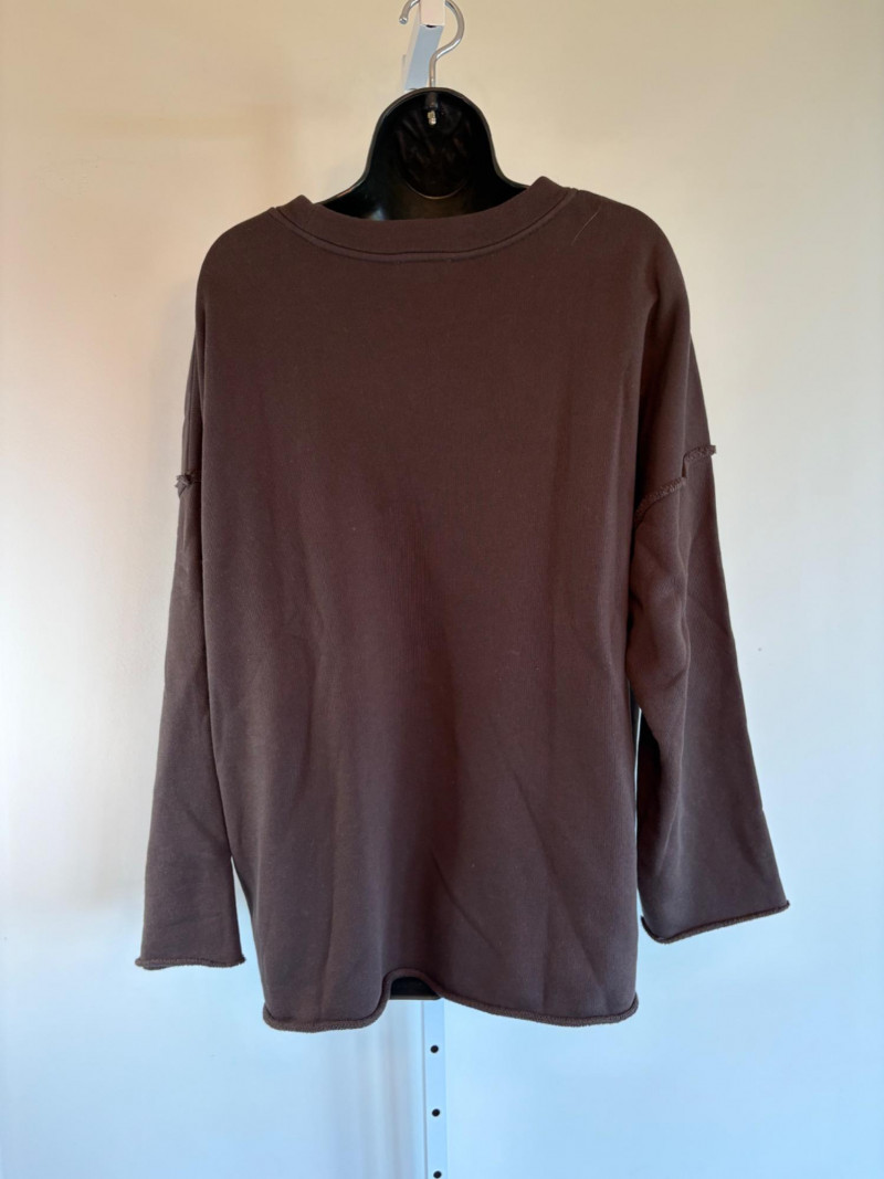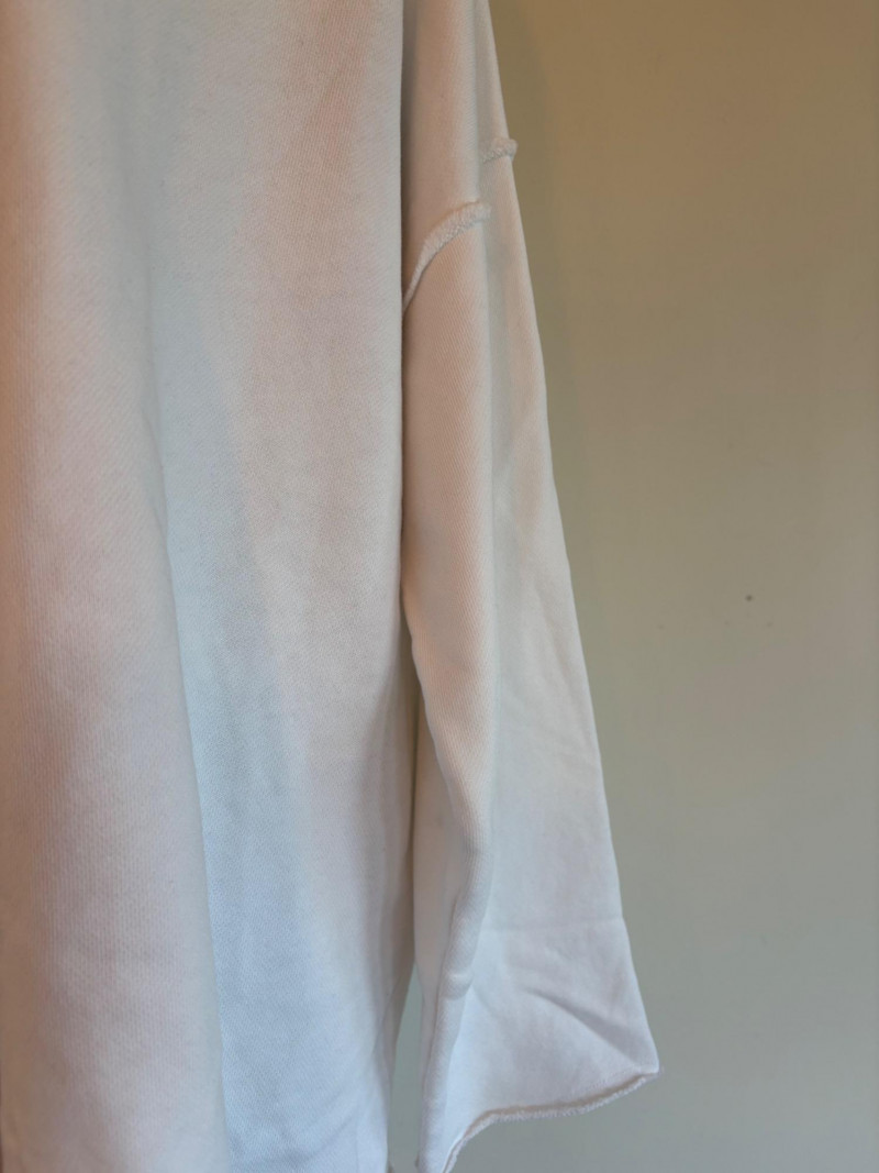 These are "old school" heavy sweatshirts from Eileen Fisher with loop terry interior and deconstructed seaming on the exterior. White crewneck sweatshirt has dropped shoulder seams. ribbed neckline. and rolled hem/sleeve cuffs. Measures 26" pit to pit. 100% organic cotton. Size tag says XL Lilac sweatshirt has hood, dropped shoulder seams, ribbed cuffs, rolled bottom hem, and hood with drawstring. Measures 30" pit to pit. 100% organic cotton. Size tag says 1X. Dark brown sweatshirt has ribbed crewneck, dropped shoulder seams, and rolled cuffs/hem. Measures 27" pit to pit. 100% organic cotton. Size tag says XL.