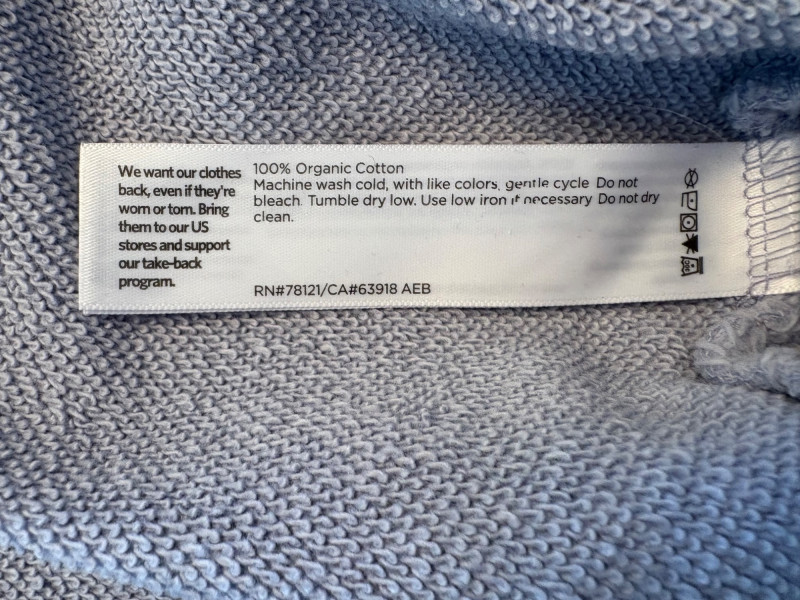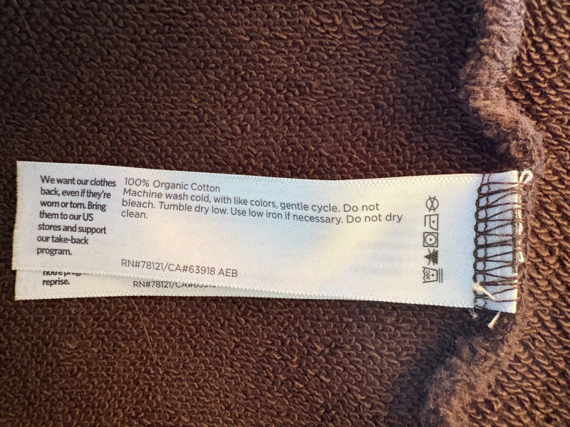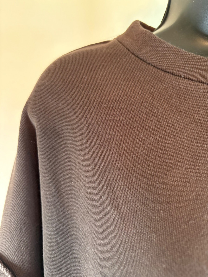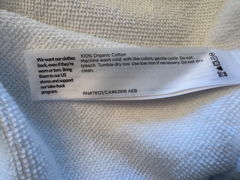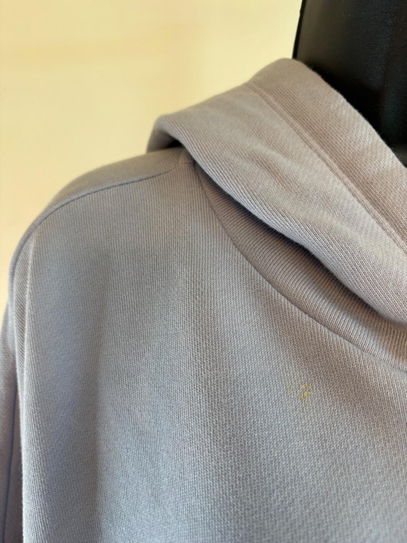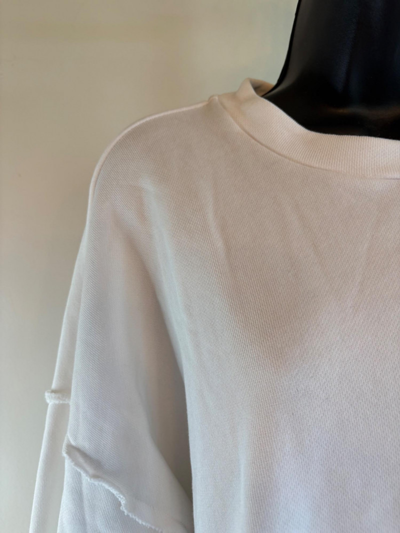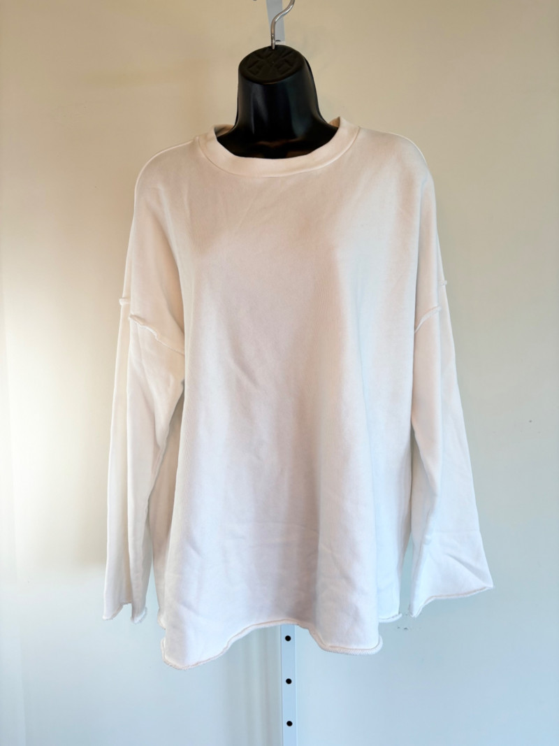 These are "old school" heavy sweatshirts from Eileen Fisher with loop terry interior and deconstructed seaming on the exterior. White crewneck sweatshirt has dropped shoulder seams. ribbed neckline. and rolled hem/sleeve cuffs. Measures 26" pit to pit. 100% organic cotton. Size tag says XL Lilac sweatshirt has hood, dropped shoulder seams, ribbed cuffs, rolled bottom hem, and hood with drawstring. Measures 30" pit to pit. 100% organic cotton. Size tag says 1X. Dark brown sweatshirt has ribbed crewneck, dropped shoulder seams, and rolled cuffs/hem. Measures 27" pit to pit. 100% organic cotton. Size tag says XL.