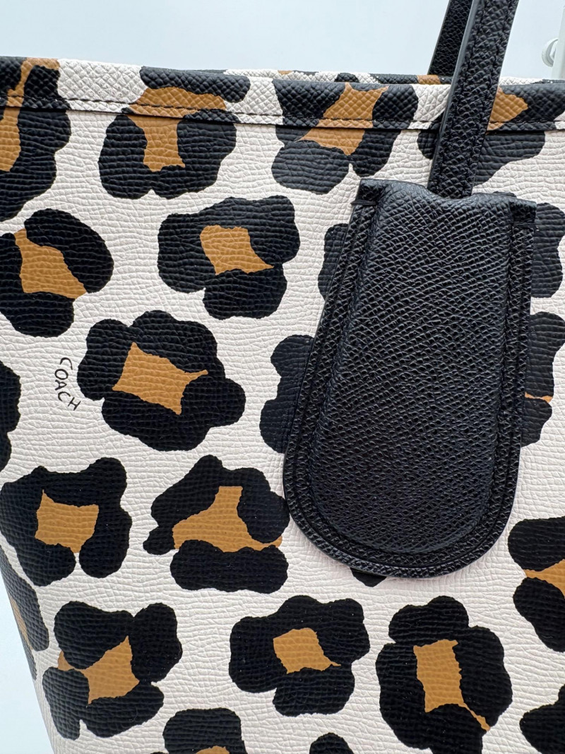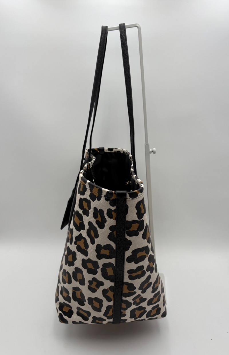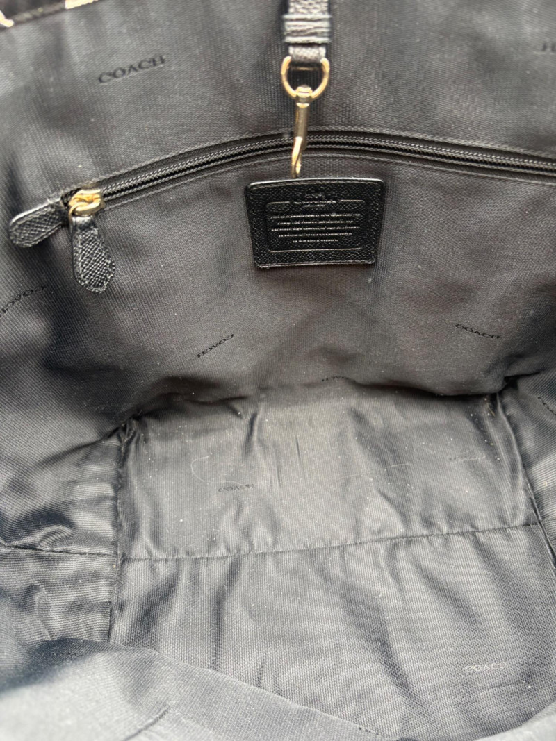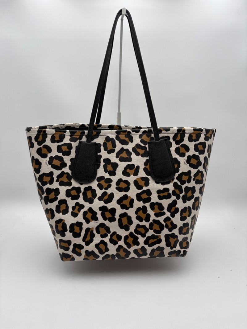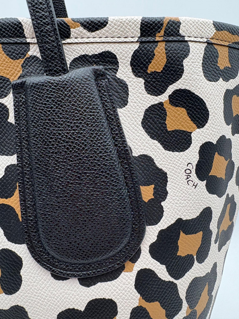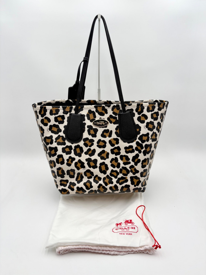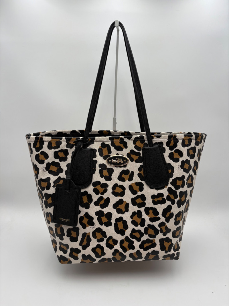Ocelot print tote/purse from Coach. Exterior in black & tan print on cream background. Black textured handles, tag, and trim. Interior is lined in black with zip pocket, 2 slide-in pockets, and gold swivel clip at center to hold bag closed. The bag appears to be unused and comes with Coach dust bag. It measures 12" H x 11" W x 8" D. Drop from handles to top of purse is 10". Note that there is very slight wear to the bottom bag edges from storage - doesn't show because of the pattern. Note: our client didn't buy fakes, but we are unable to read much of the ubiquitous Coach label on the interior since the embossed tag is textured - see last photo above (we usually see the tags in smooth leather). We aren't purse experts, so please use your own judgment on the bag's authenticity; we feel fairly confident it is real given our client's penchant for quality, but just wanted to mention.