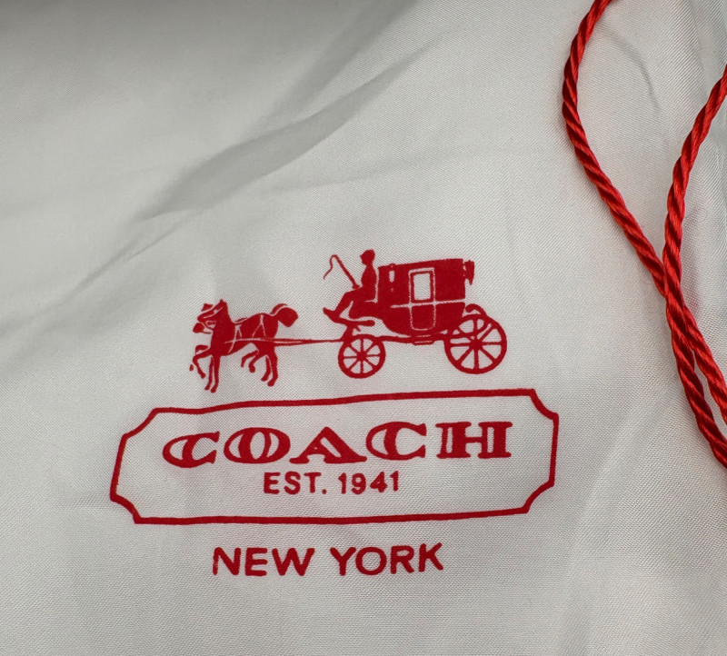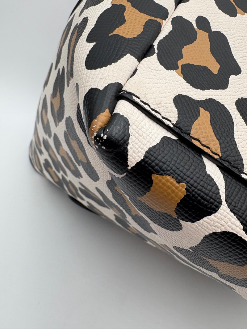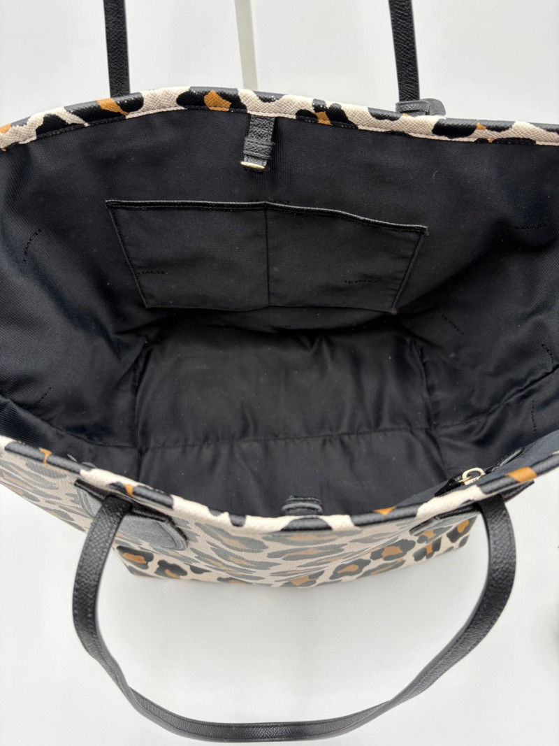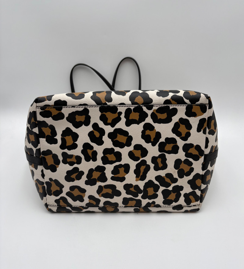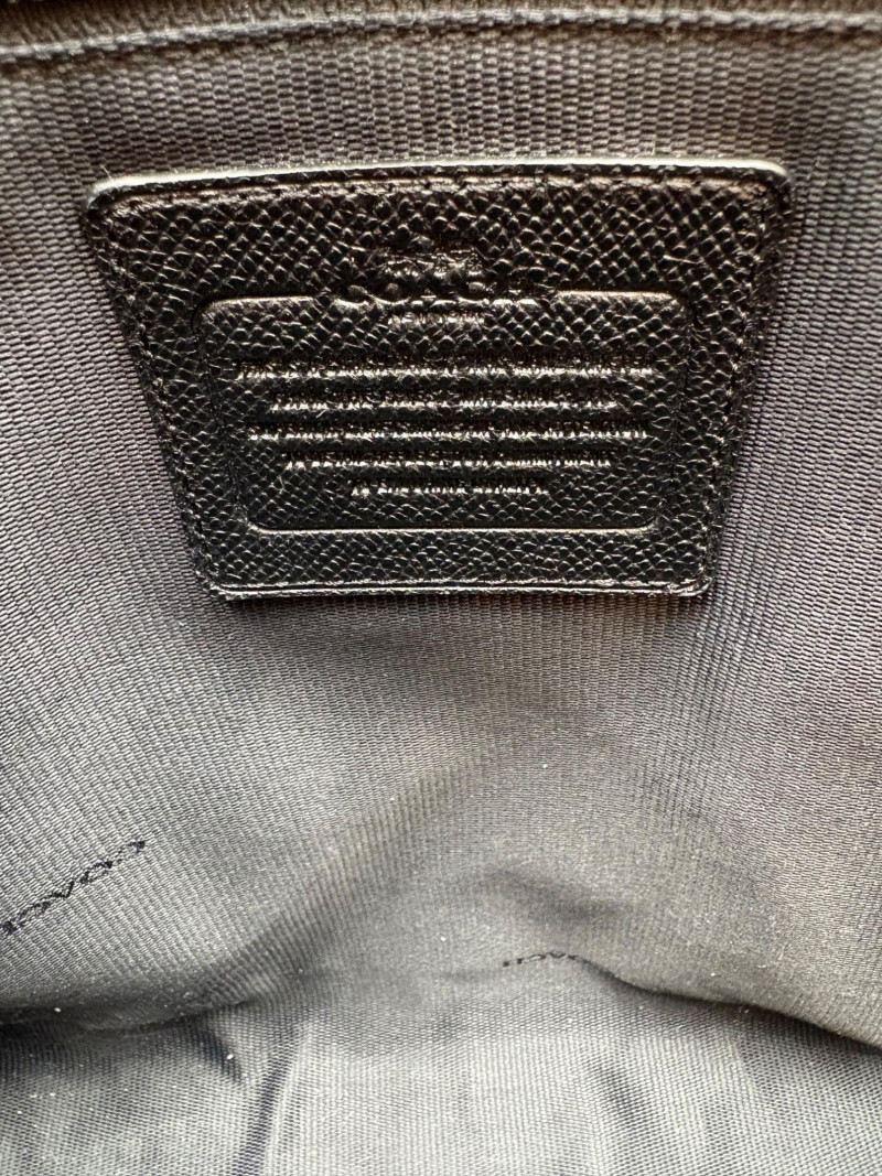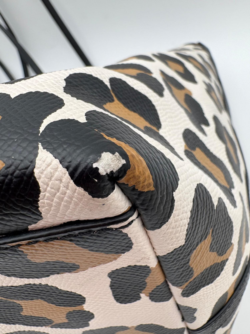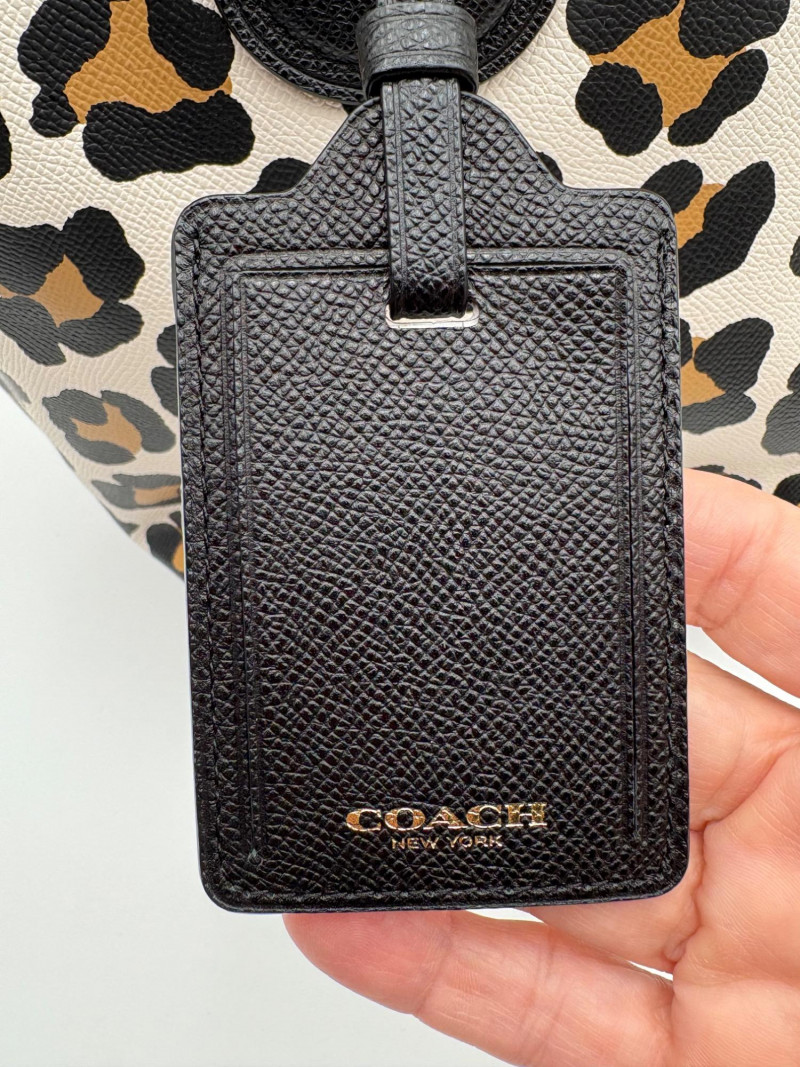 Ocelot print tote/purse from Coach. Exterior in black & tan print on cream background. Black textured handles, tag, and trim. Interior is lined in black with zip pocket, 2 slide-in pockets, and gold swivel clip at center to hold bag closed. The bag appears to be unused and comes with Coach dust bag. It measures 12" H x 11" W x 8" D. Drop from handles to top of purse is 10". Note that there is very slight wear to the bottom bag edges from storage - doesn't show because of the pattern. Note: our client didn't buy fakes, but we are unable to read much of the ubiquitous Coach label on the interior since the embossed tag is textured - see last photo above (we usually see the tags in smooth leather). We aren't purse experts, so please use your own judgment on the bag's authenticity; we feel fairly confident it is real given our client's penchant for quality, but just wanted to mention.