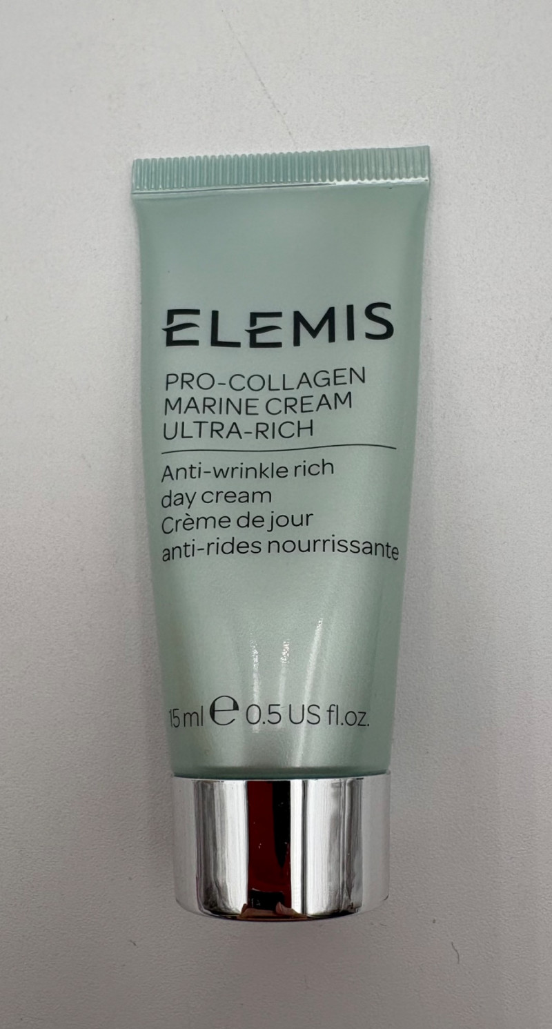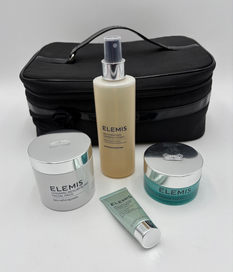 4 Elemis skin care products. All appear to be new to the best of our determination. - Elemis Rehydrating Ginseng Toner - Elemis Pro-Collagen Marine Cream (small tube) - Elemis Pro-Collagen Marine Cream (large jar) - Elemis Dynamic Resurfacing Facial Pads Lancome Make-up Bag in black (not new)