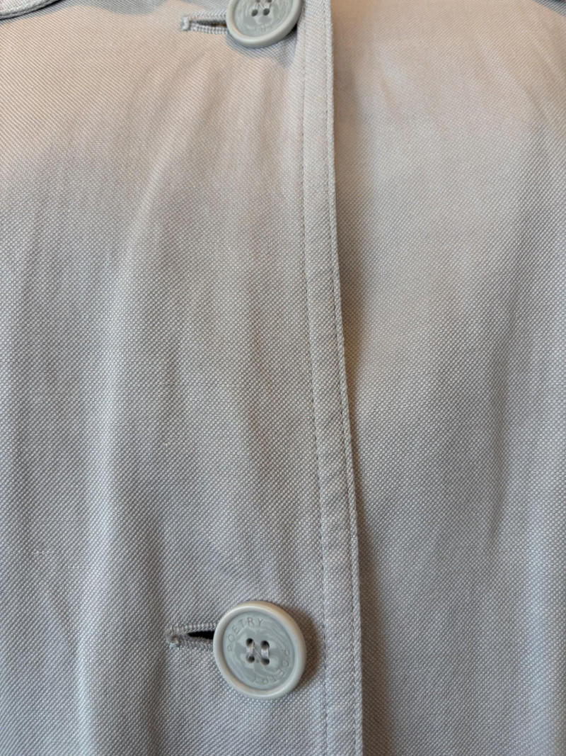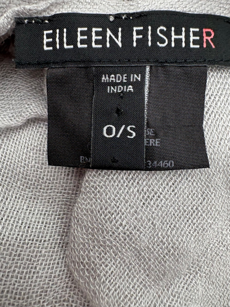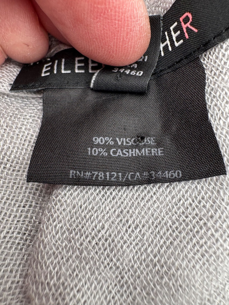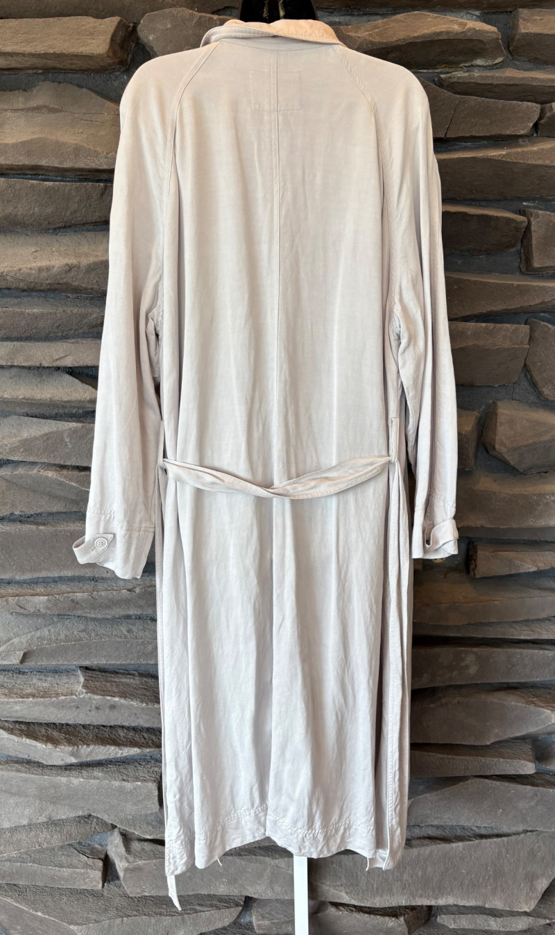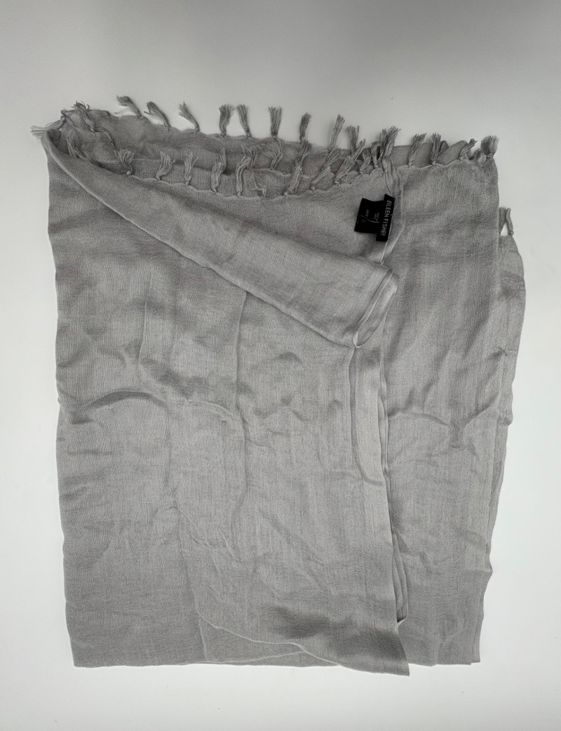 Stunning silvery-grey long jacket from Poetry. Jacket has 5 button front closure, long sleeves with adjustable button strap closure, French darts, welted slash pockets in aforementioned darts, 2-piece sleeve construction, split hem, and tie belt (interior of coat is finished with Hong Kong seaming). Viscose/rayon/linen blend gives it a great hand & heft. Measures 27.5" pit to pit and 45" from back neckline to hem. Size tag says 18. Please note - when photographing, we noticed a small light streak across the upper right shoulder - see last photo - but we didn't see it in normal lighting until then. Paired with Eileen Fisher scarf of same silvery grey. Measures approx. 28" x 82". Viscose/cashmere blend.