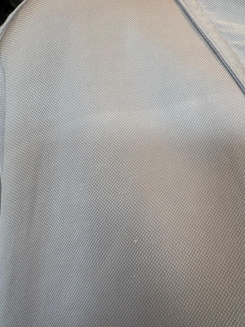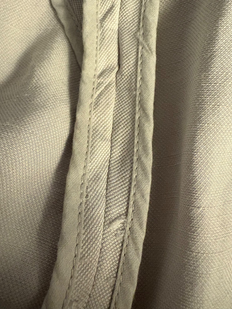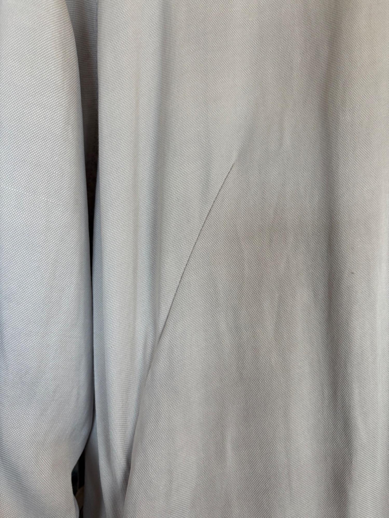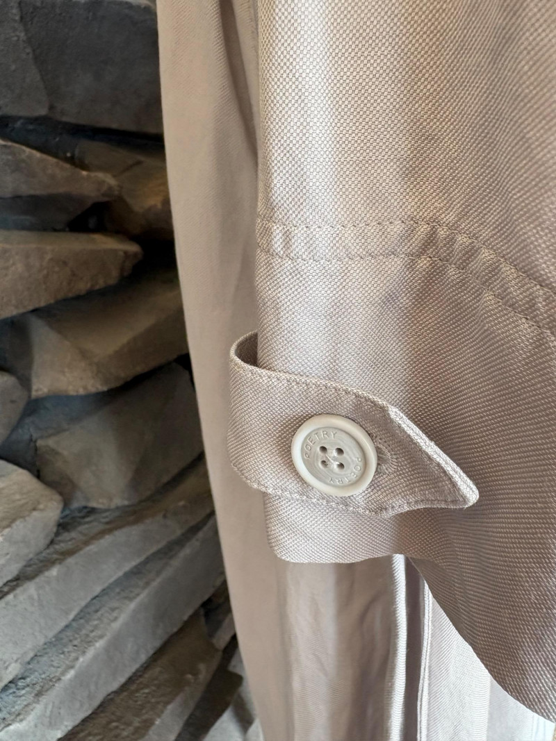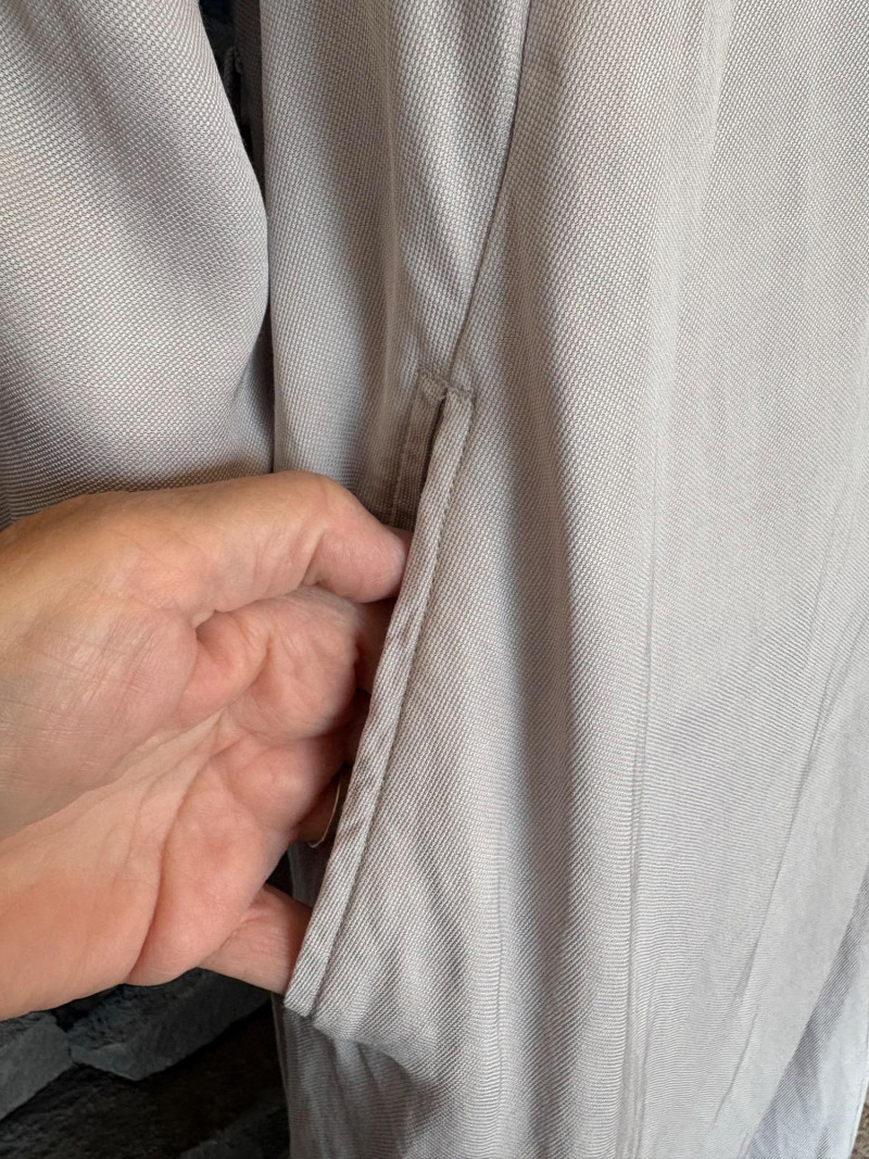 Stunning silvery-grey long jacket from Poetry. Jacket has 5 button front closure, long sleeves with adjustable button strap closure, French darts, welted slash pockets in aforementioned darts, 2-piece sleeve construction, split hem, and tie belt (interior of coat is finished with Hong Kong seaming). Viscose/rayon/linen blend gives it a great hand & heft. Measures 27.5" pit to pit and 45" from back neckline to hem. Size tag says 18. Please note - when photographing, we noticed a small light streak across the upper right shoulder - see last photo - but we didn't see it in normal lighting until then. Paired with Eileen Fisher scarf of same silvery grey. Measures approx. 28" x 82". Viscose/cashmere blend.