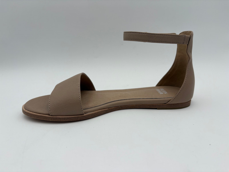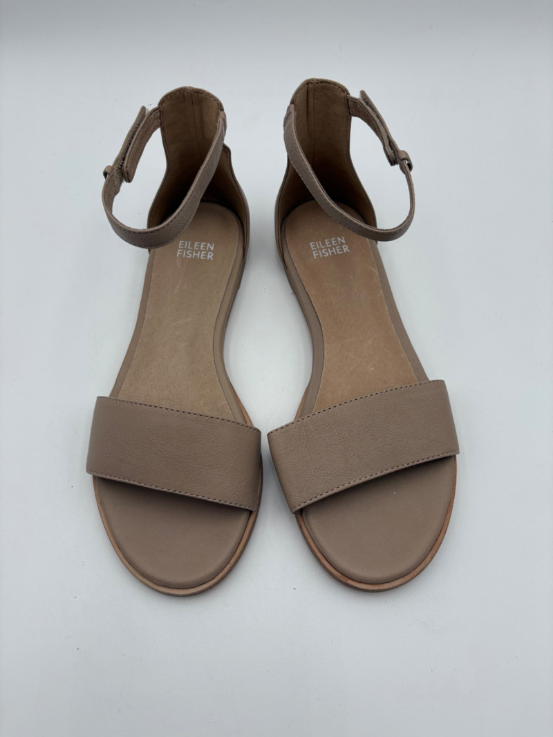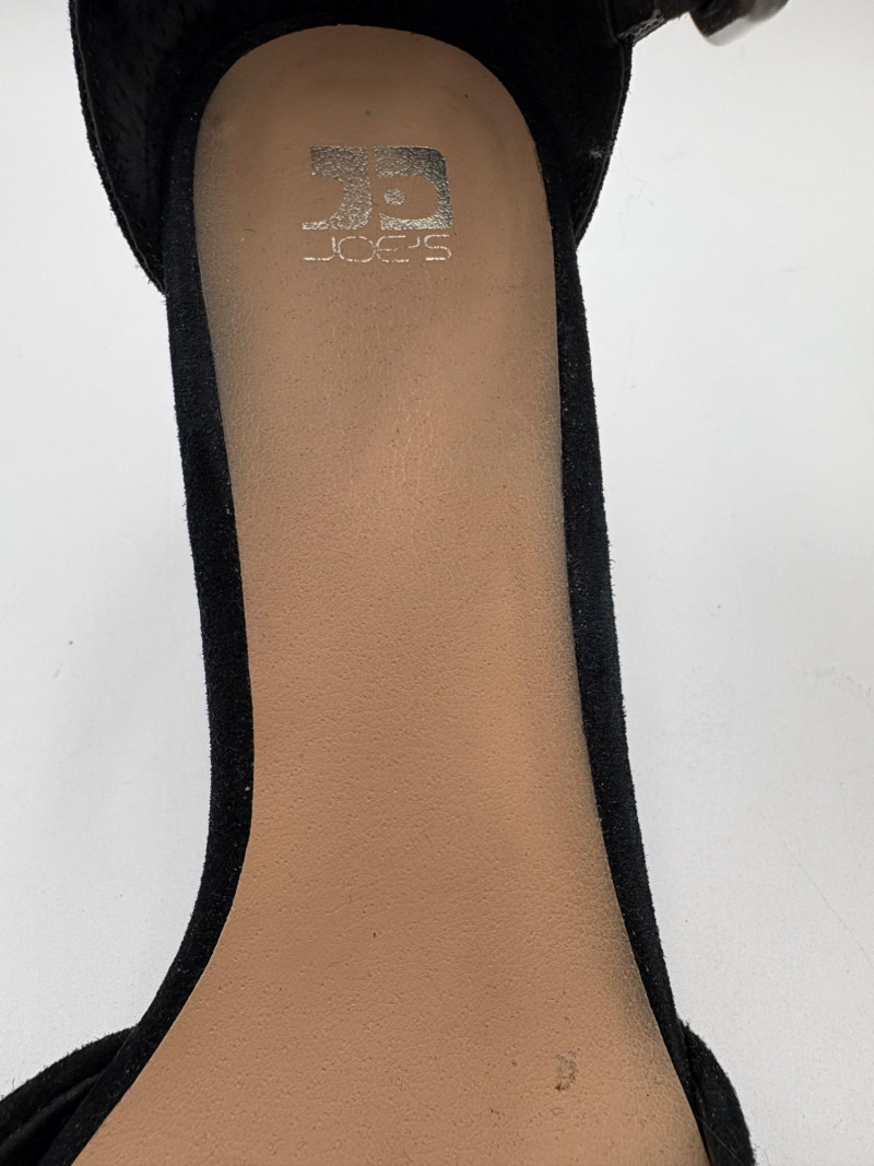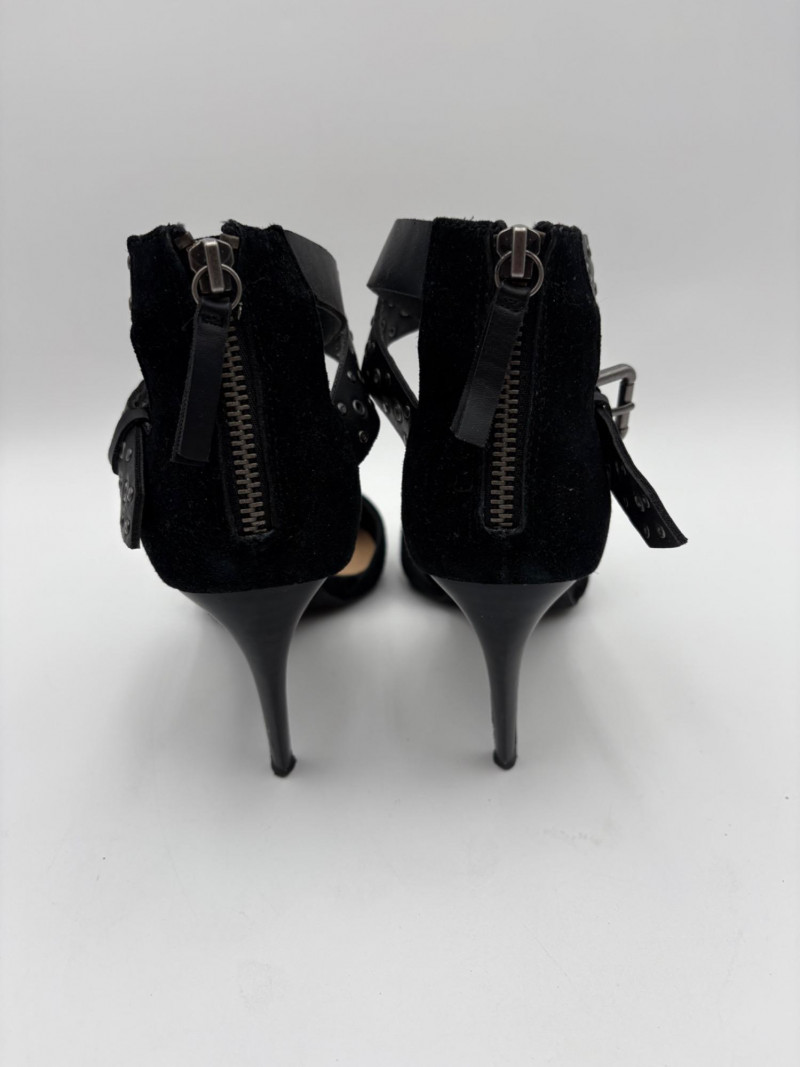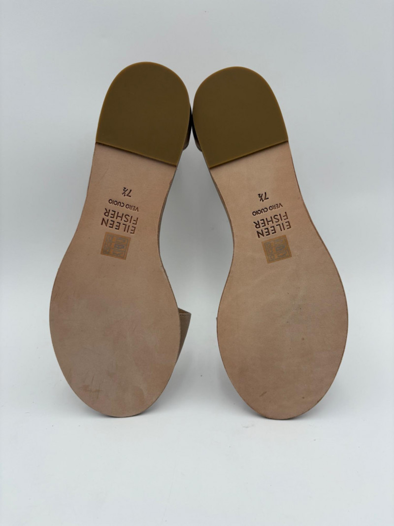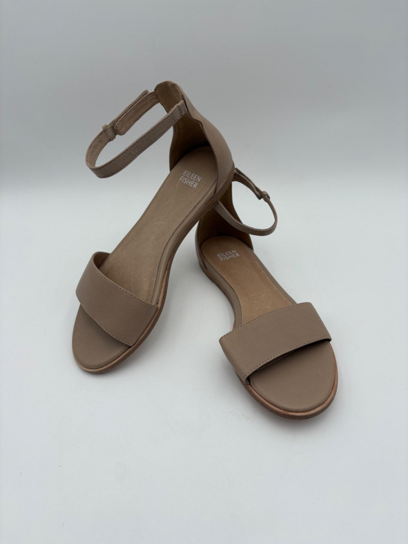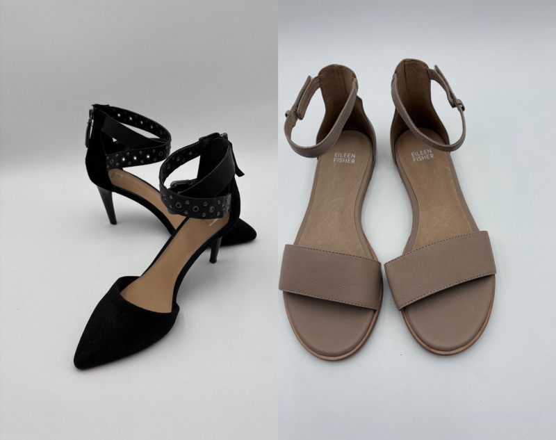 Joe's Jeans black suede spike heels with buckled crisscross ankle strap and back heel zip. Size 7 1/2.. Eileen Fisher beige flat sandals with Velcro ankle closure. Appear to be new. Size 7 1/2.