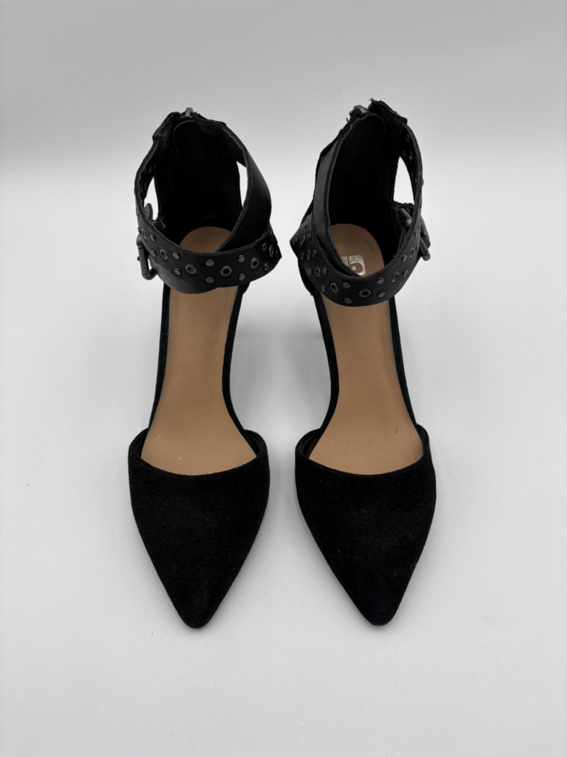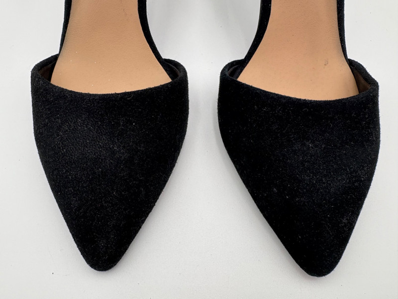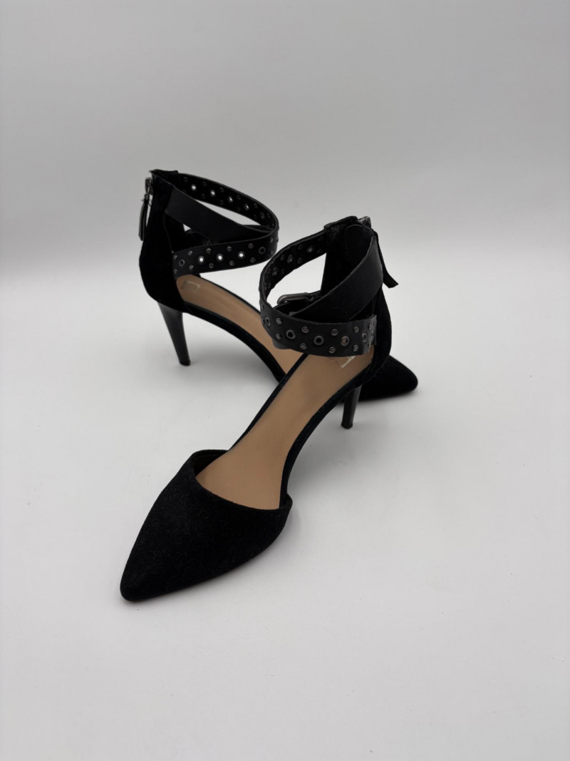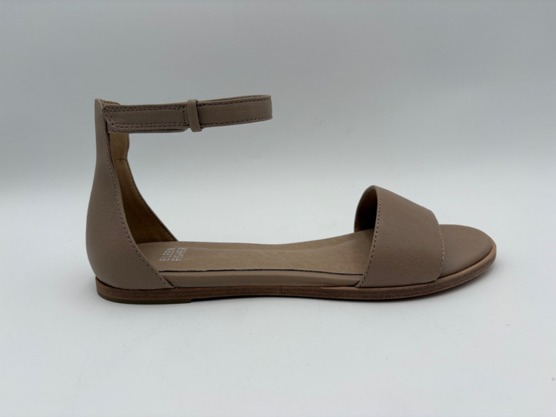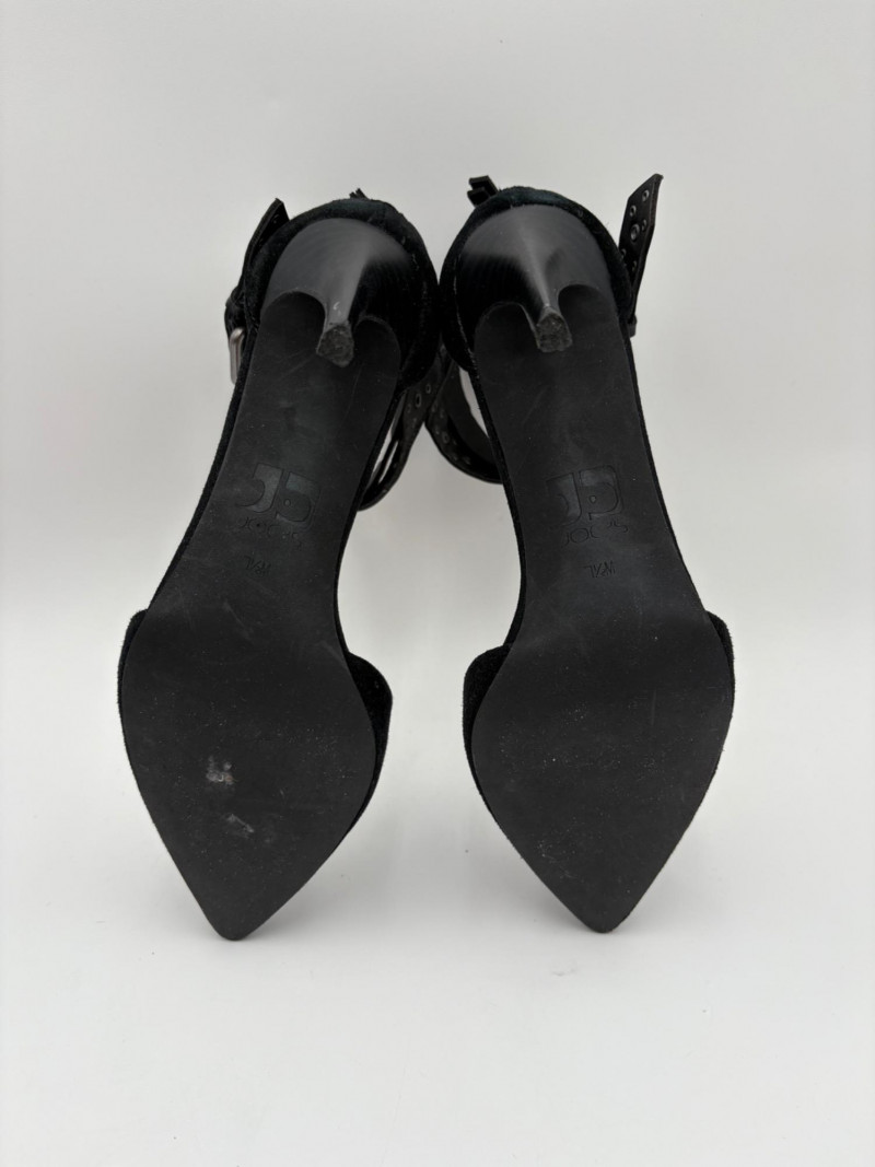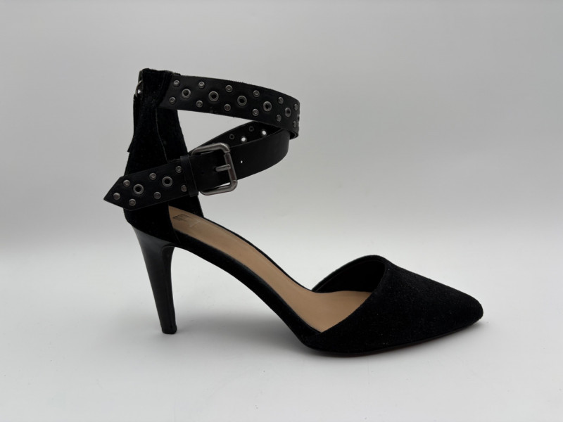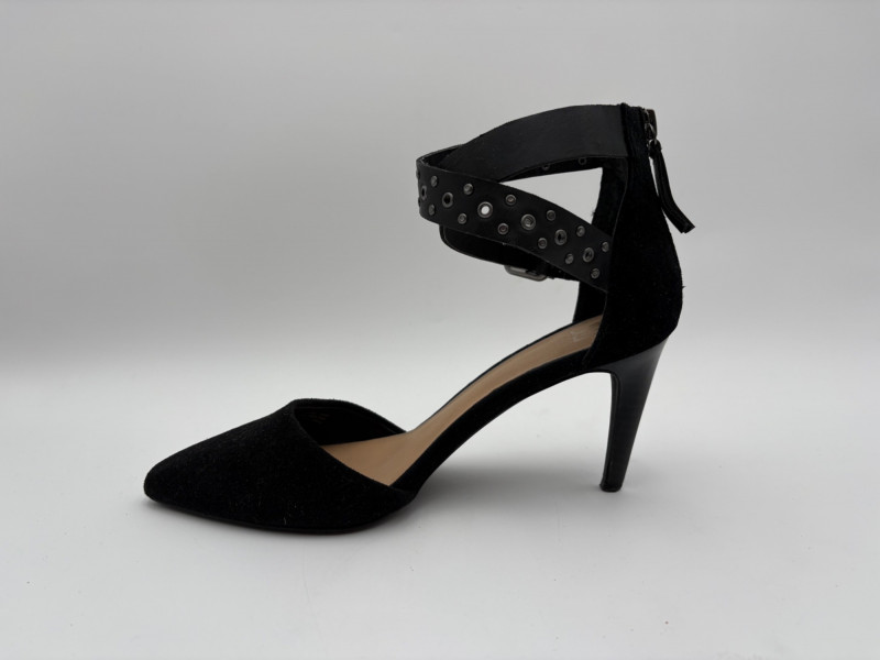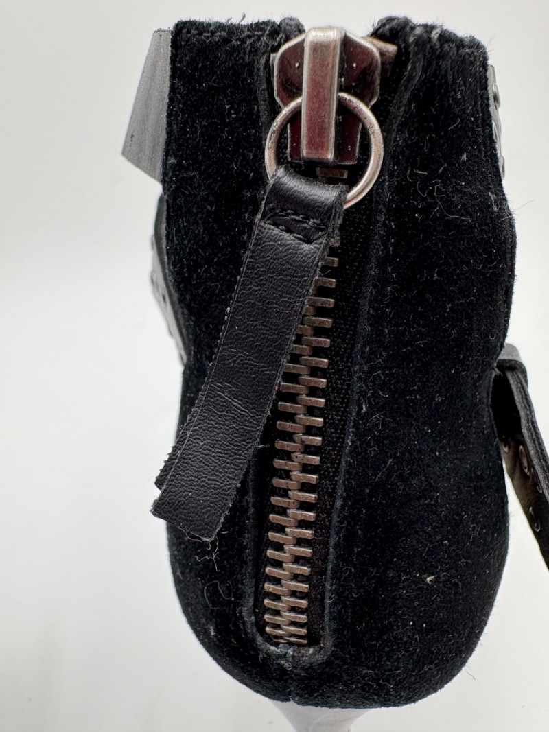 Joe's Jeans black suede spike heels with buckled crisscross ankle strap and back heel zip. Size 7 1/2.. Eileen Fisher beige flat sandals with Velcro ankle closure. Appear to be new. Size 7 1/2.